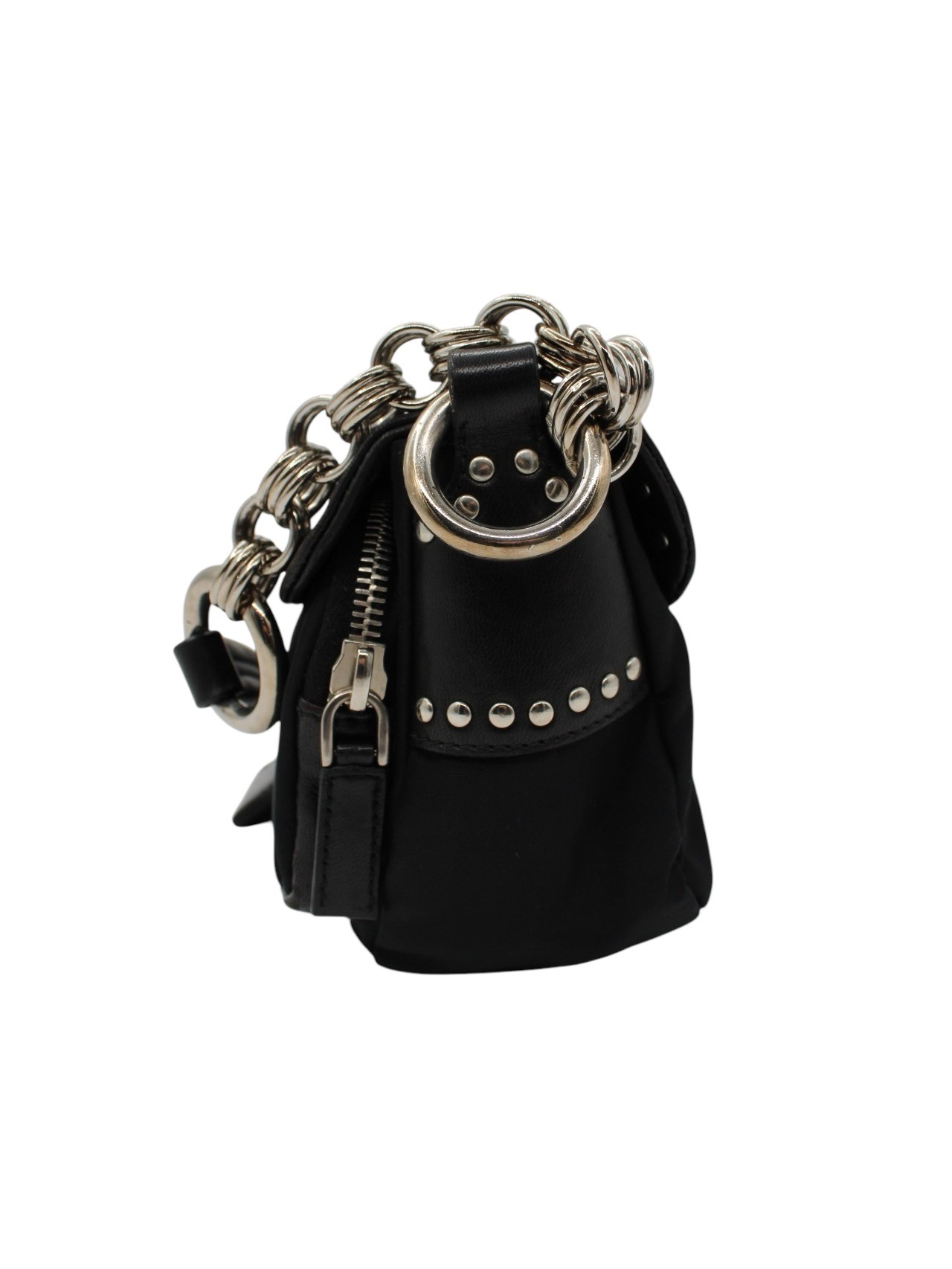 Baguette Prada in Pelle e Tela Vela Nera con dettagli metallici argentati. Da portare a spalla con outfit casual e grintosi, questa borsa è perfetta per tutti i giorni. Articolo in ottime condizioni corredato di card e cartellini.