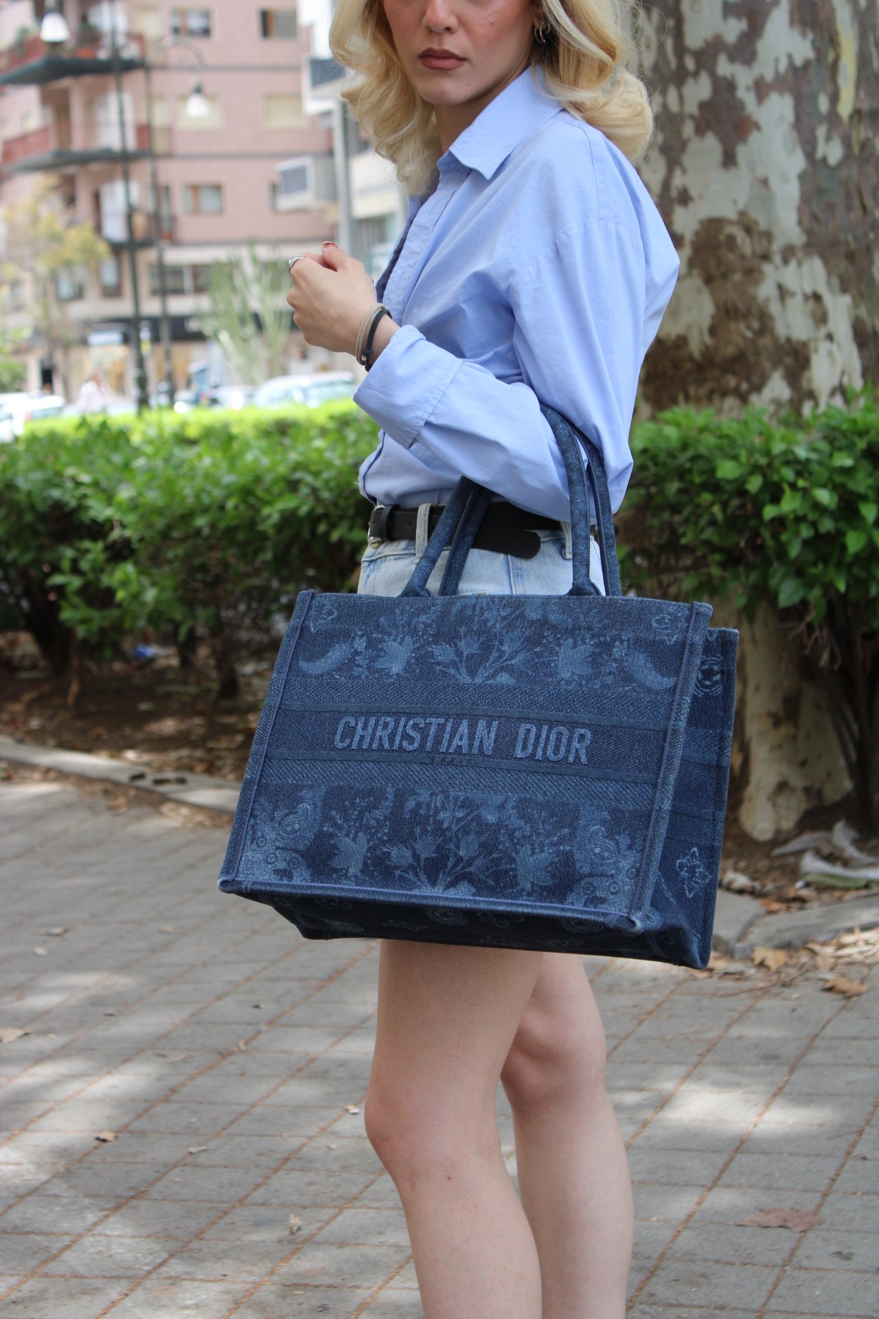 Borsa Dior Tote Book in denim blu media. Borsa da portare a mano capace di adattarsi ad outfit casual e giornalieri. Articolo in condizioni ottime corredato di dust bag e cartellini