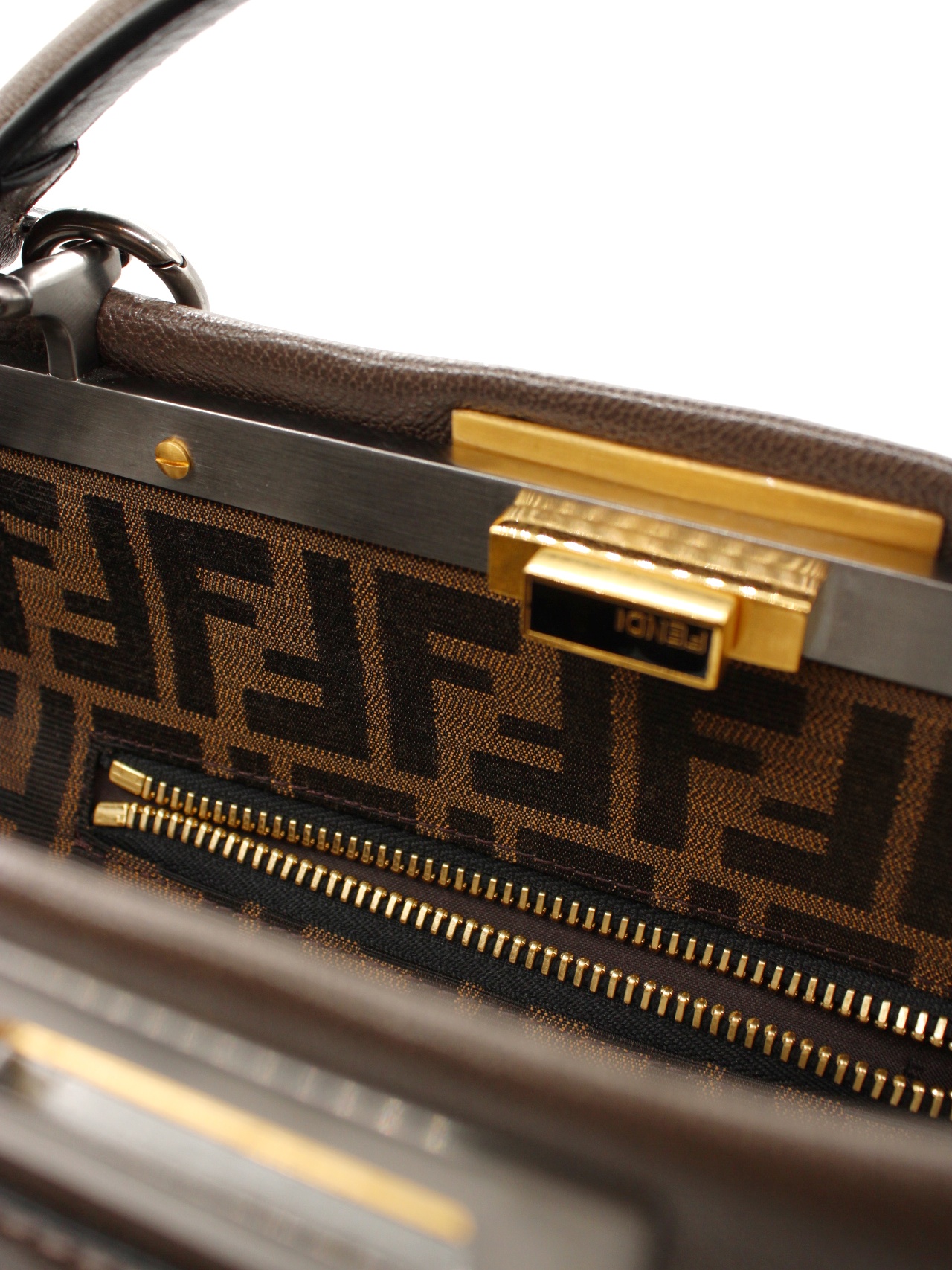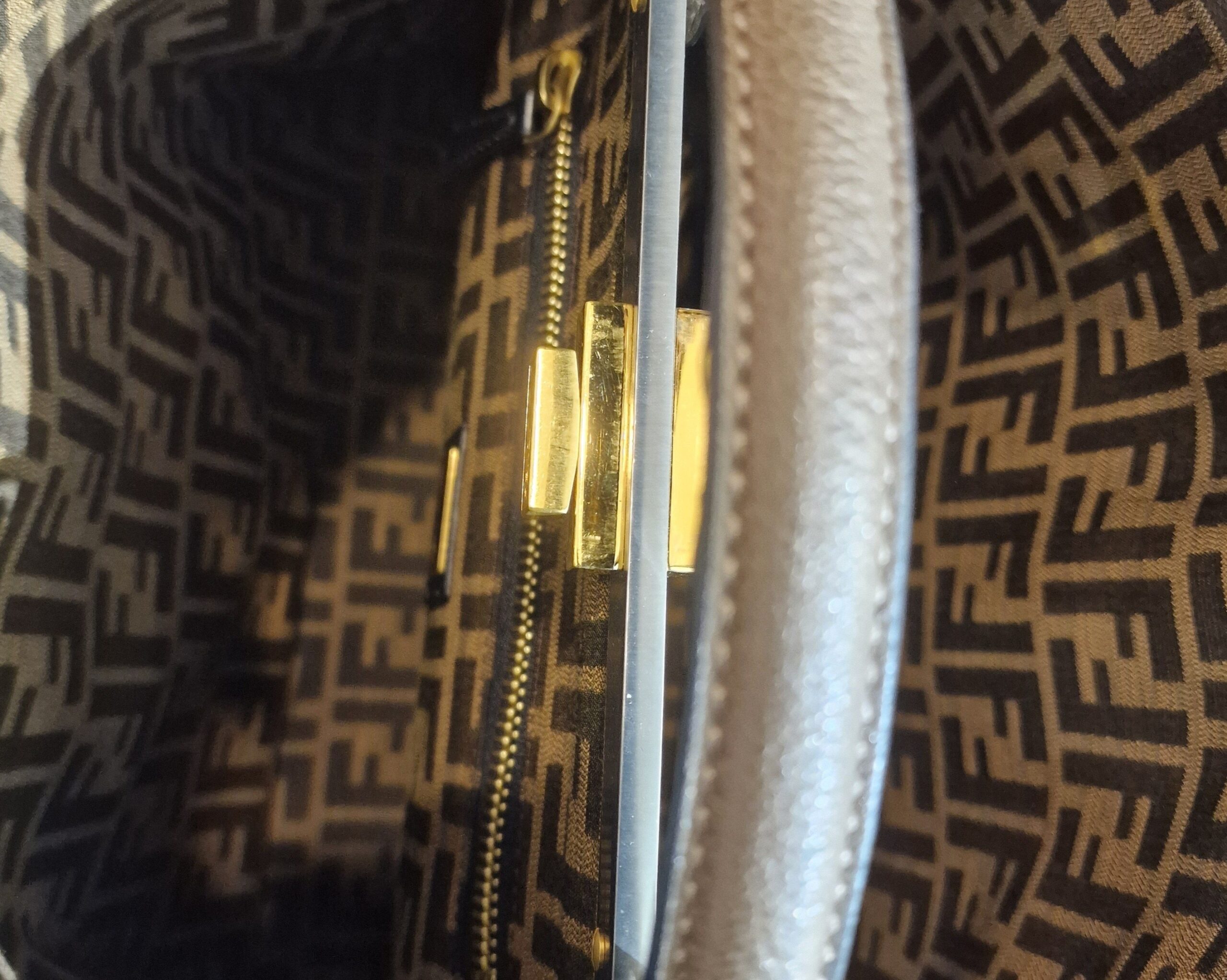 Borsa Fendi Peekaboo con parti metalliche dorate. Da portare a mano oppure a spalla grazie alla sua tracolla amovibile. Borsa perfetta per tutti i giorni rendendo speciale anche il più semplice degli outfit. Articolo in condizioni ottime corredato di dust bag.