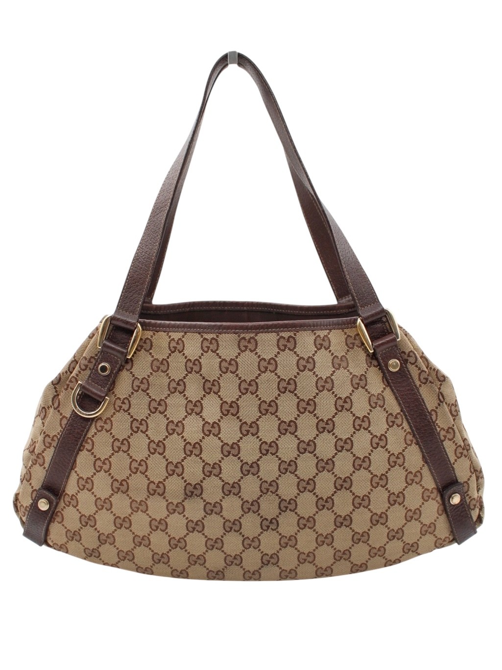 Borsa Gucci Abbey in Tessuto GG con dettagli metallici dorati. Borsa da portare a spalla perfetta per tutti i giorni abbinandosi ad outfit casual. Articolo in ottime condizioni e corredato di dust bag Très Chic.