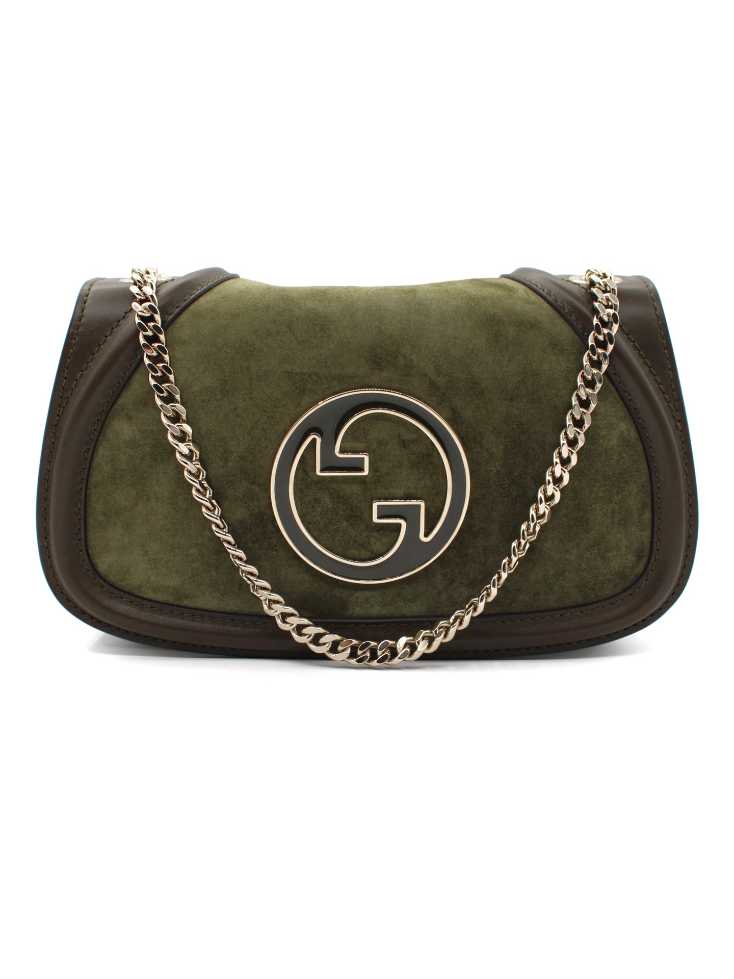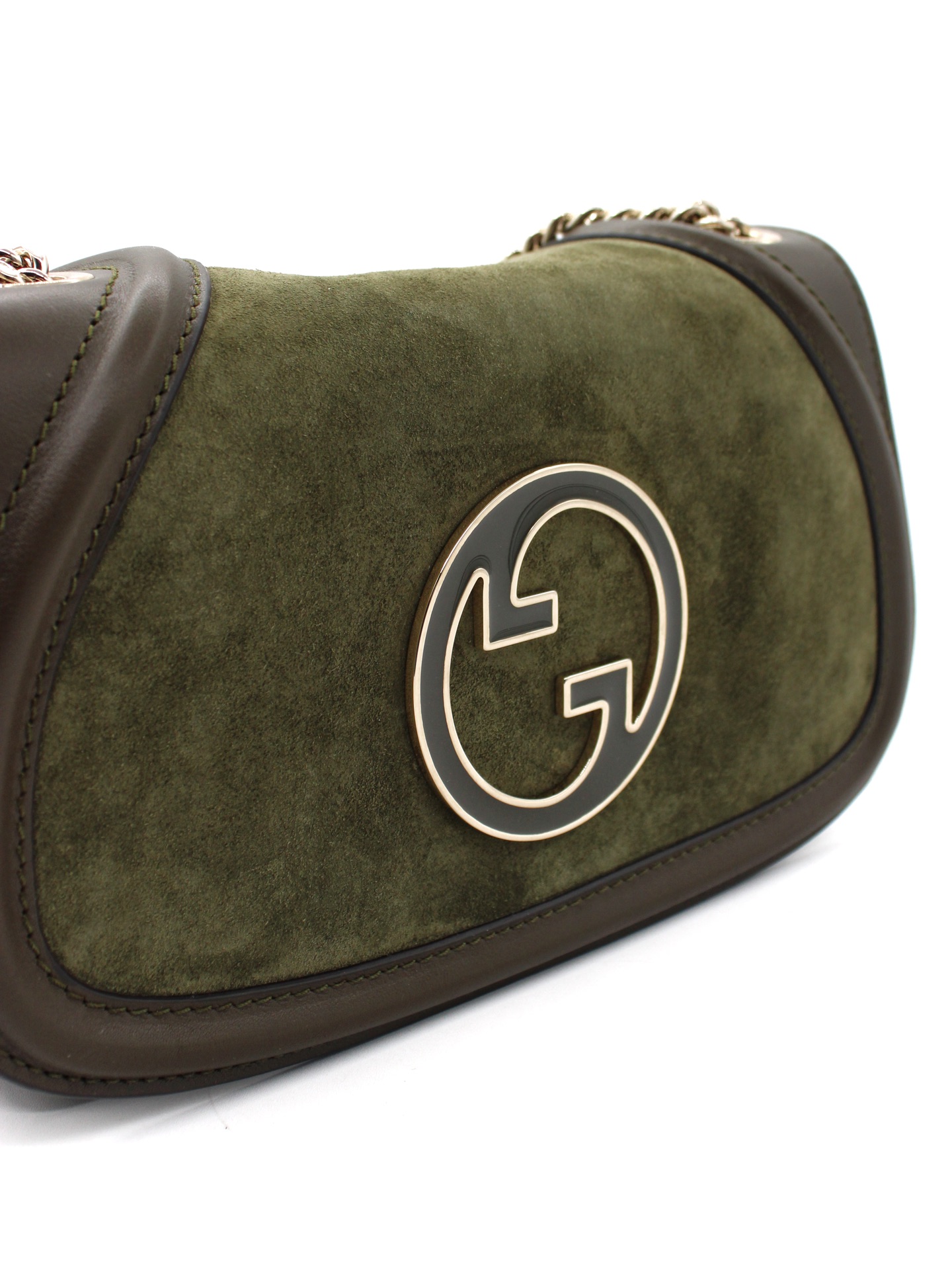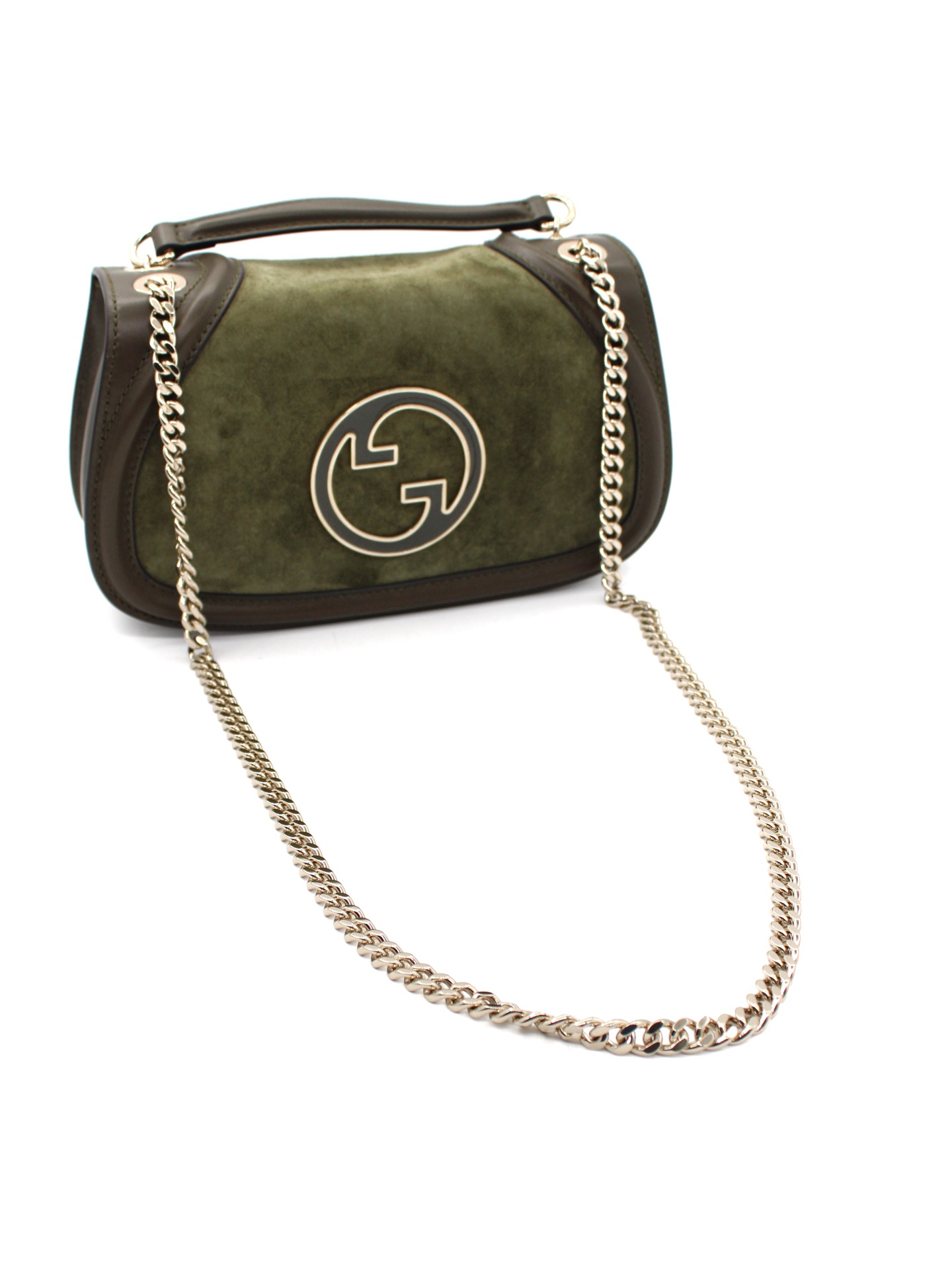 Borsa Gucci Blondie Small in Pelle Scamosciata Verde con parti metalliche platino. Da portare a spalla o ad incrocio grazie alla sua catena scorrevole, questa borsa si abbina ad outfit giornalieri. Articolo pari al nuovo corredato di dust bag e cartellini.