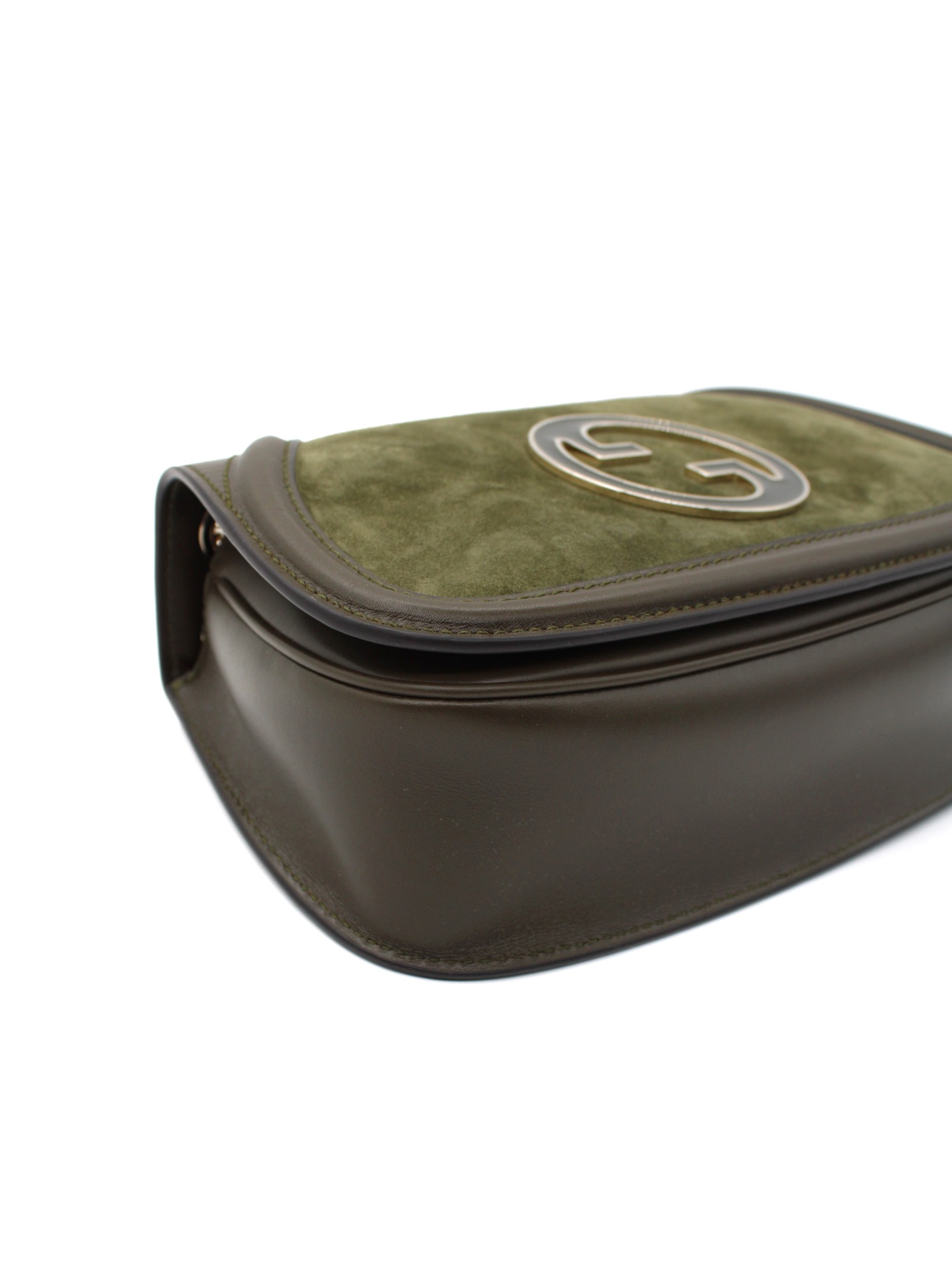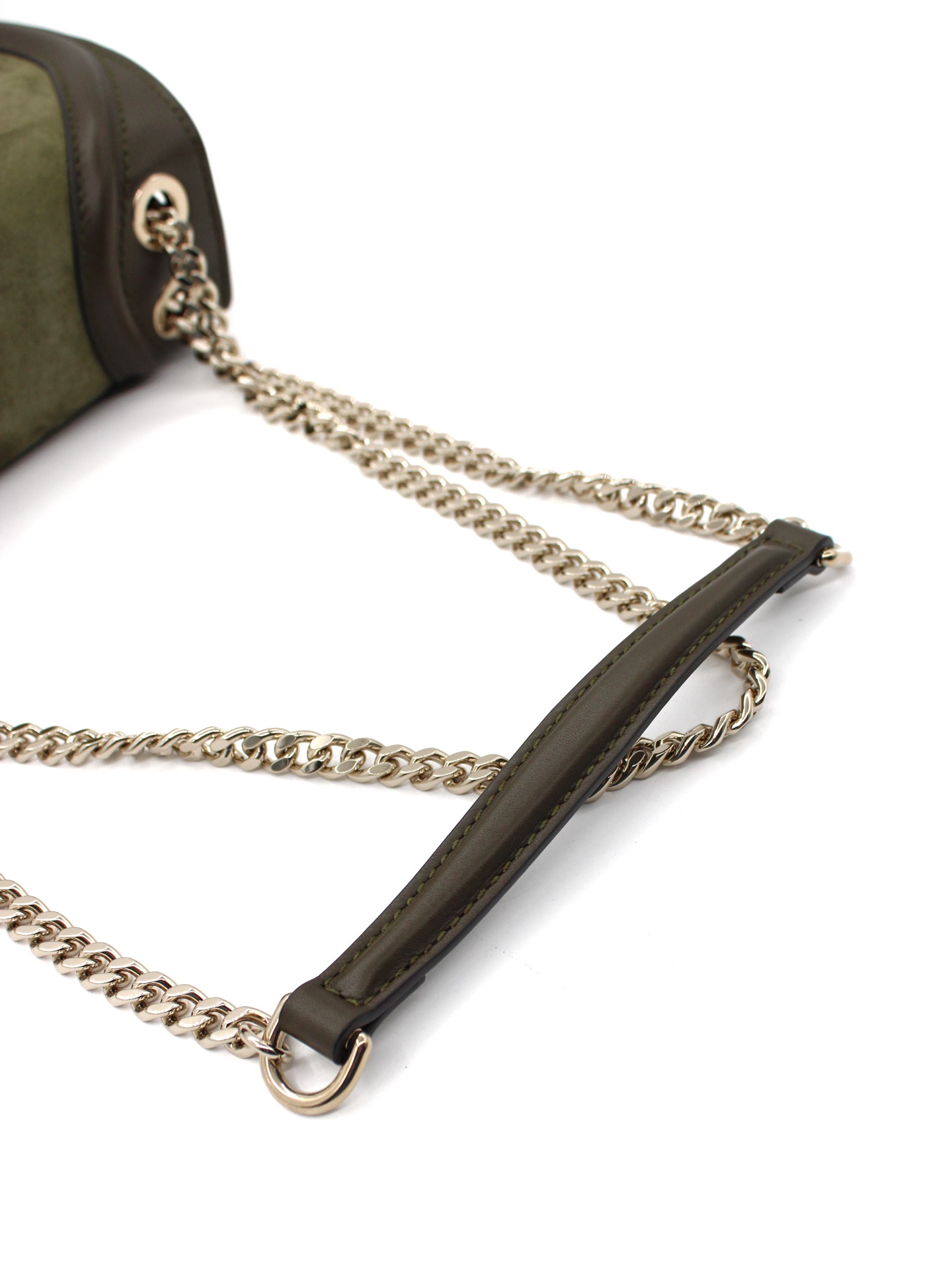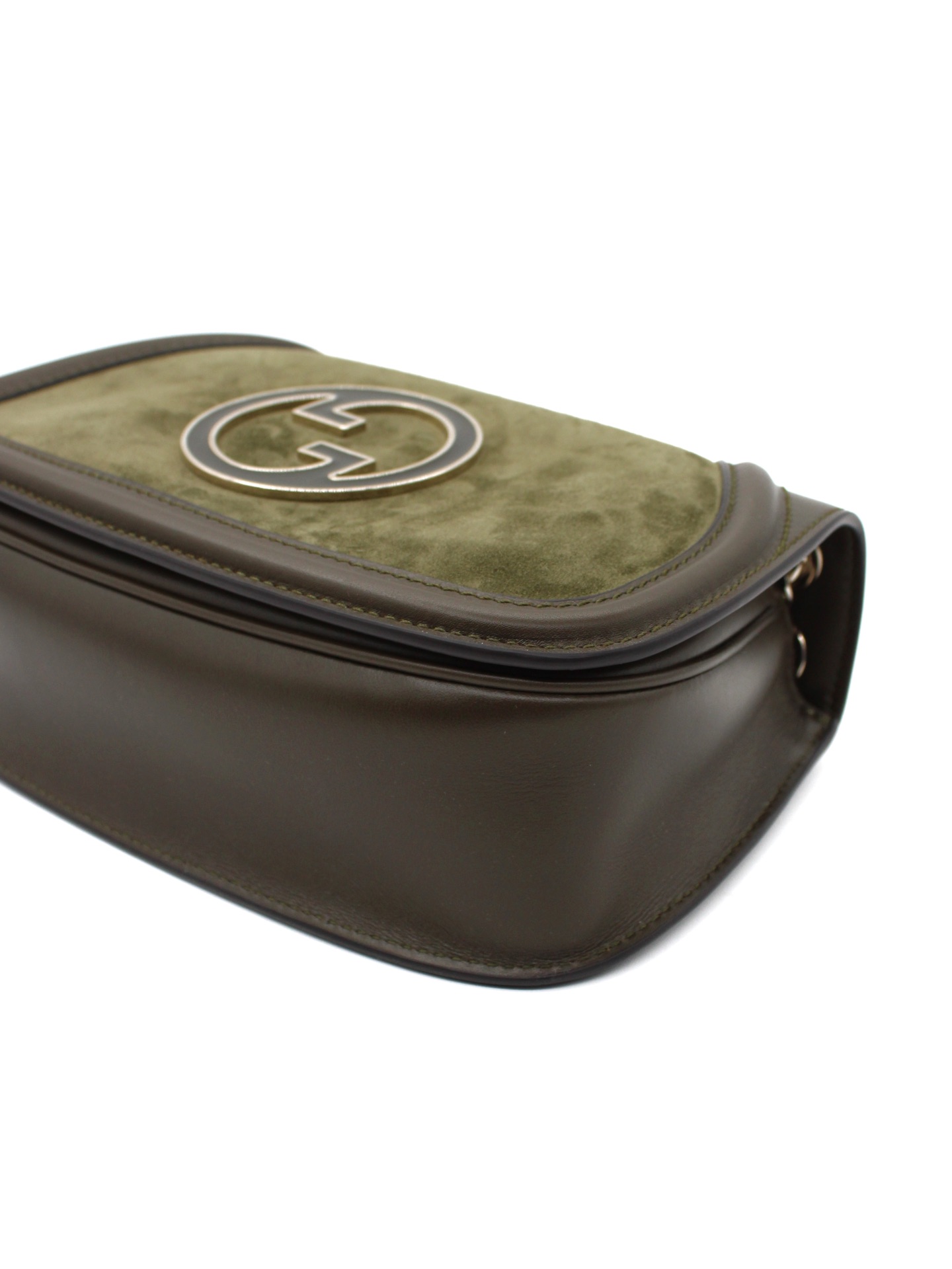 Borsa Gucci Blondie Small in Pelle Scamosciata Verde con parti metalliche platino. Da portare a spalla o ad incrocio grazie alla sua catena scorrevole, questa borsa si abbina ad outfit giornalieri. Articolo pari al nuovo corredato di dust bag e cartellini.