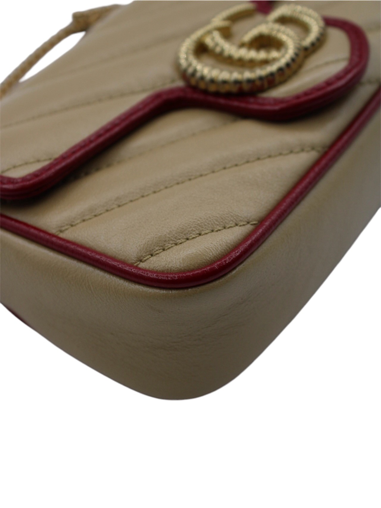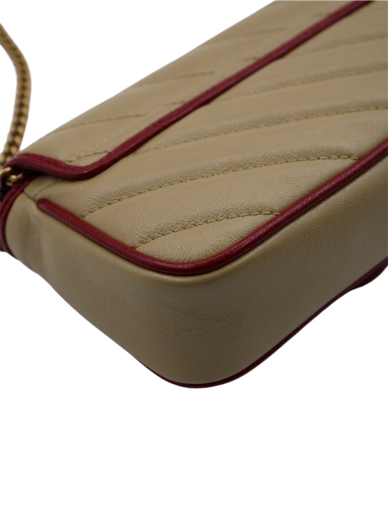 Borsa Gucci Mini GG Marmont Chevron con parti metalliche dorate. Da portare a spalla oppure ad incrocio, questa borsa è perfetta sia per il giorno che per la sera. Articolo pari al nuovo corredato di scatola e cartellini.