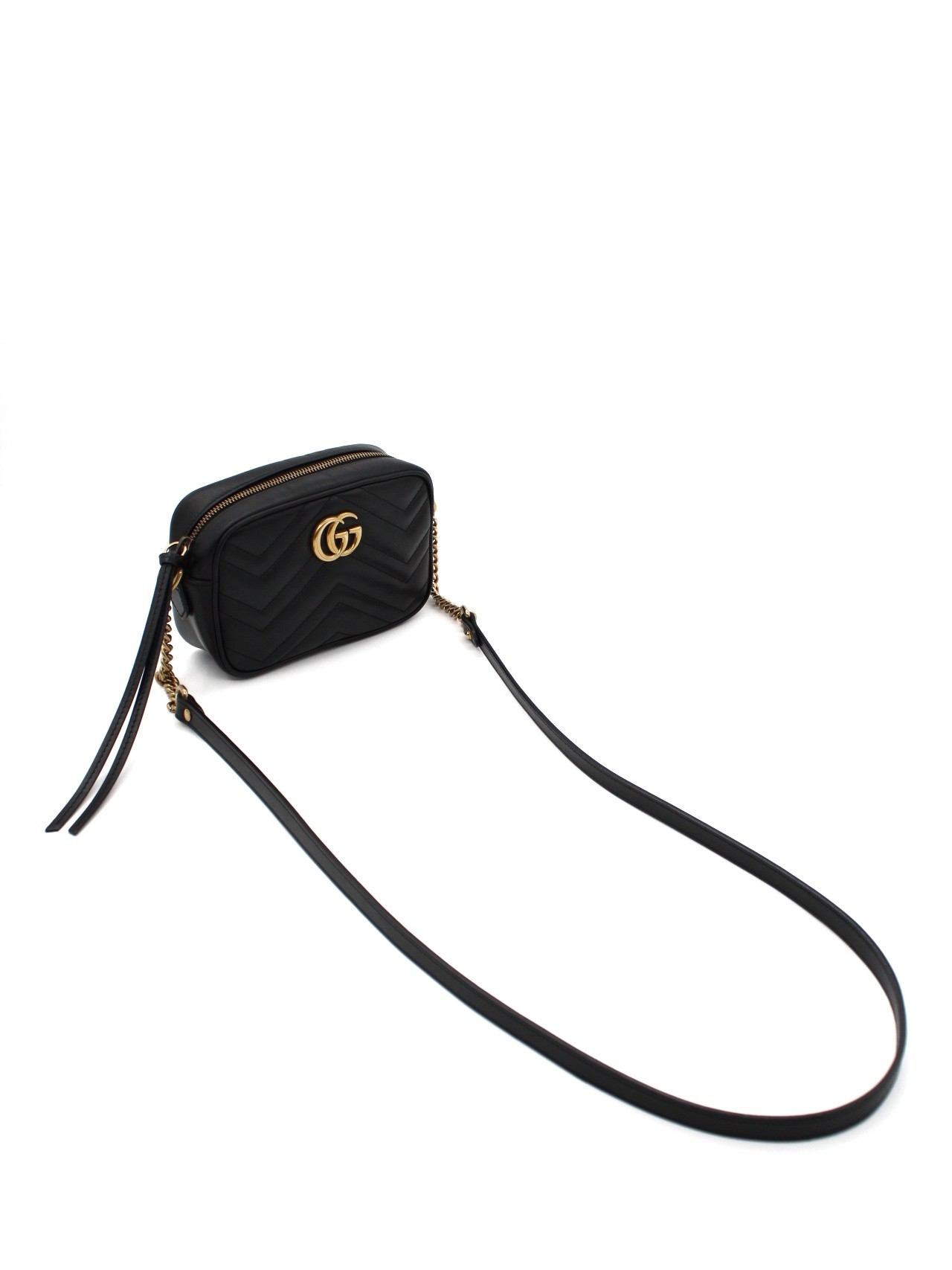 Borsa Gucci Mini Marmont in pelle nera e parti metalliche dorate. Da portare a spalla questa borsa è perfetta sia per il giorno che per la sera. Articolo in ottime condizioni, si evidenzia macchia di biro al suo interno. Corredata di scatola e cartellini.