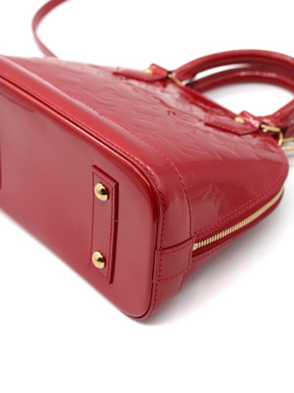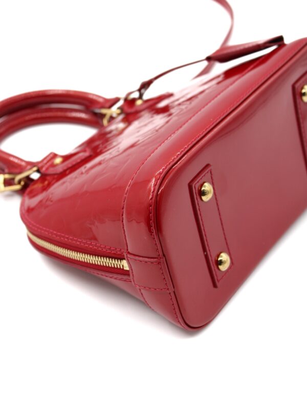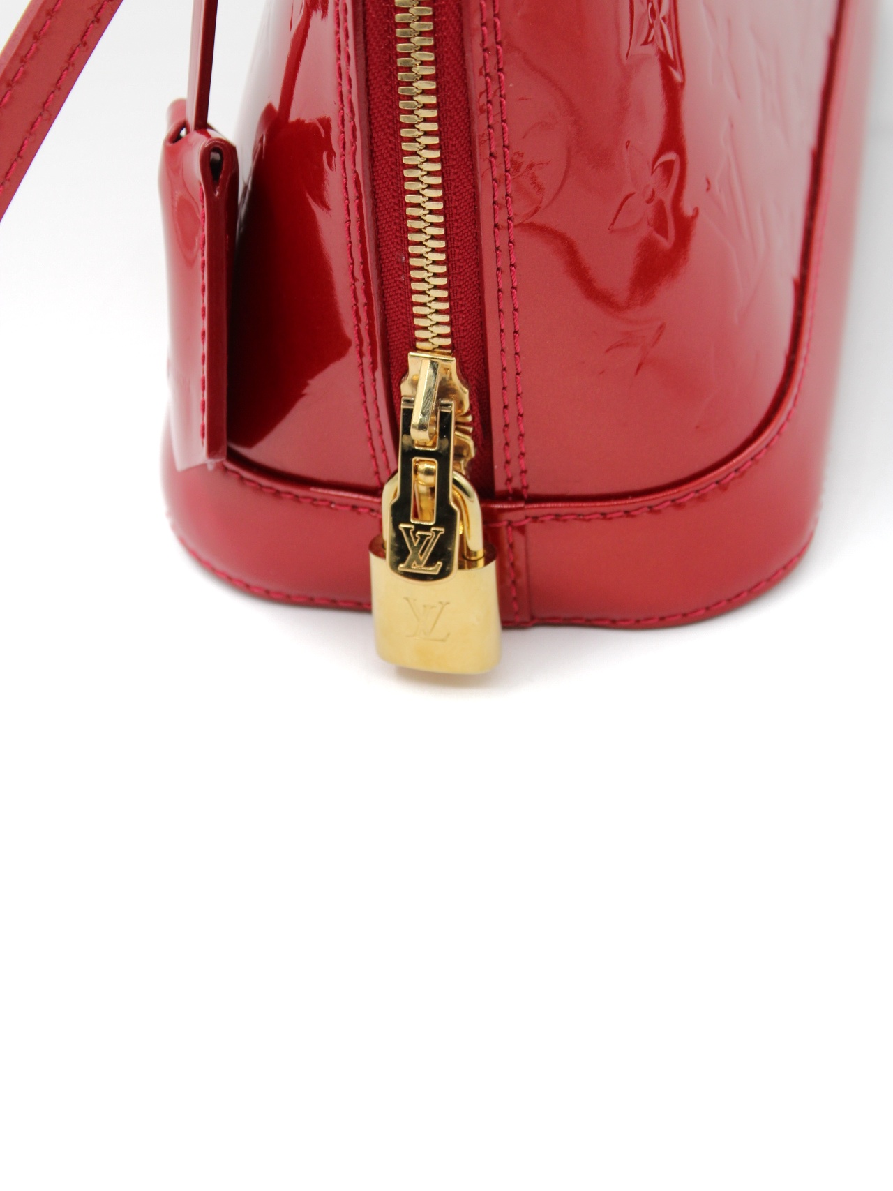 Borsa Louis Vuitton Alma BB in vernis rossa e parti metalliche dorate. Da portare a mano oppure a spalla grazie alla sua tracolla amovibile questa borsa è perfetta per occasioni speciali con look ricercati. Articolo in condizioni eccellenti con dust bag.