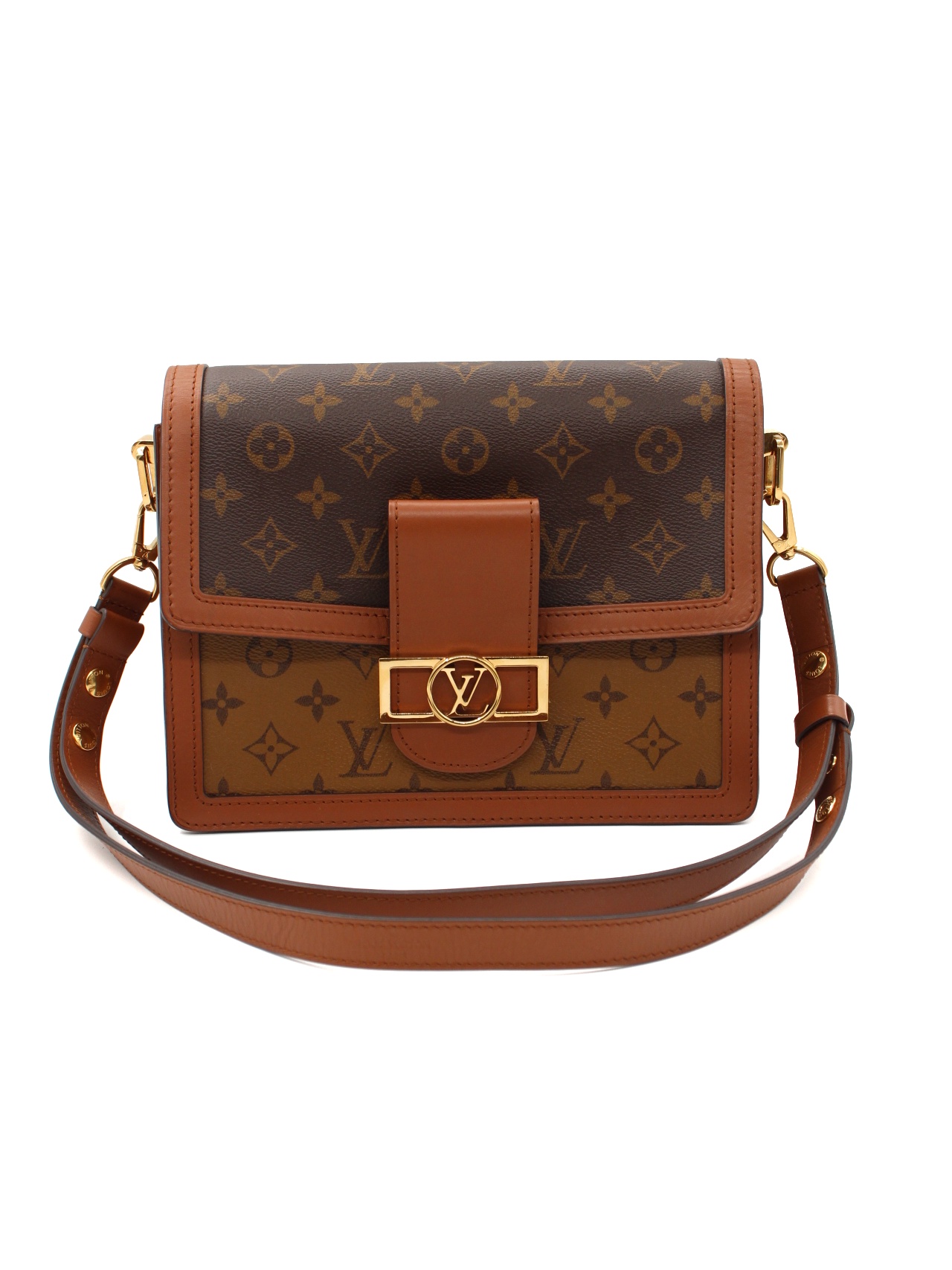 Borsa Louis Vuitton Dauphine Reverse in tela canvas e pelle con parti metalliche dorate. Da portare a spalla oppure ad incrocio grazie alla sua tracolla regolabile e amovibile. Borsa versatile capace di rendere speciale anche il più semplice degli outfit. Articolo in condizioni eccellenti con scatola e certificato Entrupy.