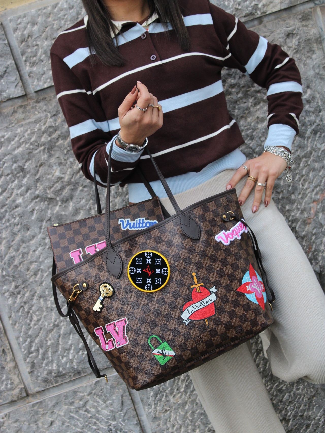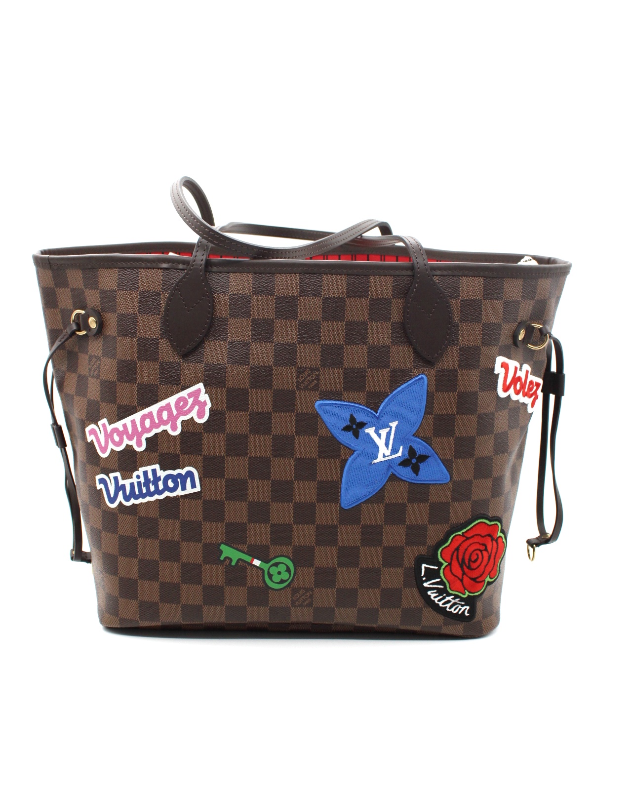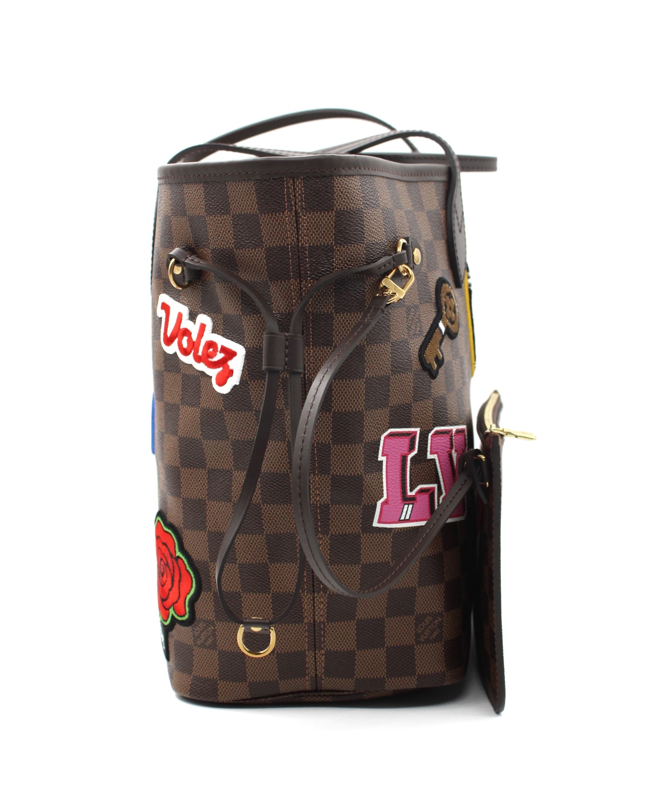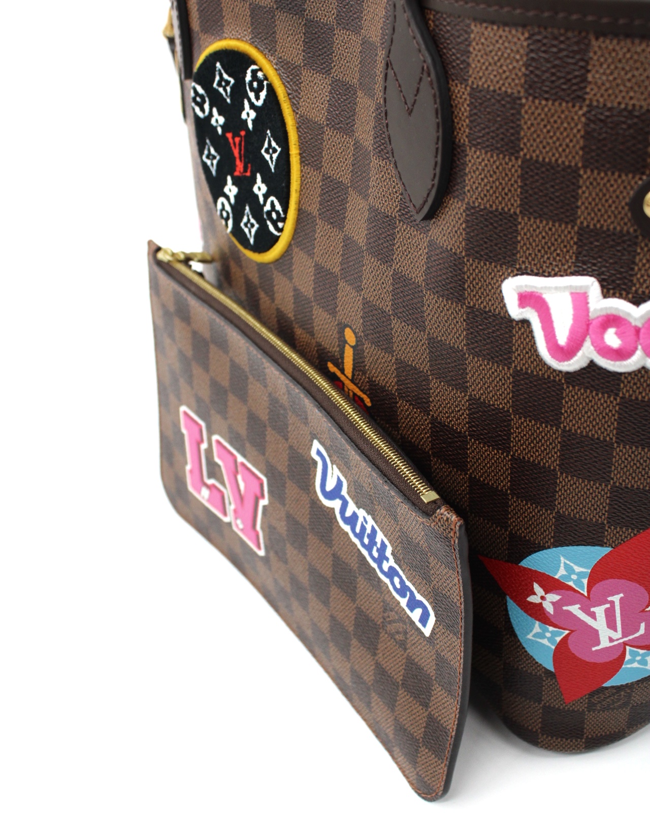 Borsa Louis Vuitton Neverfull con toppe edizione limitata con parti metalliche dorate. Da portare a spalla questa borsa è perfetta per tutti i giorni con outfit casual. Articolo in eccellenti condizioni completo di dust bag