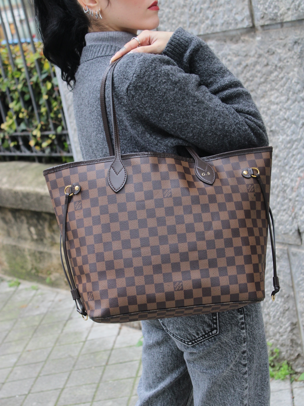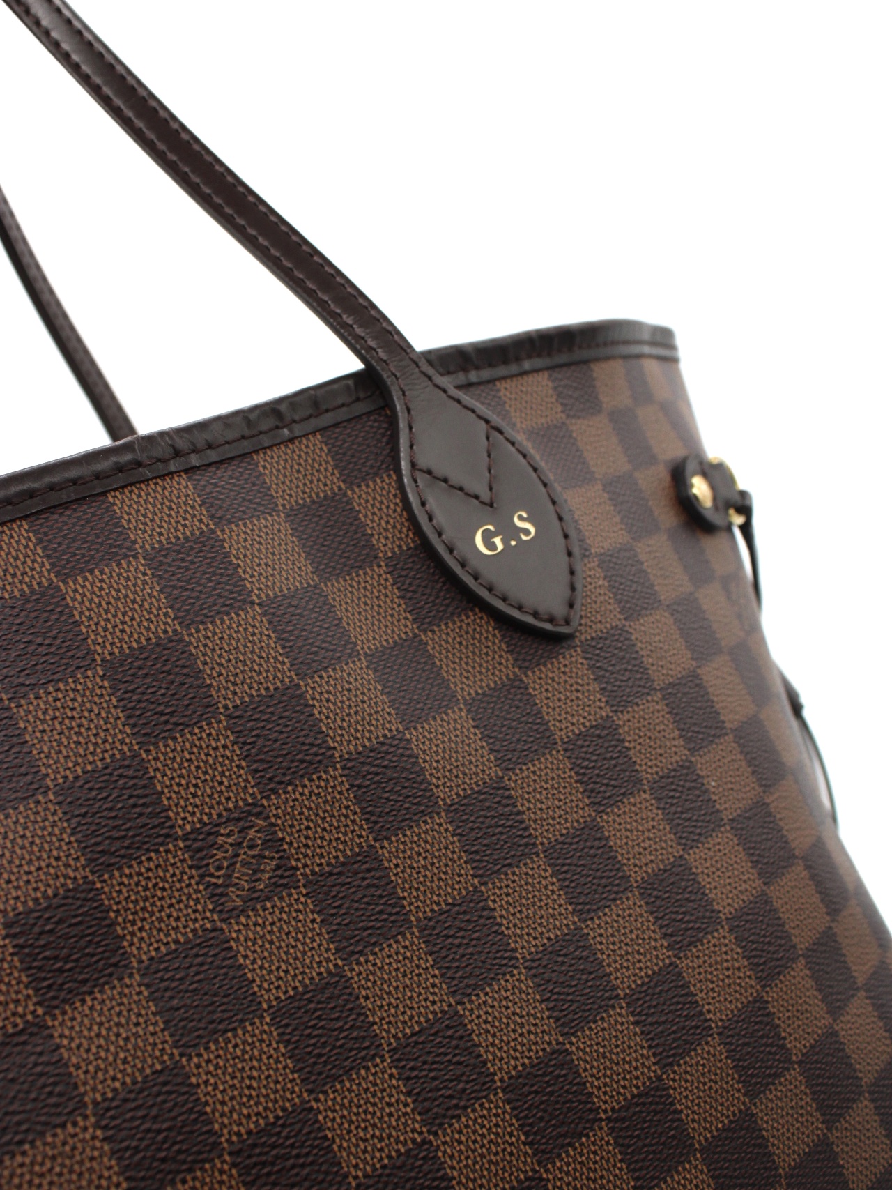 Borsa Louis Vuitton Neverfull MM in damier ebene con iniziali G.S