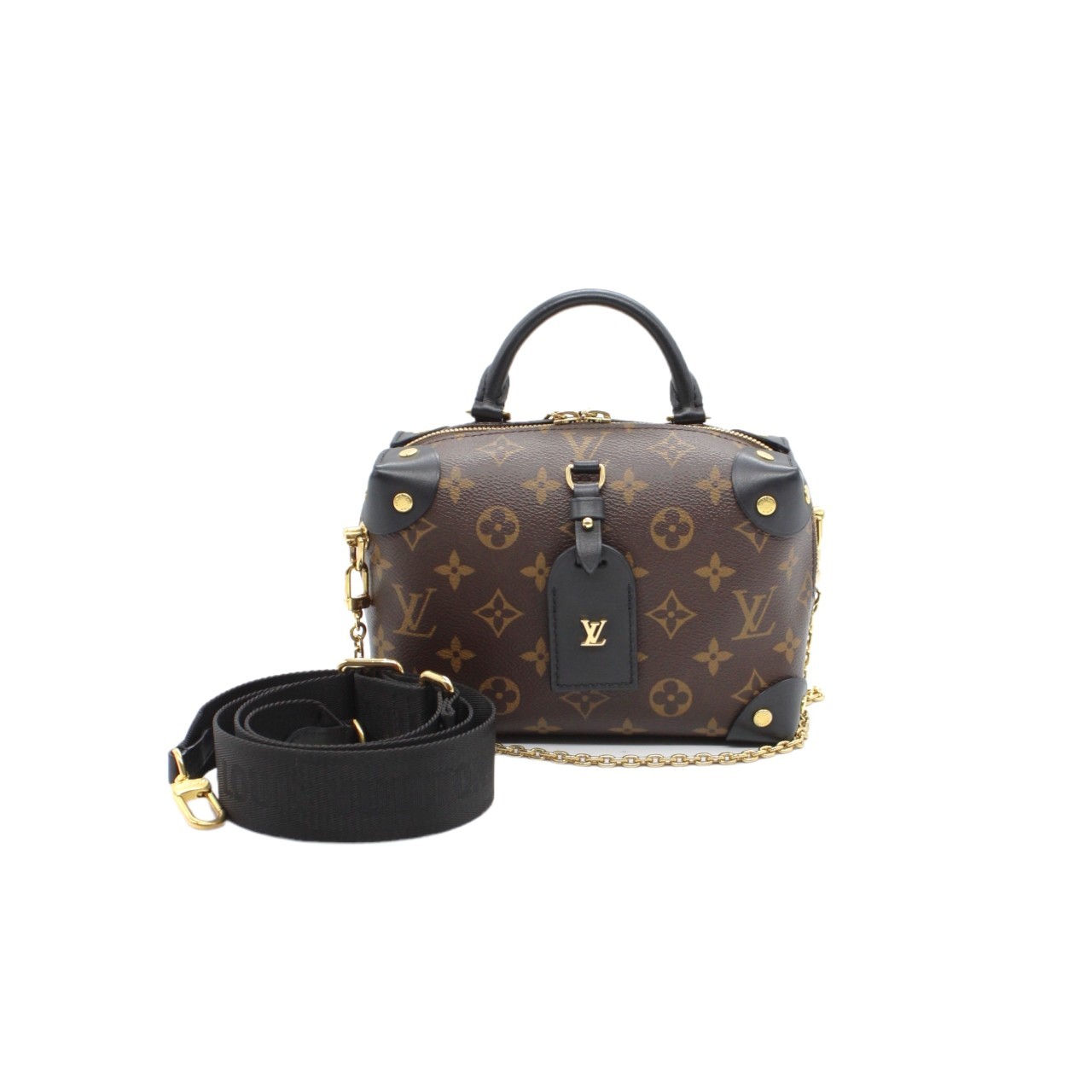 Borsa Louis Vuitton Petite Malle Souple in tela canvas ed inserti in pelle nera con parti metalliche dorate. Può essere indossata in tre diversi modi: a mano, a spalla ed a incrocio grazie alla sua tracolla amovibile e alla catenella dorata. Articolo in condizioni eccellenti con scatola