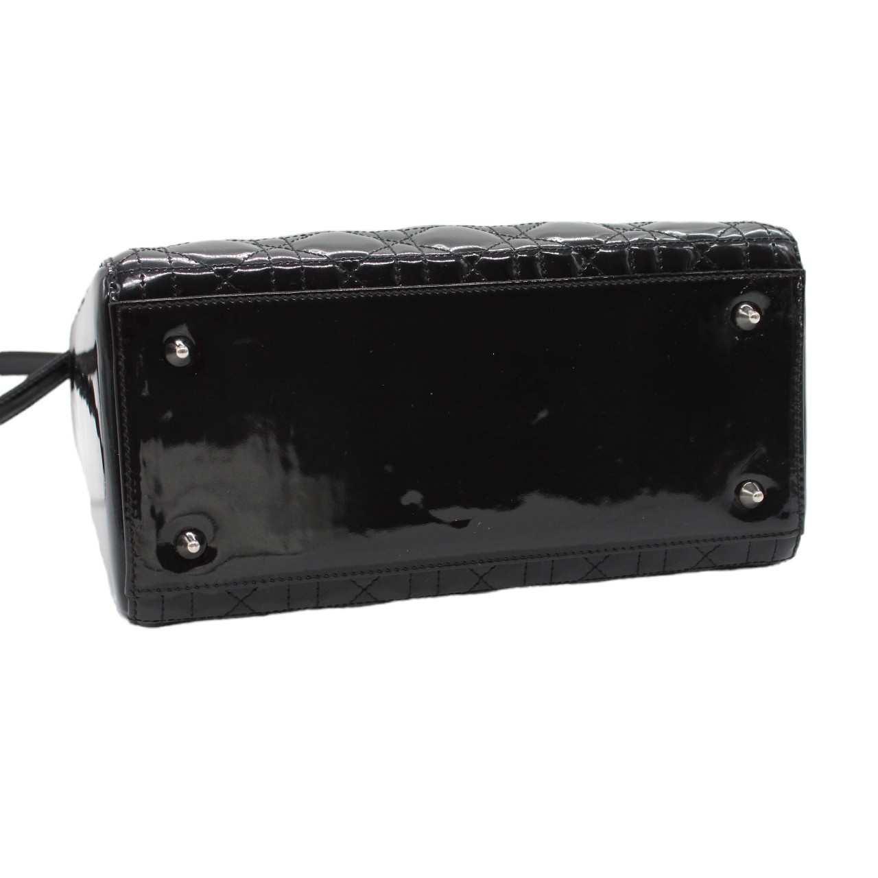 Borsa Lady Dior media in pelle verniciata nera e parti metalliche argentate. Dotata di tracolla amovibile per portarla a mano oppure a spalla. Stile elegante e raffinato e allo stesso tempo originale, questa borsa si abbina per ogni occasione. Articolo in condizioni eccellenti corredato di dust bag.
