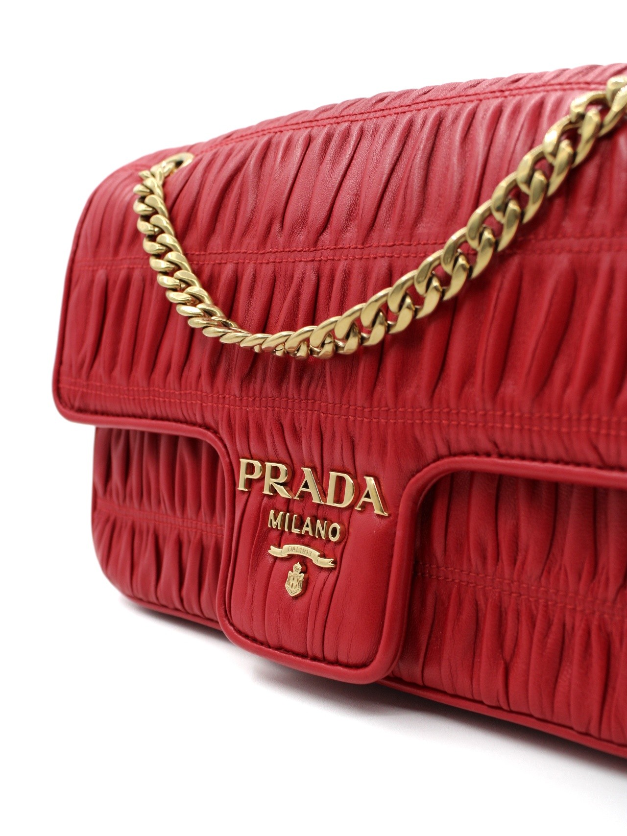 Borsa Prada in Nappa Gaufre rossa e parti metalliche dorate. Da portare a spalla oppure ad incrocio grazie alla sua catena scorrevole. Borsa versatile capace di rendere speciale anche il più semplice degli outfit. Articolo in condizioni eccellenti corredato di dust bag e cartellini.