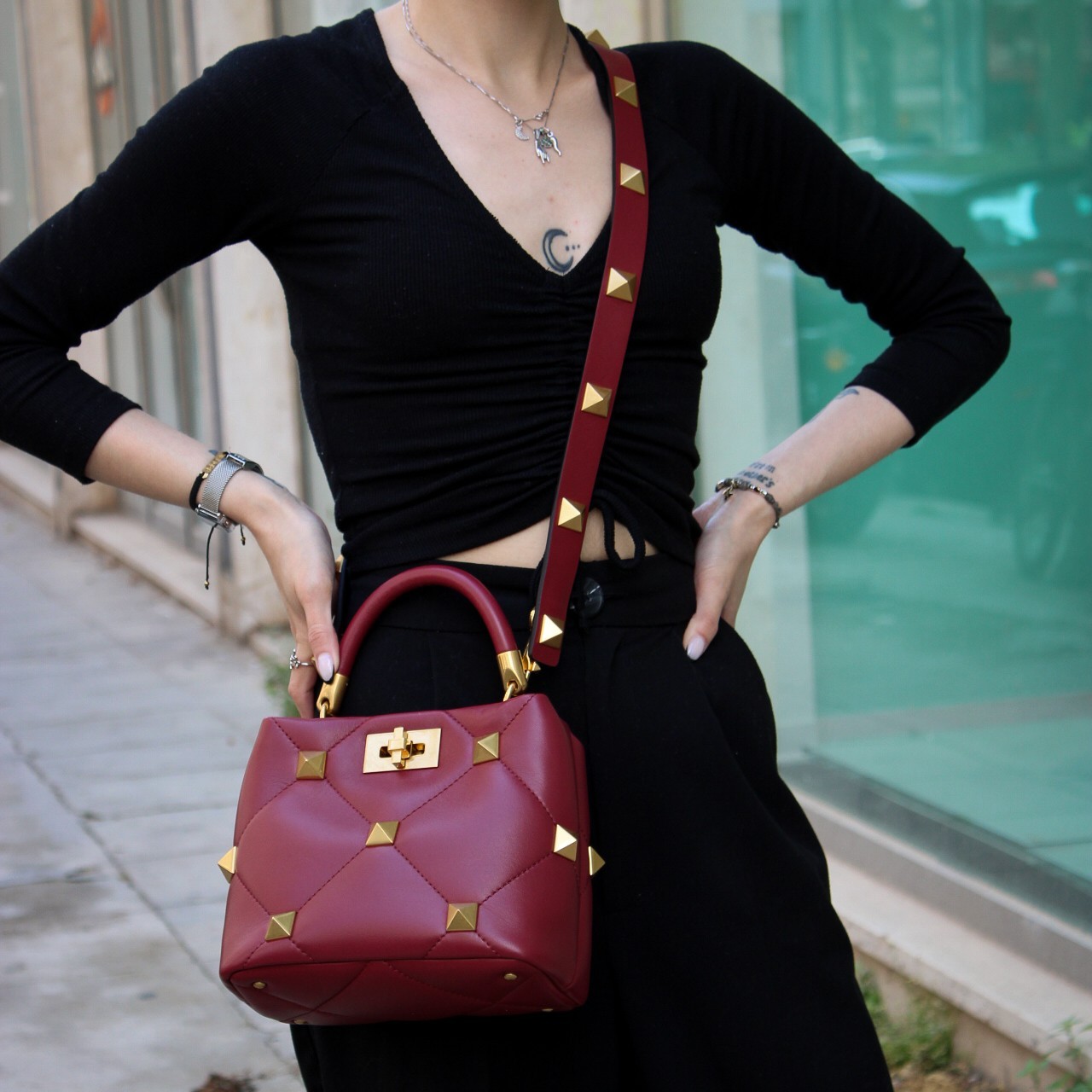 Borsa Valentino Tote roman stud mini in pelle bordeauxe parti metalliche dorate. Caratterizzata dalle sue iconiche borchie questa borsa può essere indossata a spalla, ad incrocio oppure a mano grazie alla catena dorata e alla tracolla borchiata entrambi amovibili. Una borsa che veste da se, capace di arricchire grazie al suo stile anche il più semplice degli outfit. Articolo pari al nuovo con dust bag e cartellini.