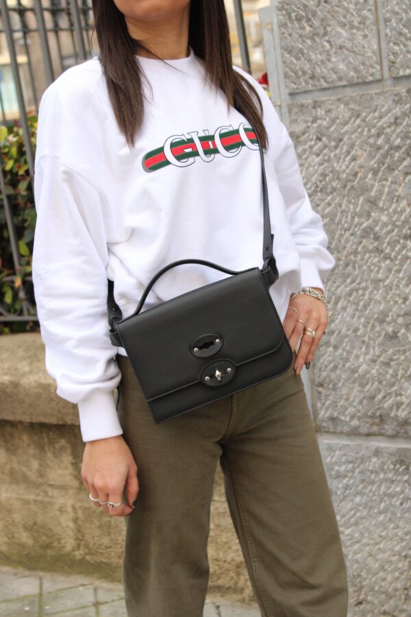 Borsa Zanellato Ella in Pelle Nera con parti metalliche argentate. Da portare comodamente a mano oppure a spalla grazie alla sua tracolla regolabile questa borsa è perfetta da indossare la sera o per un uso quotidiano. Articolo con condizioni pari al nuovo corredato di dust bag e cartellini.