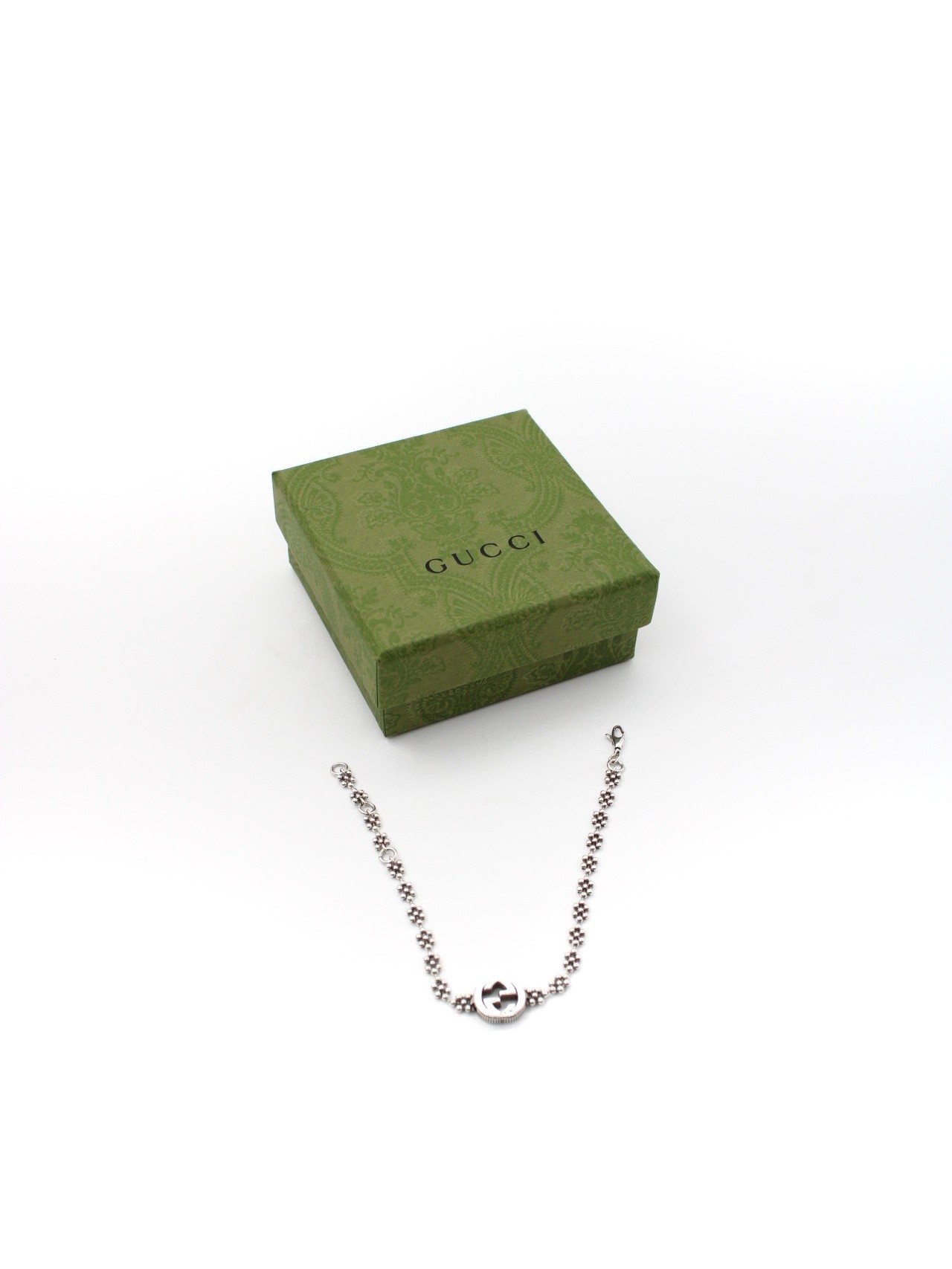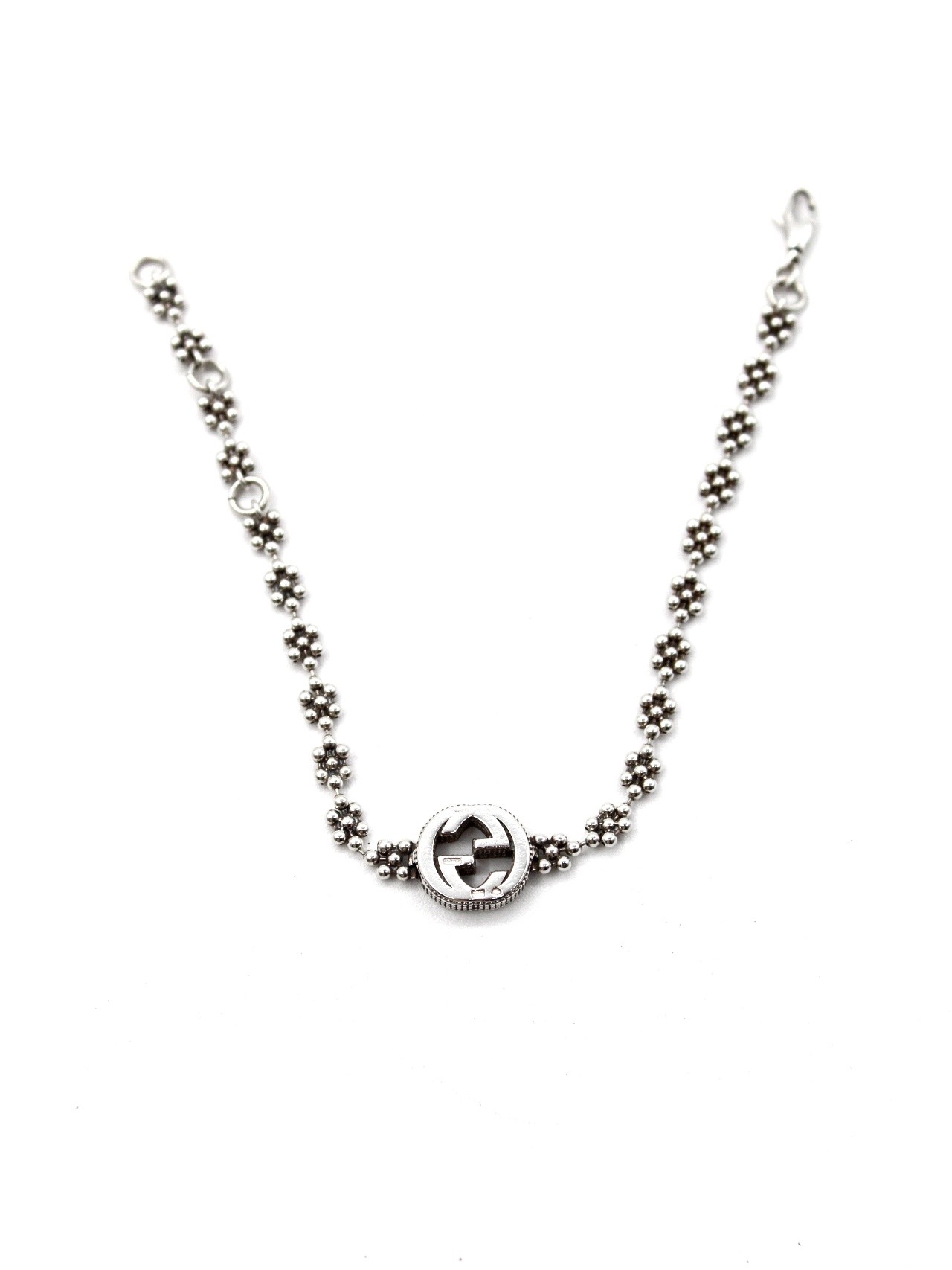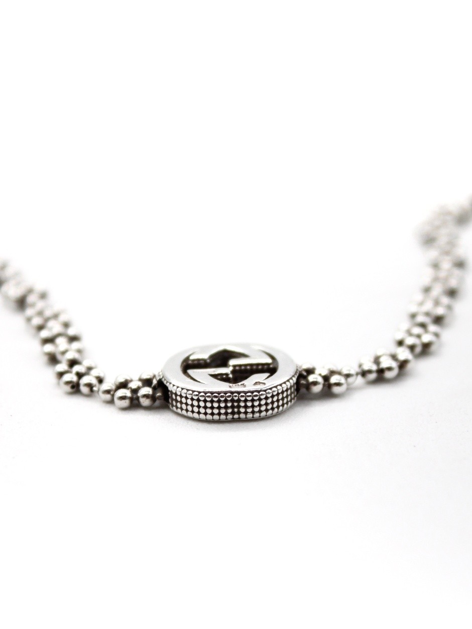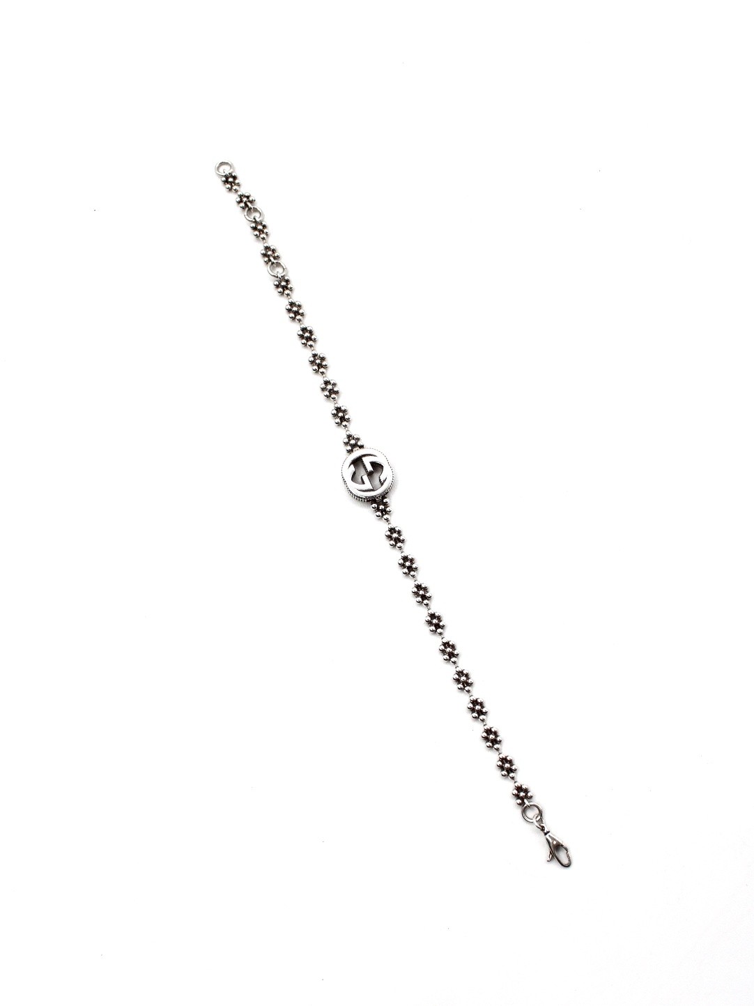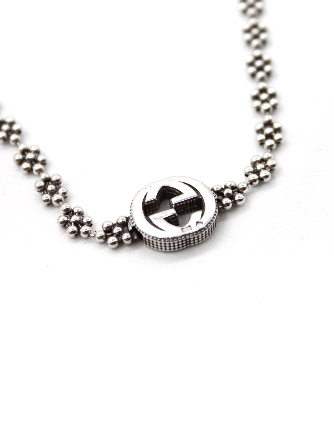Bracciale Gucci interlocking in argento 925. Catena con motivo floreale e chiusura con moschettone. Lunghezza totale 18 cm, regolabile a 17 e 16. Condizioni ottime con scatola.