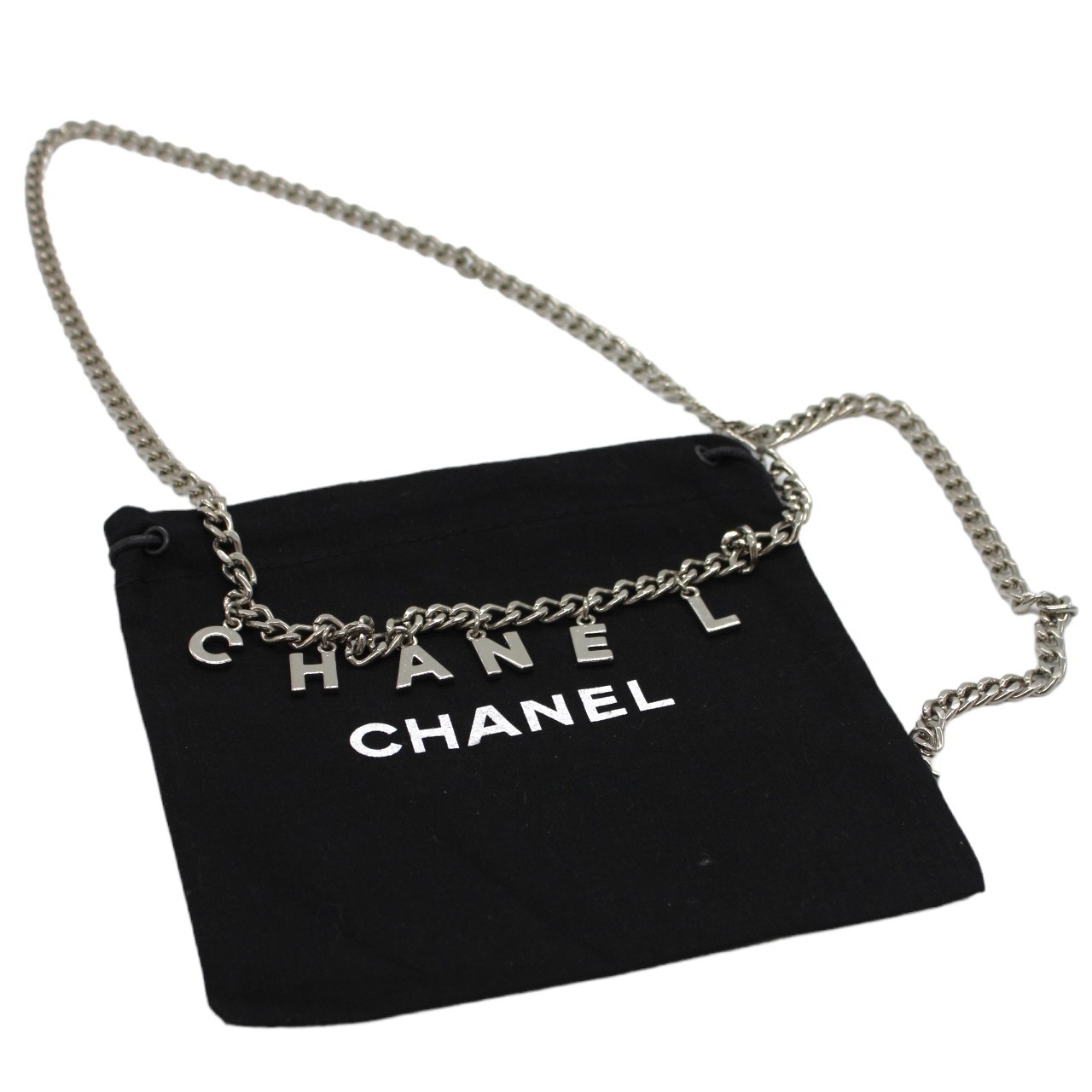 Cintura Chanel con scritta logata pendente in metallo argentato. Regolabile per indossarla come si vuole. Articolo in ottime condizioni corredato di dust bag.