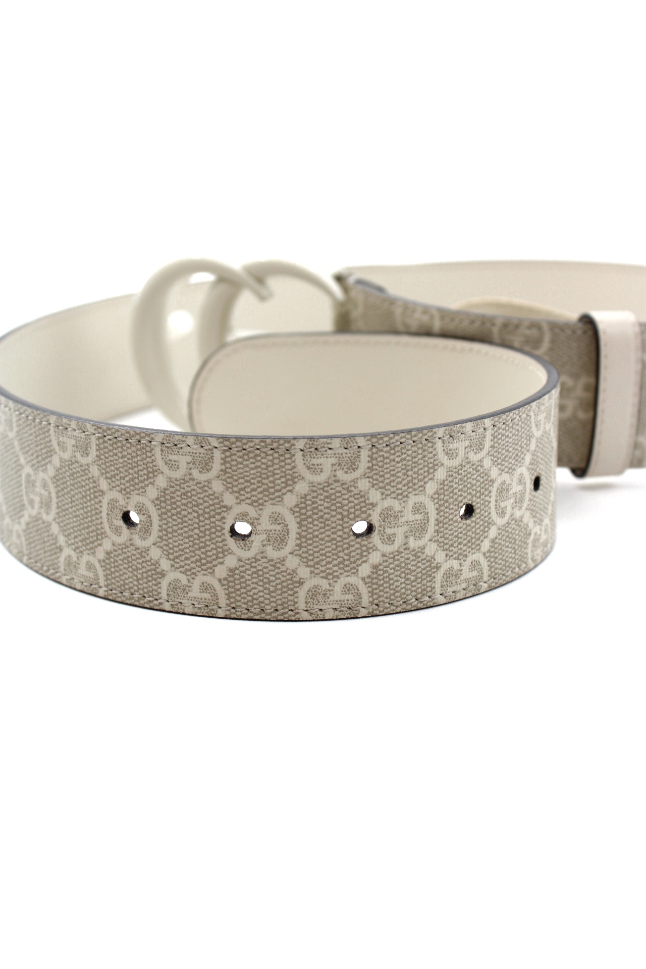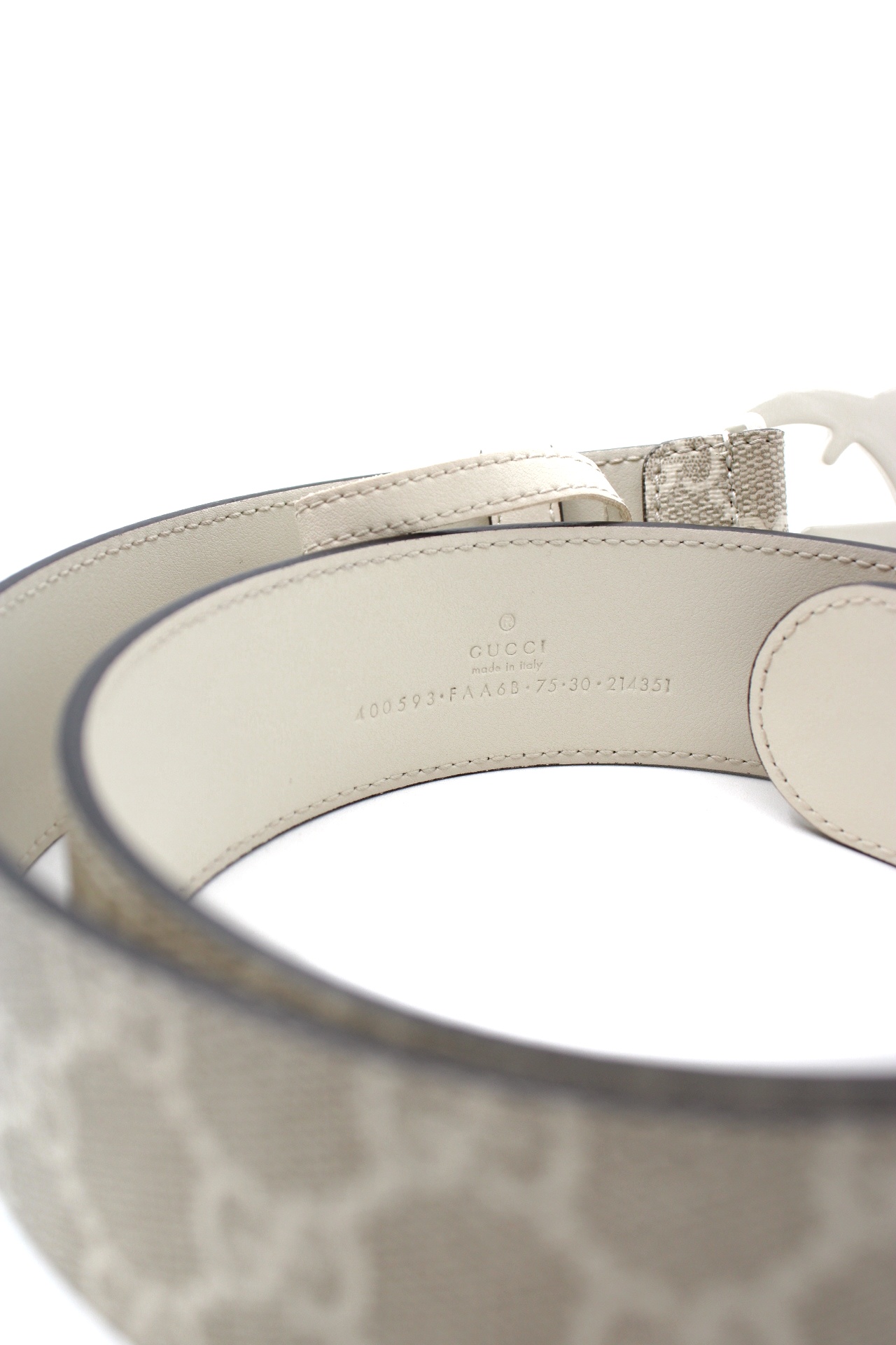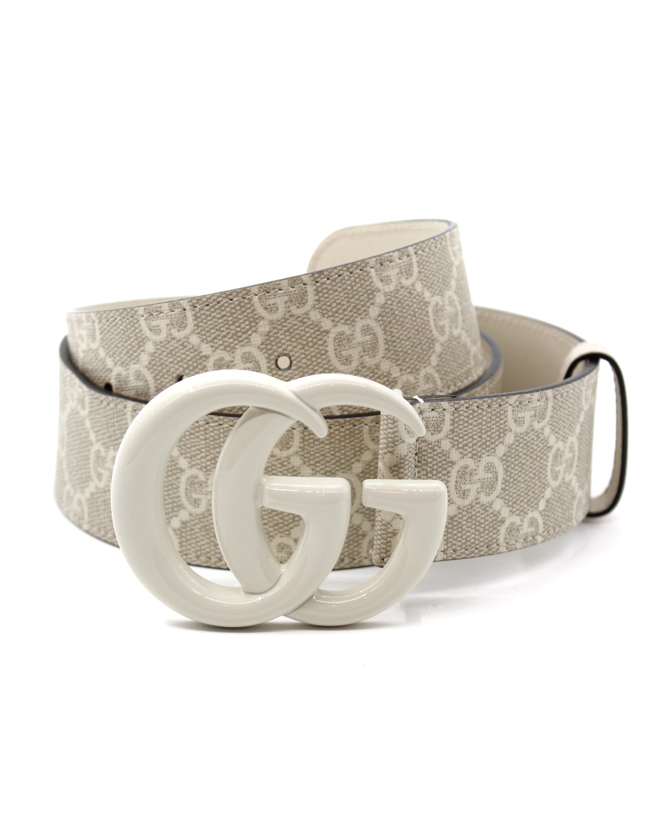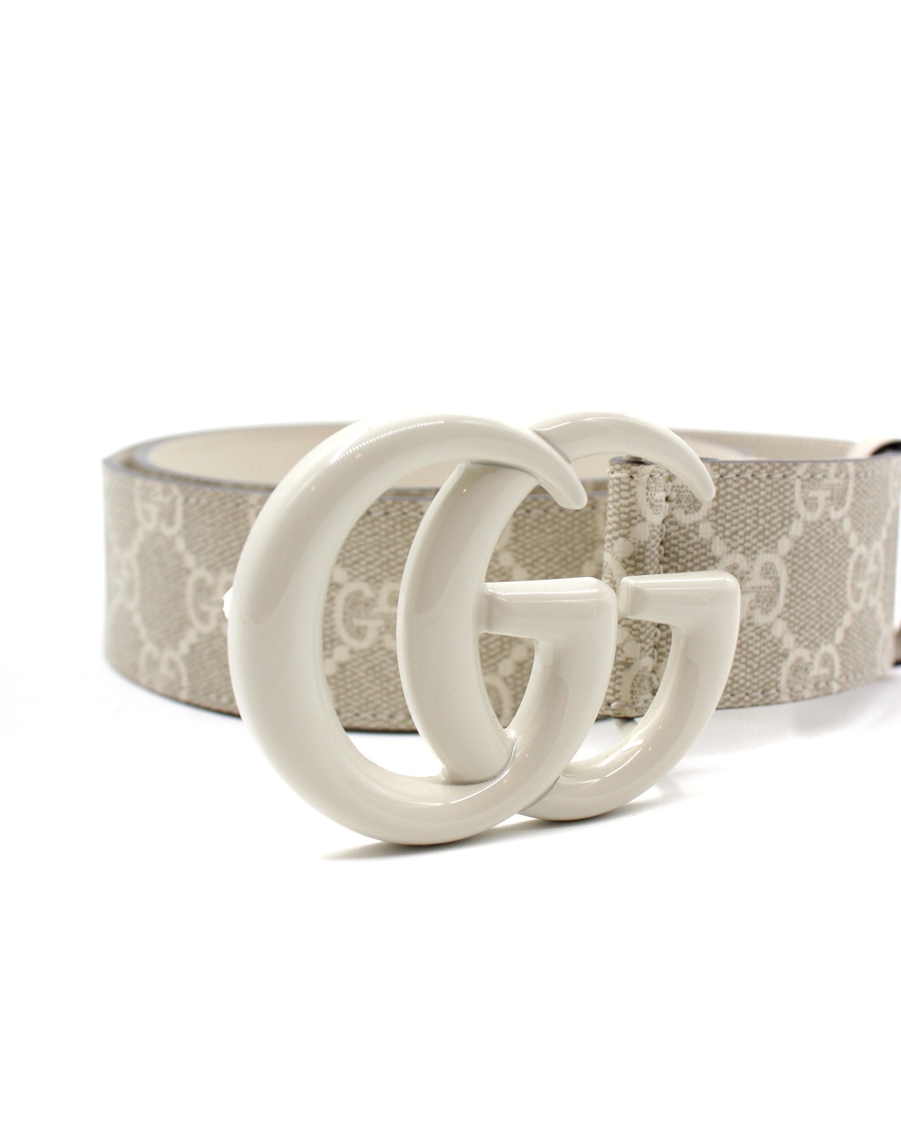 Cintura Gucci in tela GG supreme e pelle bianca. Logo GG smaltato bianco . Altezza cintura 4 cm misura 75. Articolo in condizioni eccellenti completo di dust e cartellini.