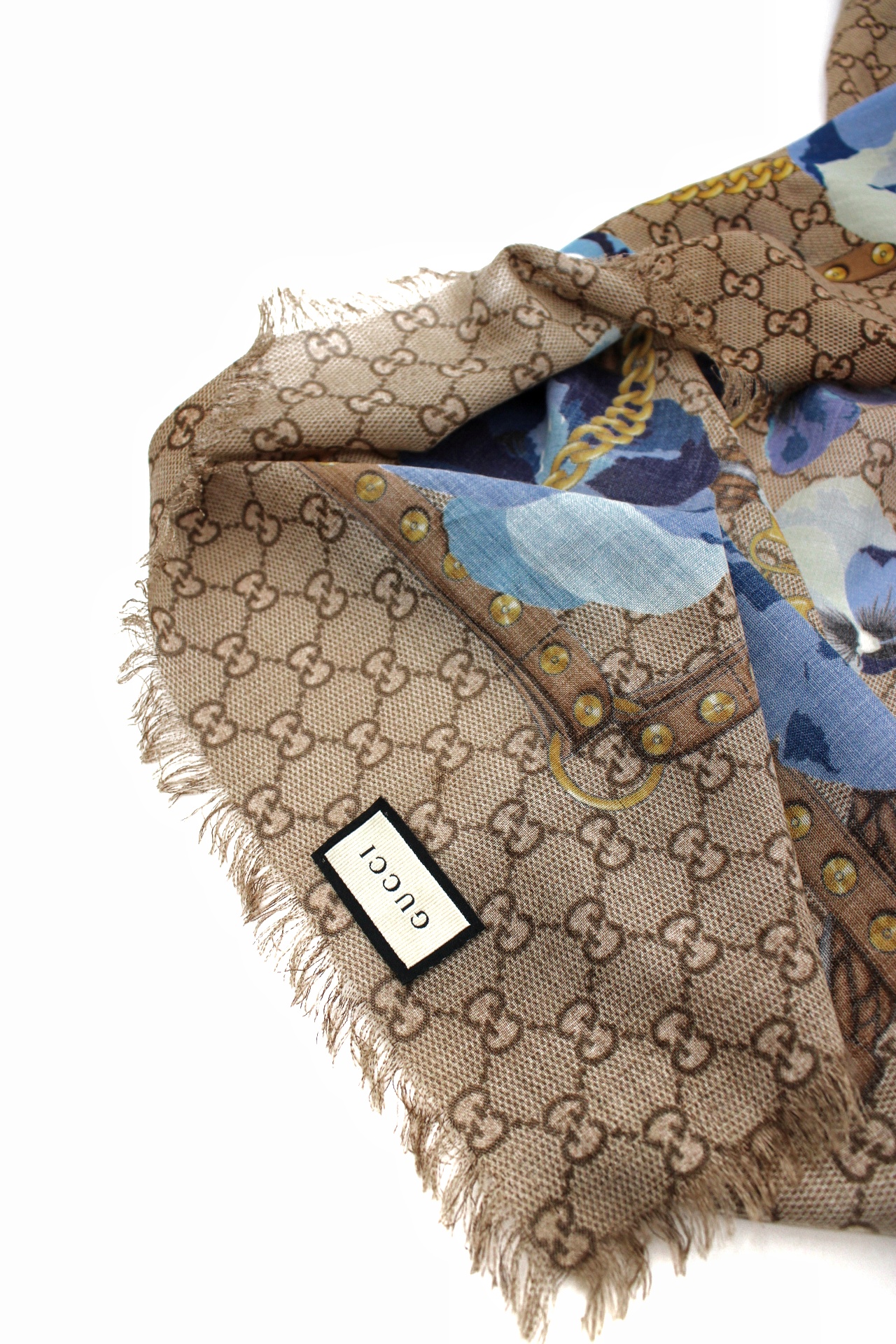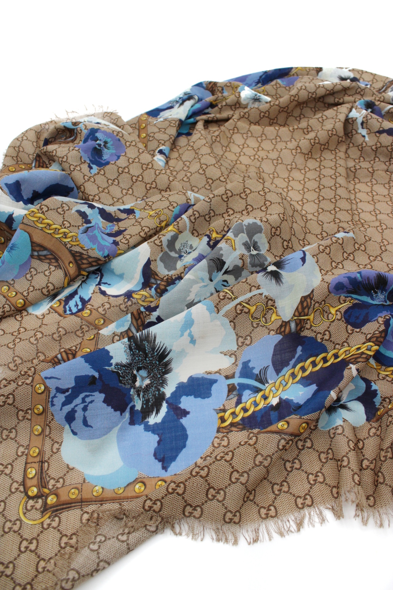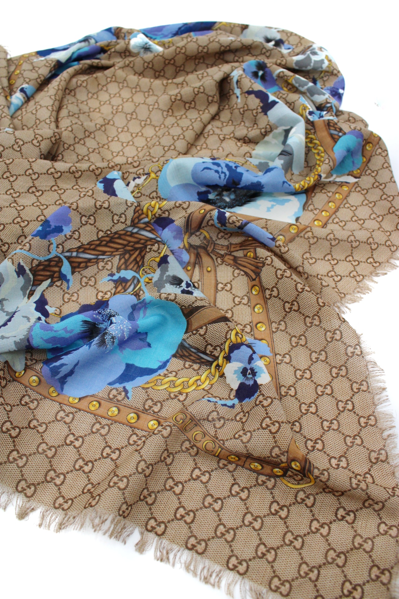Scialle Gucci Blooms caratterizzata dall'iconico motivo GG e stampa floreale. Materiale 100% lana . Misure 140x140 cm . Articolo in ottime condizioni completo di dust.