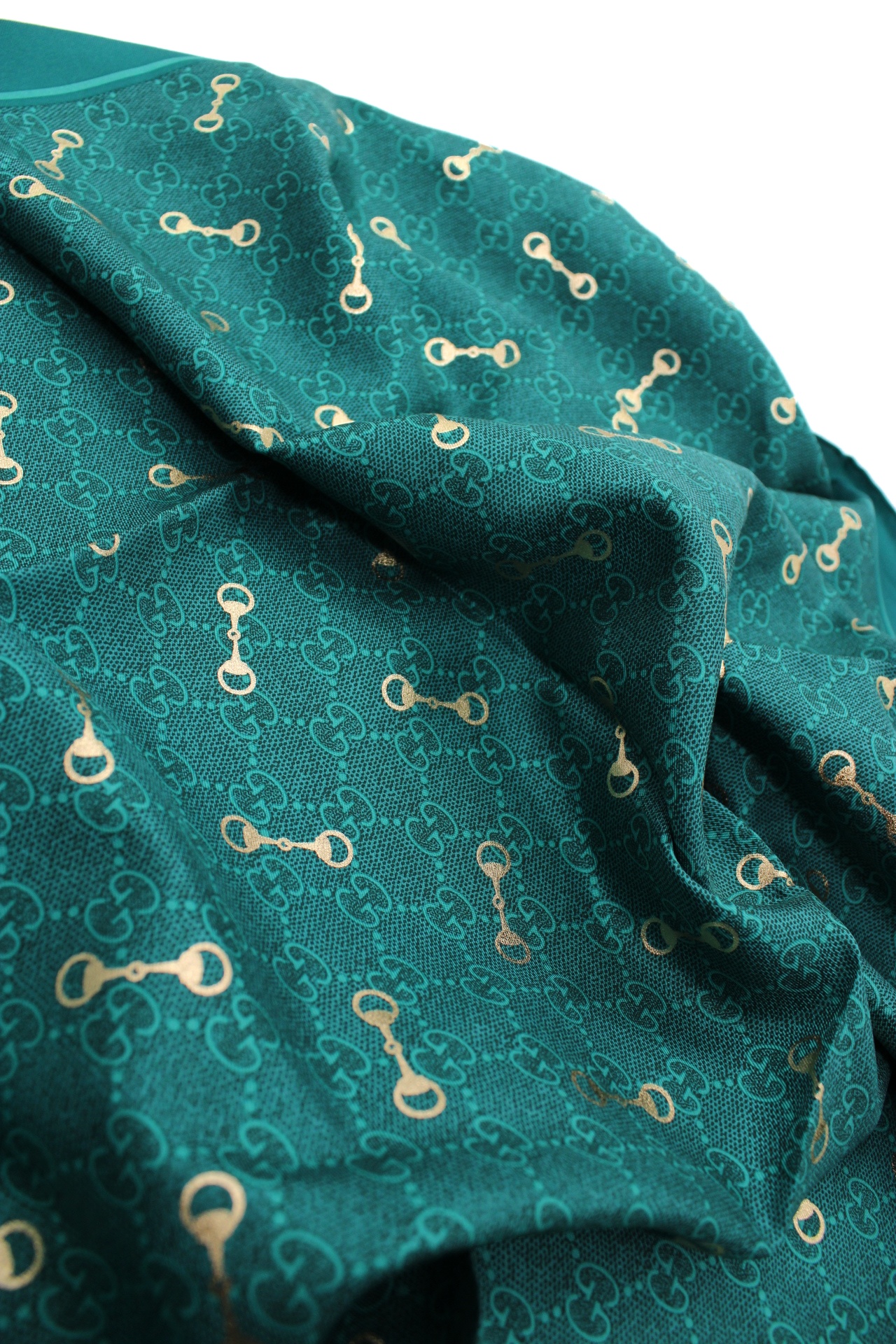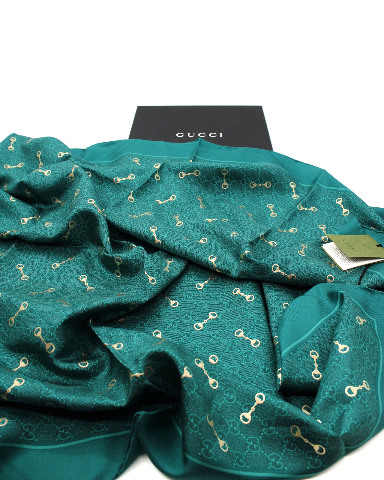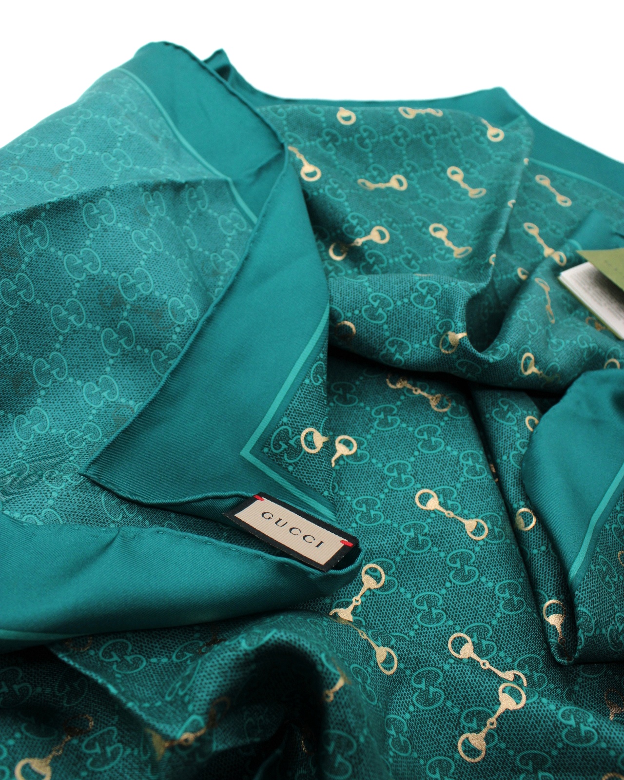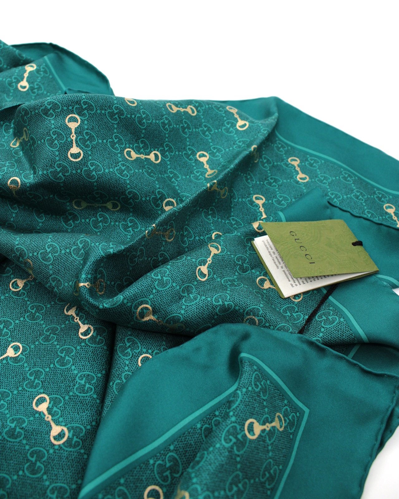 Foulard Gucci in seta con stampa GG e motivo morsetto .Misure 90x90 cm . Articolo pari al nuovo completo di scatola.