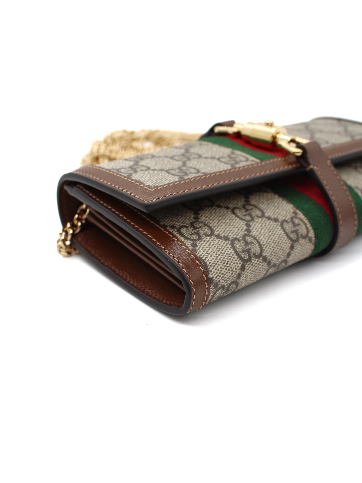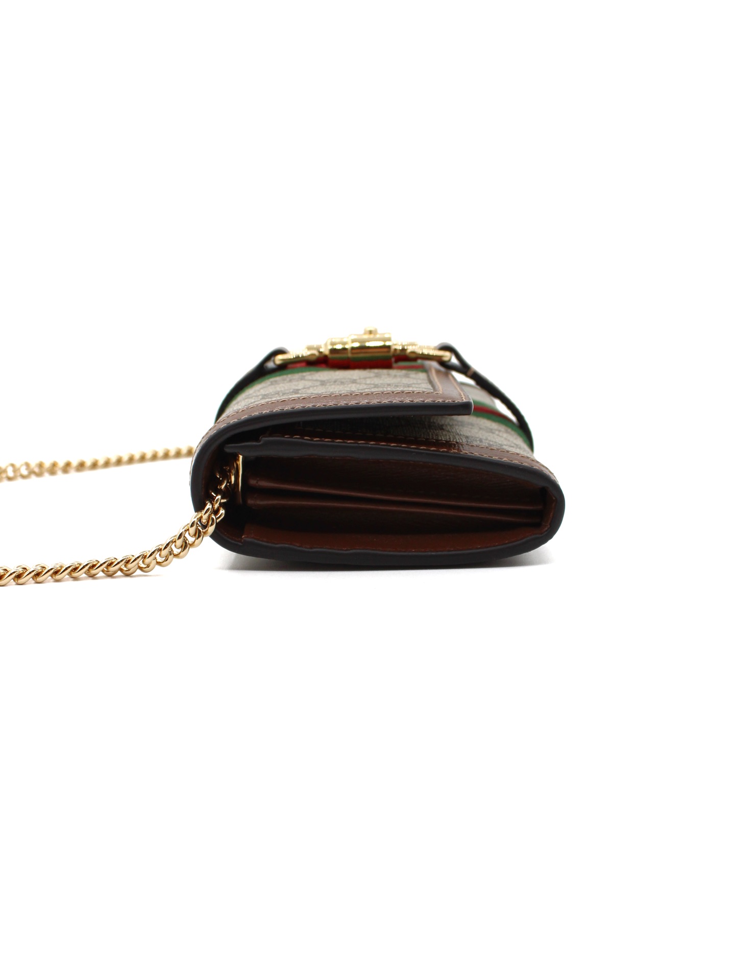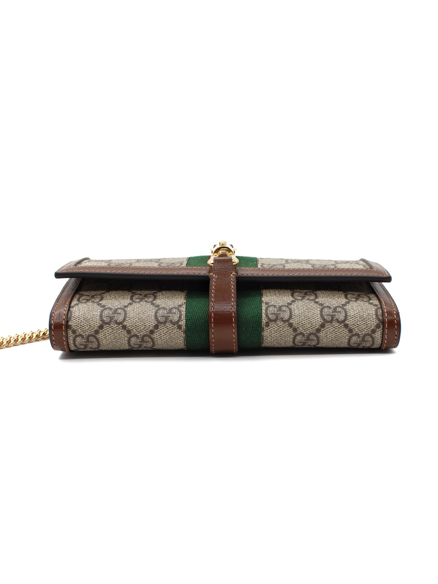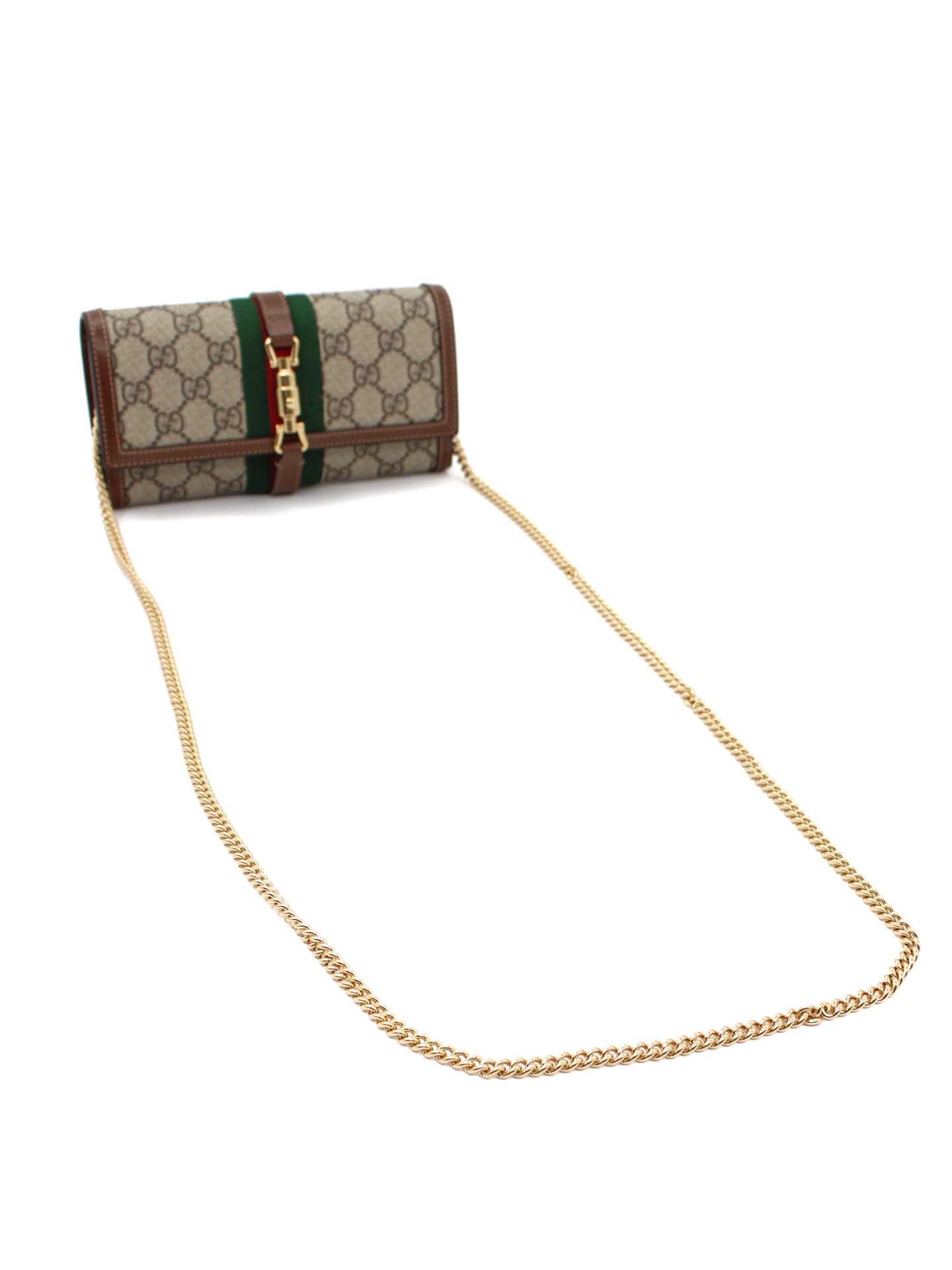 Gucci Jackie Wallet on Chain Ophidia con parti metalliche dorate. Da portare a tracolla questo wallet presenta diverse fessure per carte e uno scomparto con zip per le monete. Articolo pari al nuovo corredato di scatola e cartellini.