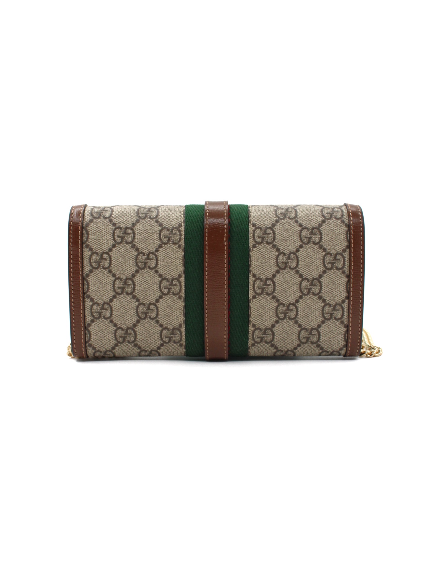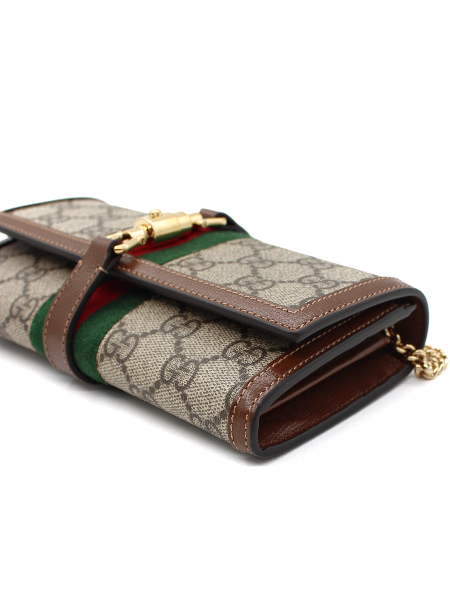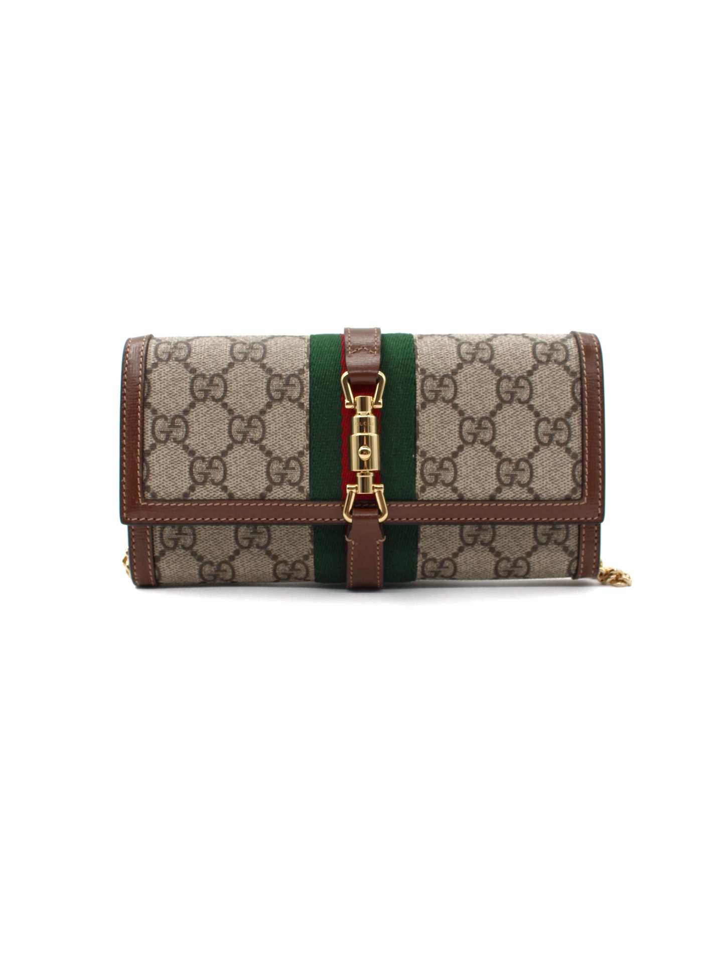 Gucci Jackie Wallet on Chain Ophidia con parti metalliche dorate. Da portare a tracolla questo wallet presenta diverse fessure per carte e uno scomparto con zip per le monete. Articolo pari al nuovo corredato di scatola e cartellini.