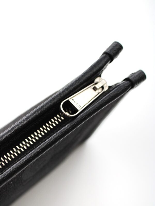 Pochette Gucci GG Jumbo in tessuto ed inserti in pelle nera con dettagli metallici argentati. Da portare comodamente a mano, adatta sia per lui che per lei. Articolo in ottime condizioni corredato di dust bage cartellini.