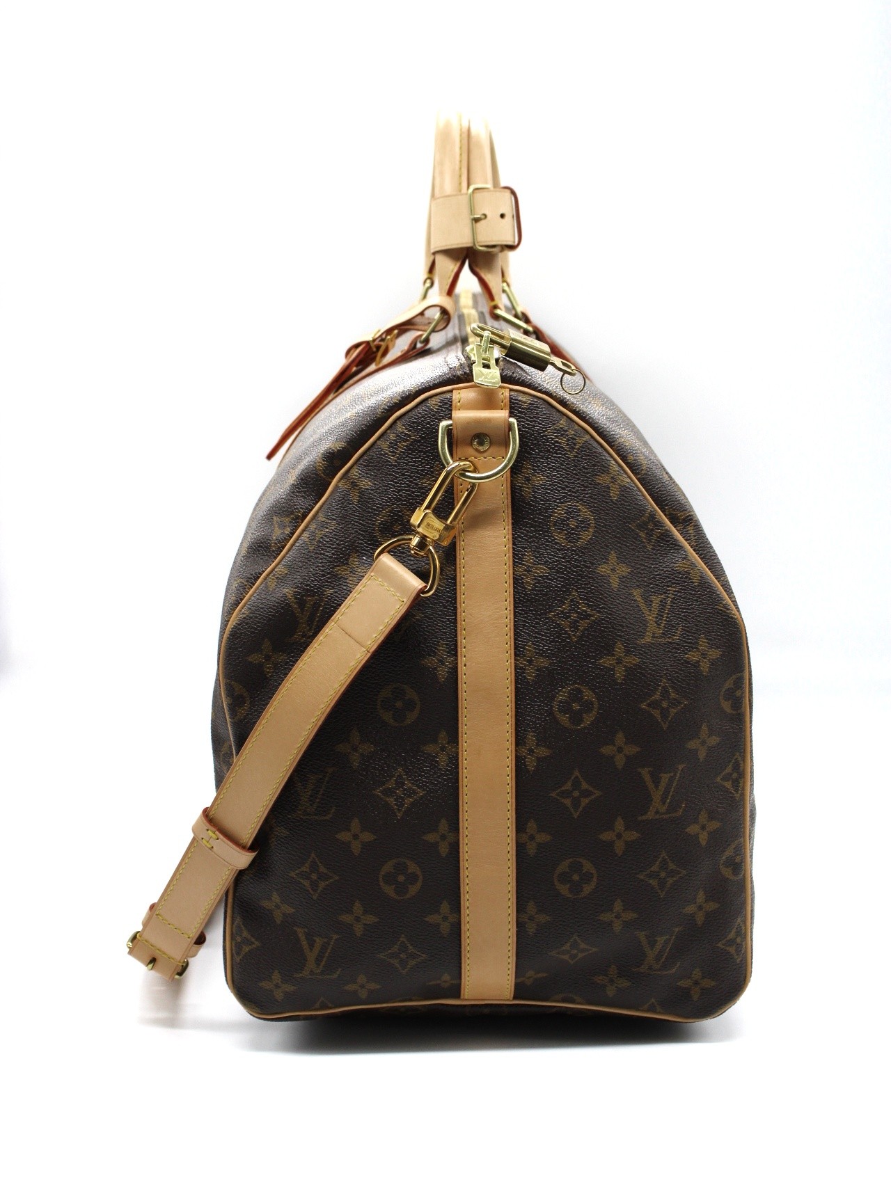 Keepall Louis Vuitton 55 in monogram e parti metalliche dorate. Da portare a mano oppure a spalla grazie alla sua tracolla regolabile e amovibile. Perfetto per gite fuori porta. Articolo in condizioni eccellenti corredato di dust bag.