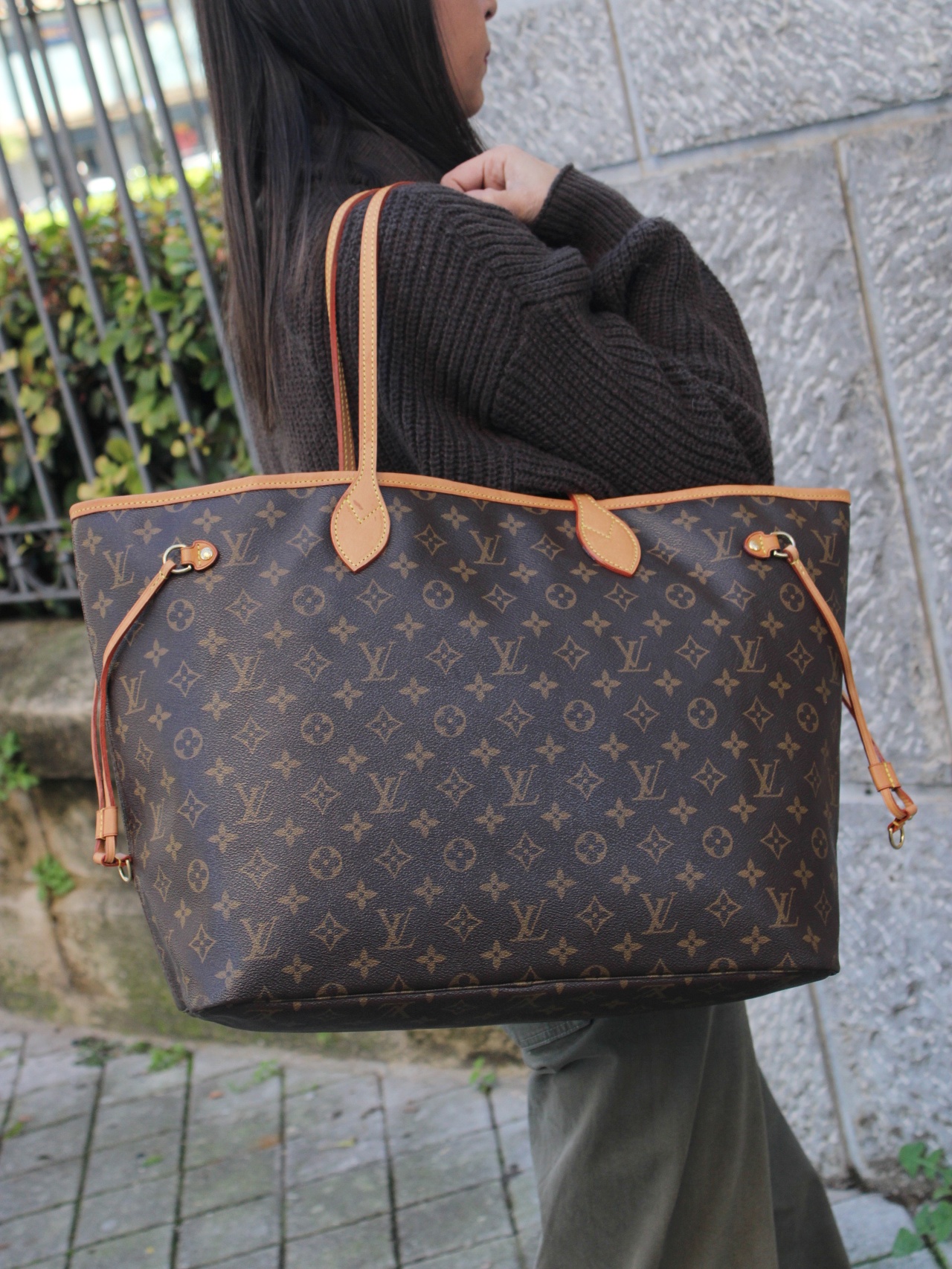 Louis Vuitton Neverfull GM con parti metalliche dorate. Da portare a spalla questa borsa è perfetta per tutti i giorni con svariati tipi di outfit. Articolo in condizioni ottime(si evidenzia parti in vacchetta sostituite artigianalmente)  completo di dust Très Chic