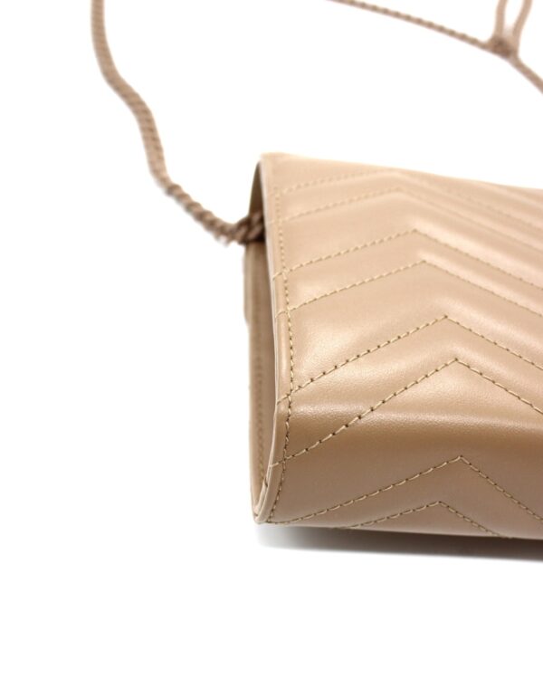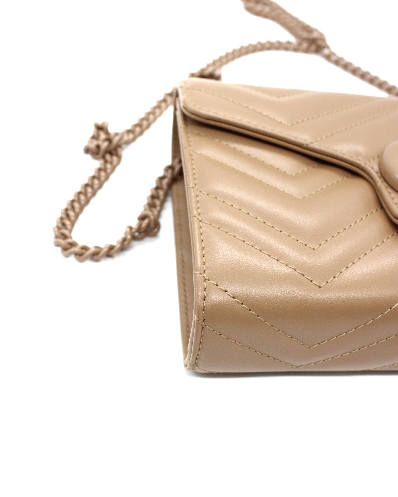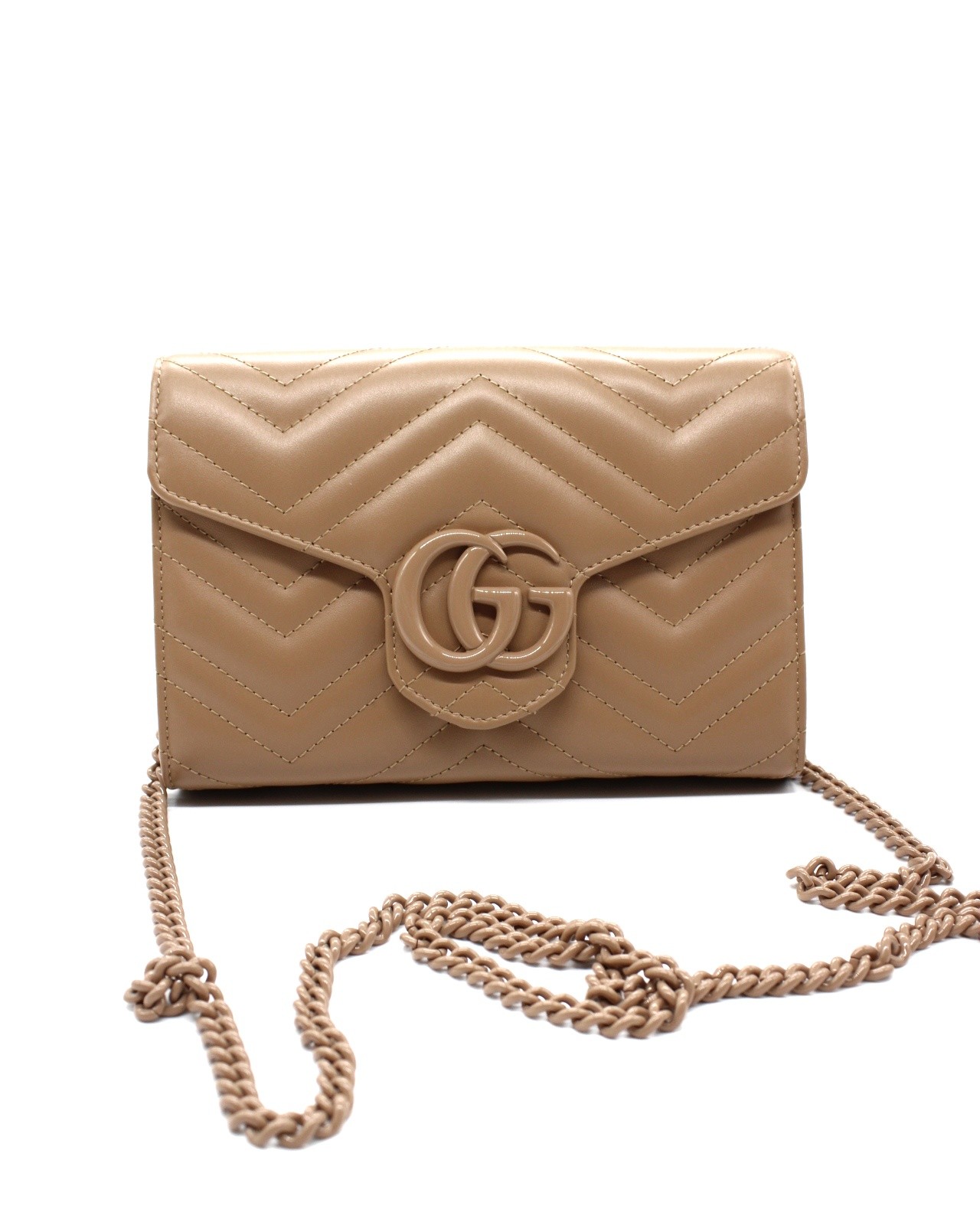 Mini borsa Gucci GG marmont in pelle matelassé con parti metalliche tono su tono. Da portare a spalla oppure ad incrocio grazie alla sua tracolla a catena. Borsa che si adatta anche a dei look ricercati. Articolo pari al nuovo corredato di scatola e cartellini