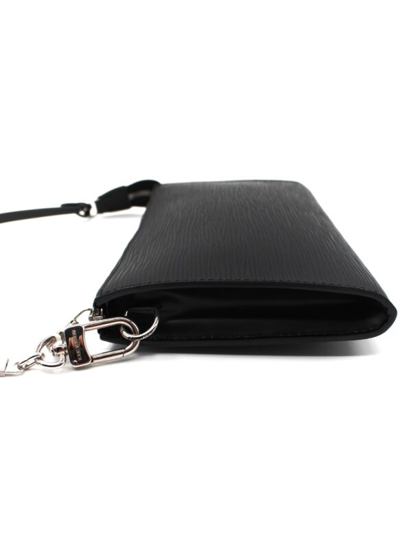 Pochette Louis Vuitton in Pelle Epi Nera con parti metalliche argentate compresa di gancio estensore. Da portare a spalla questa borsa è perfetta per occasioni speciali. Articolo in condizioni eccellenti corredato di dust.