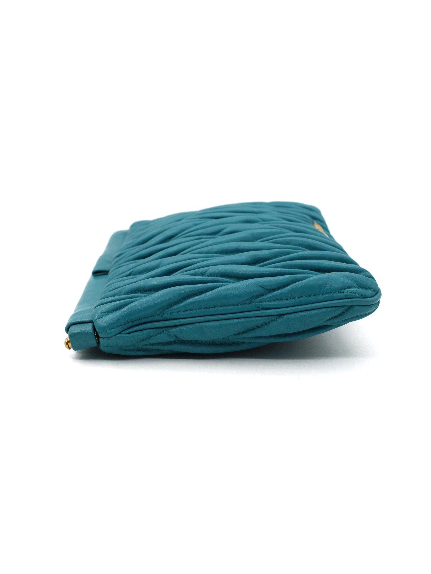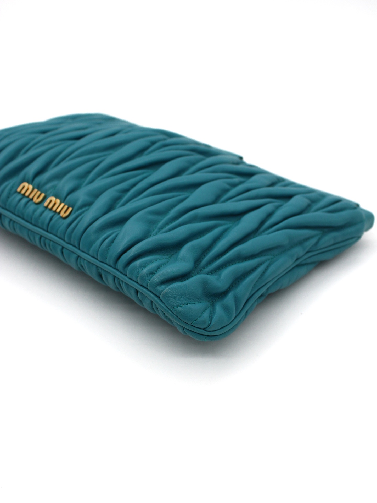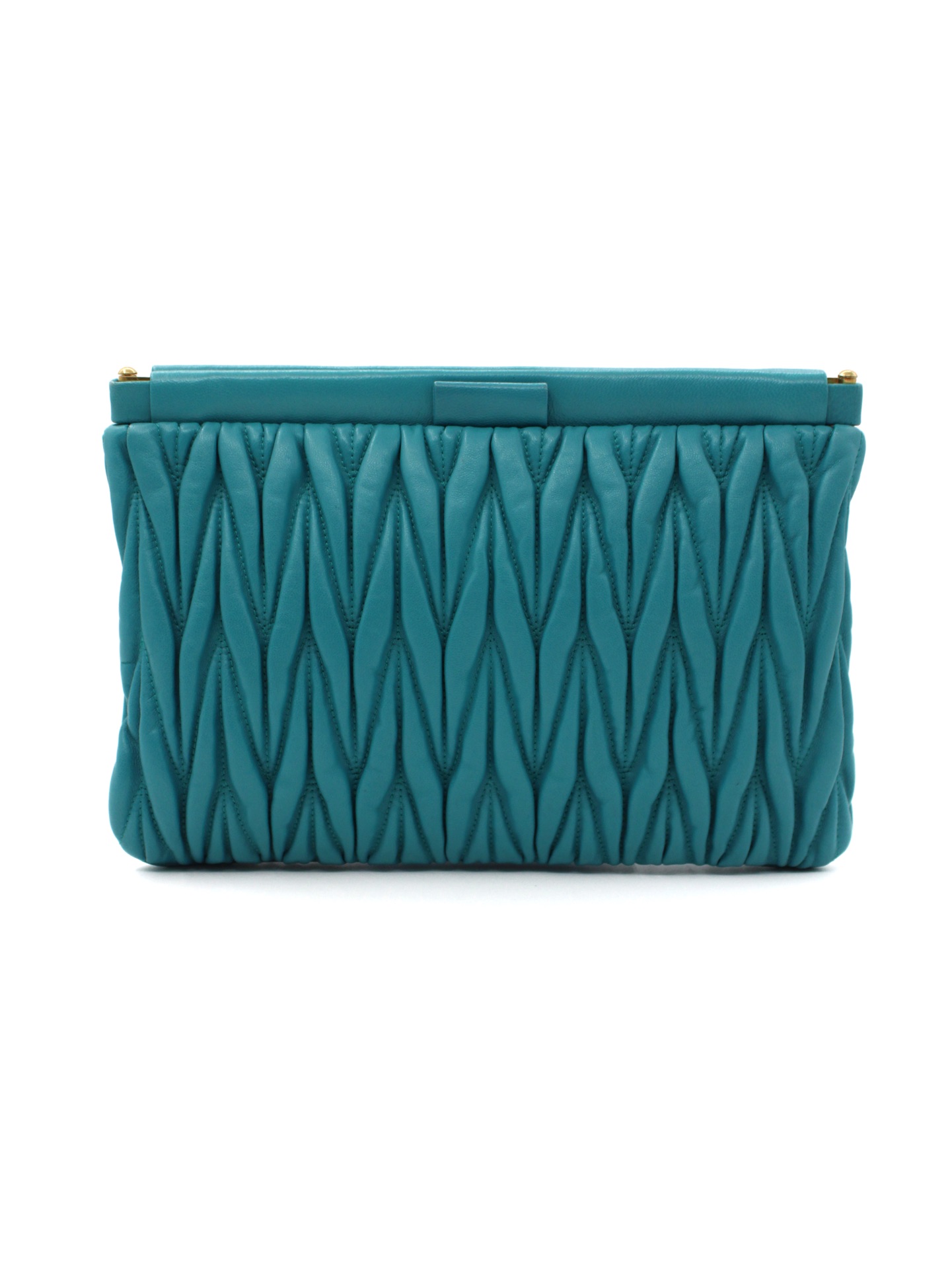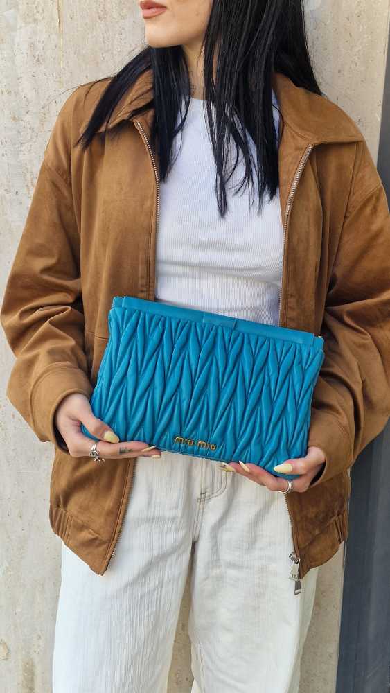 Pochette Miu Miu in Pelle Matelassé Turchese con parti metalliche dorate. Da portare a mano questa borsa si abbina con svariati tipi di outfit. Articolo in ottime condizioni corredato di dust bag Très Chic.