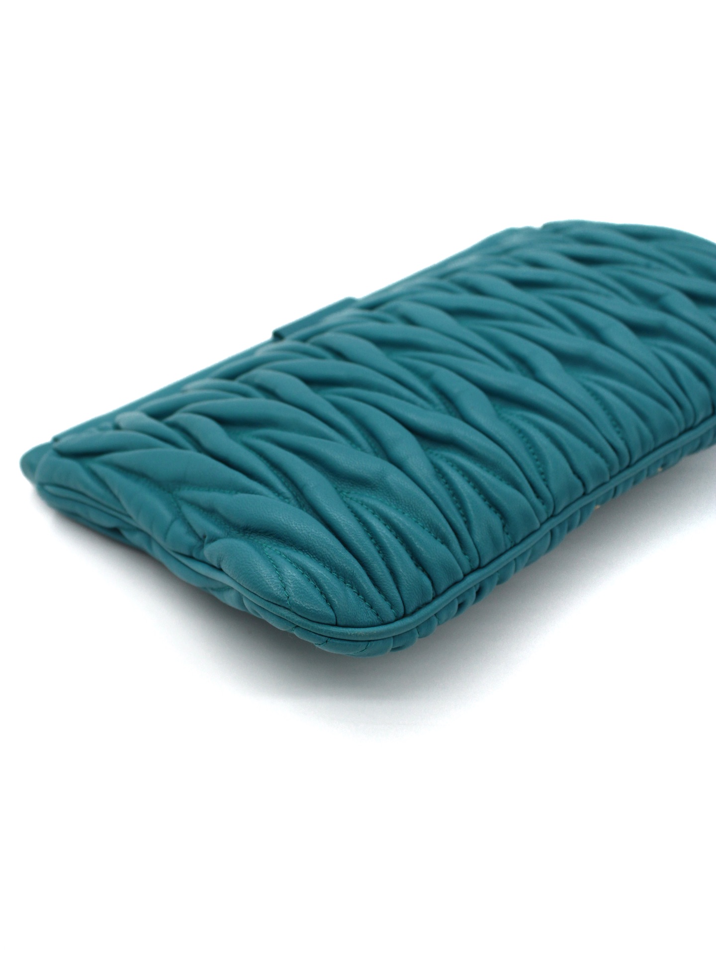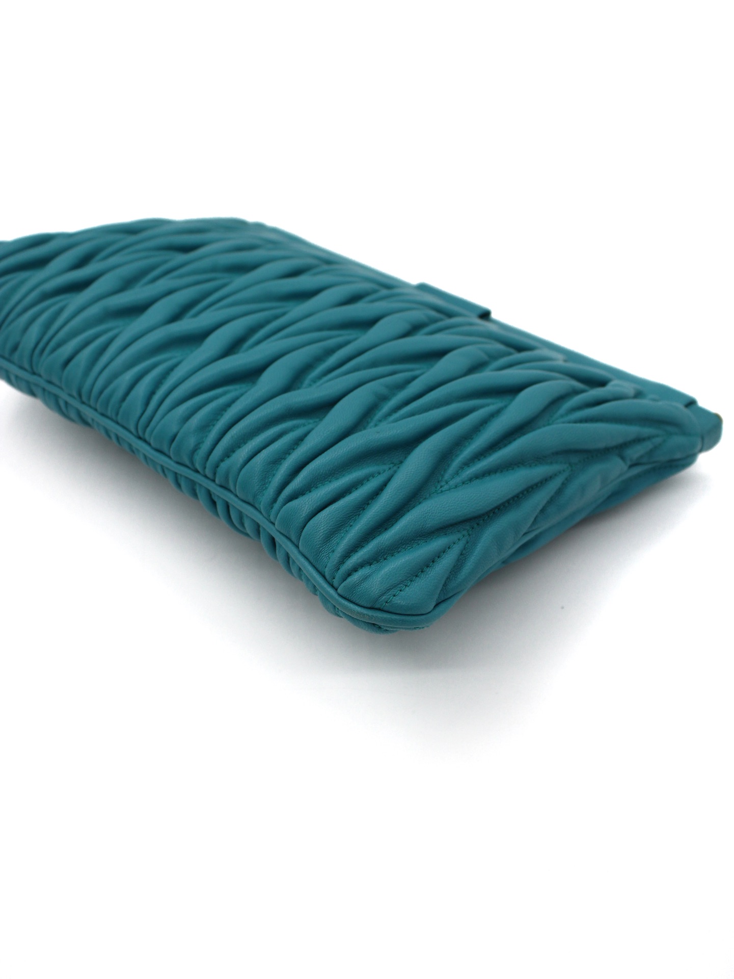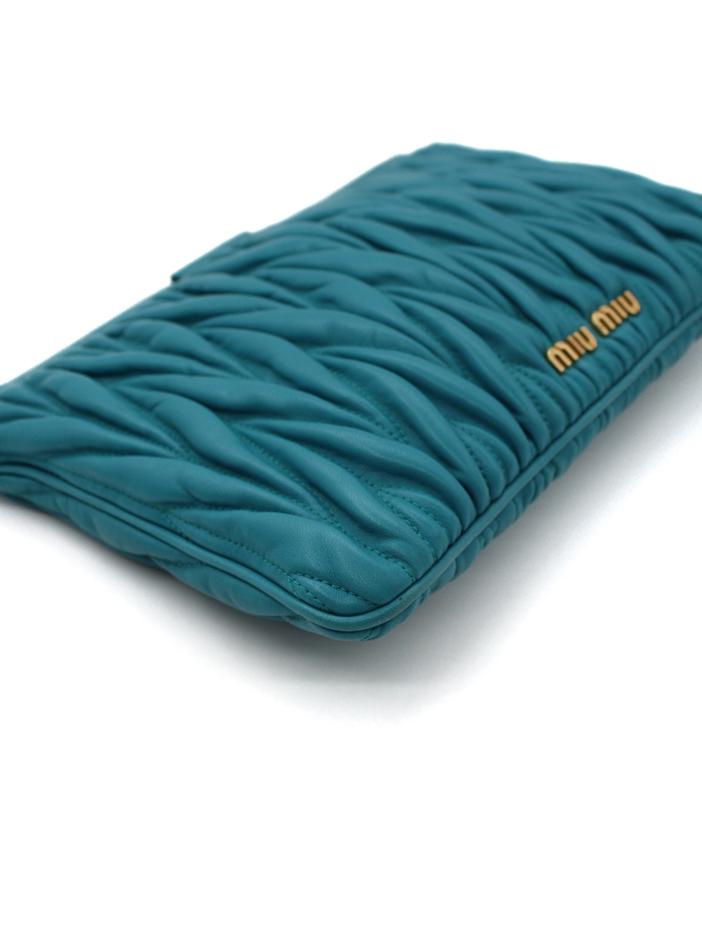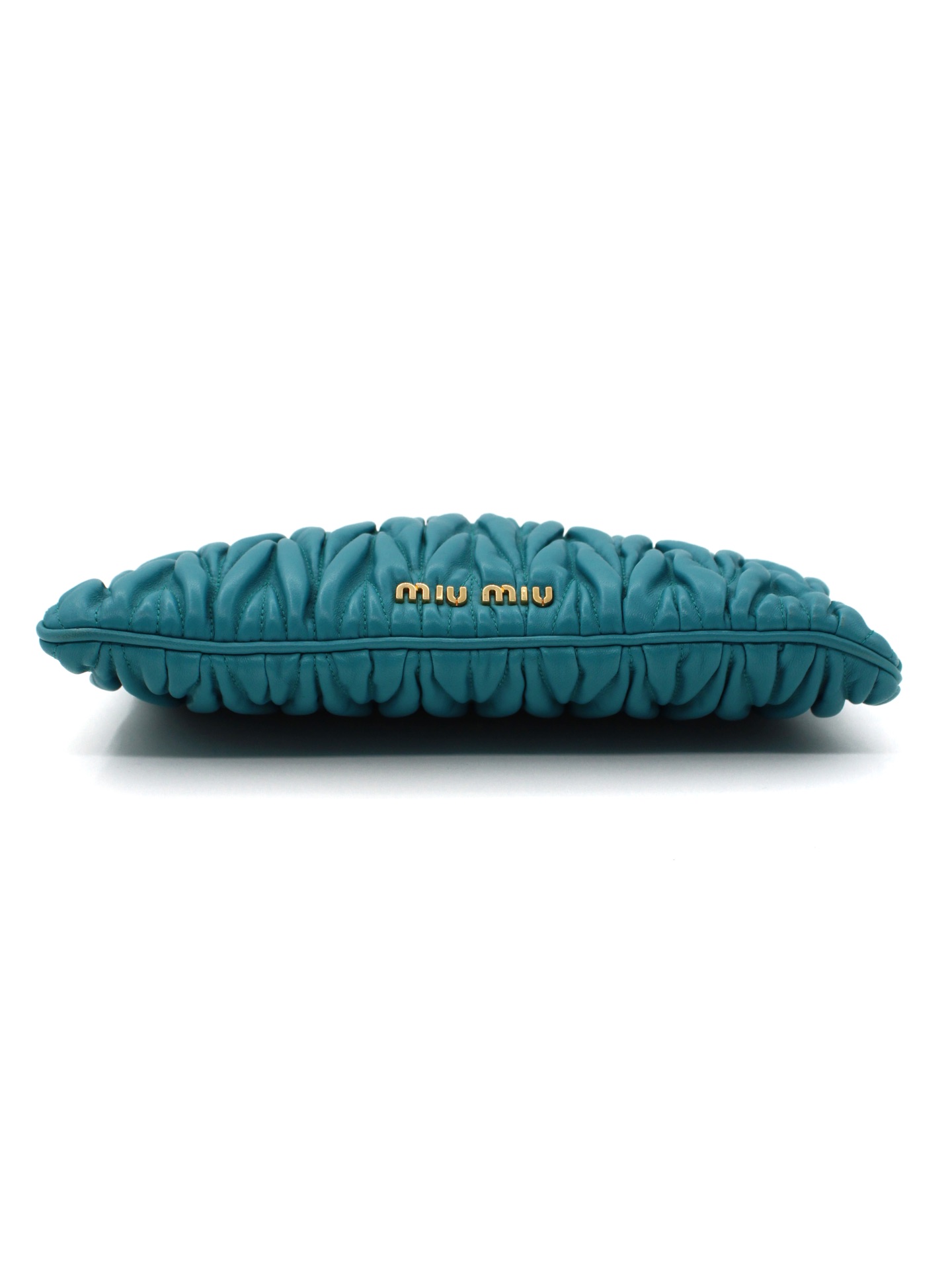 Pochette Miu Miu in Pelle Matelassé Turchese con parti metalliche dorate. Da portare a mano questa borsa si abbina con svariati tipi di outfit. Articolo in ottime condizioni corredato di dust bag Très Chic.