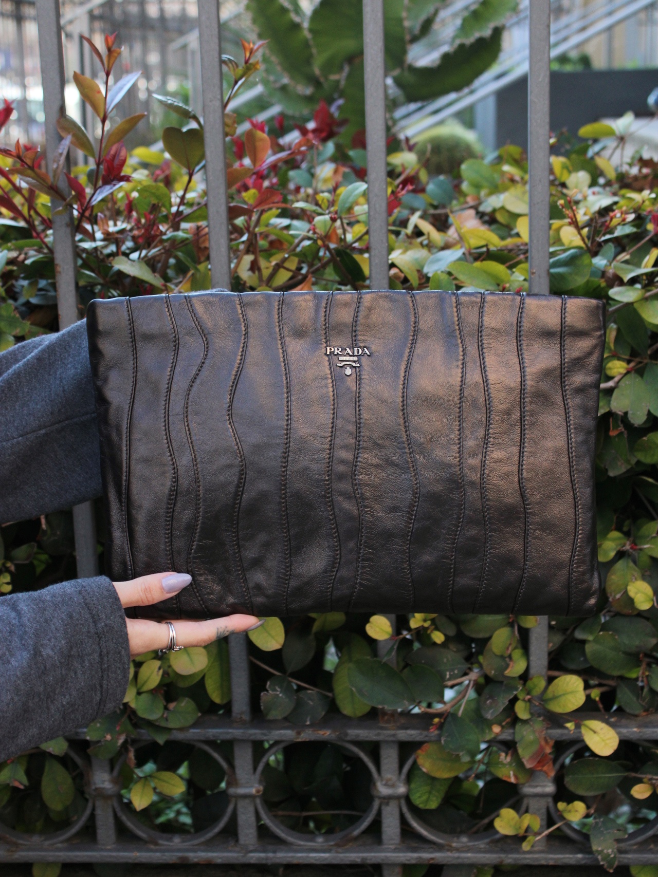 Pochette Prada con parti metalliche argentate da portare a mano. Perfetta per tutti i gorni con svariati tipi di outfit. Articolo in ottime condizioni corredato da dust Très Chic