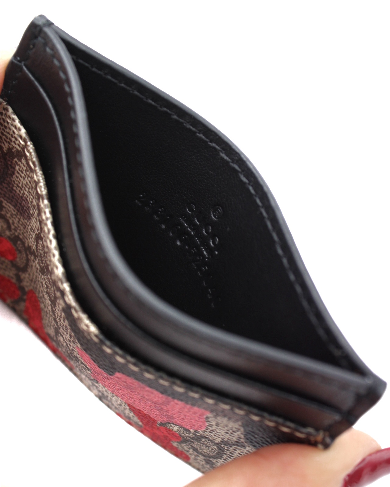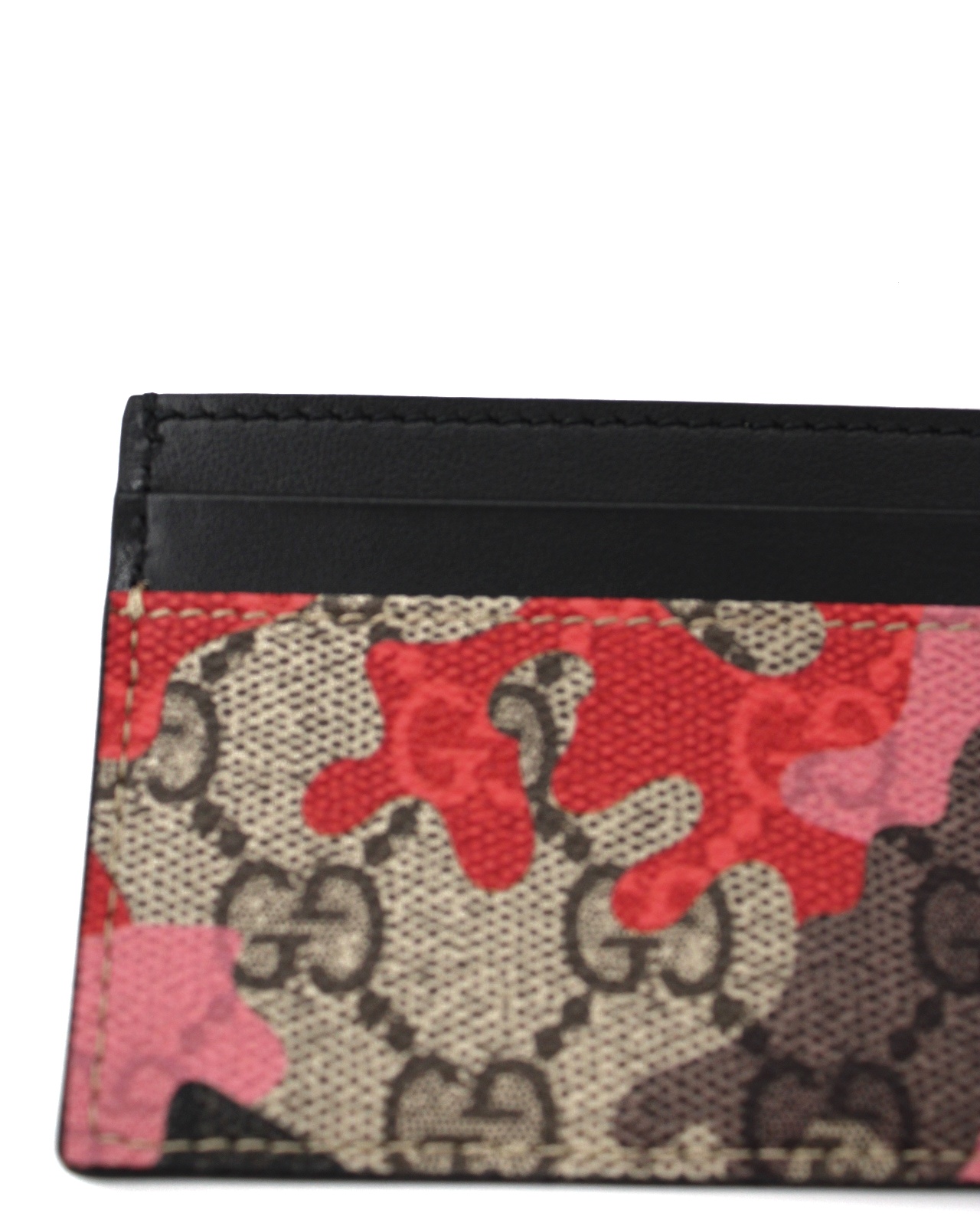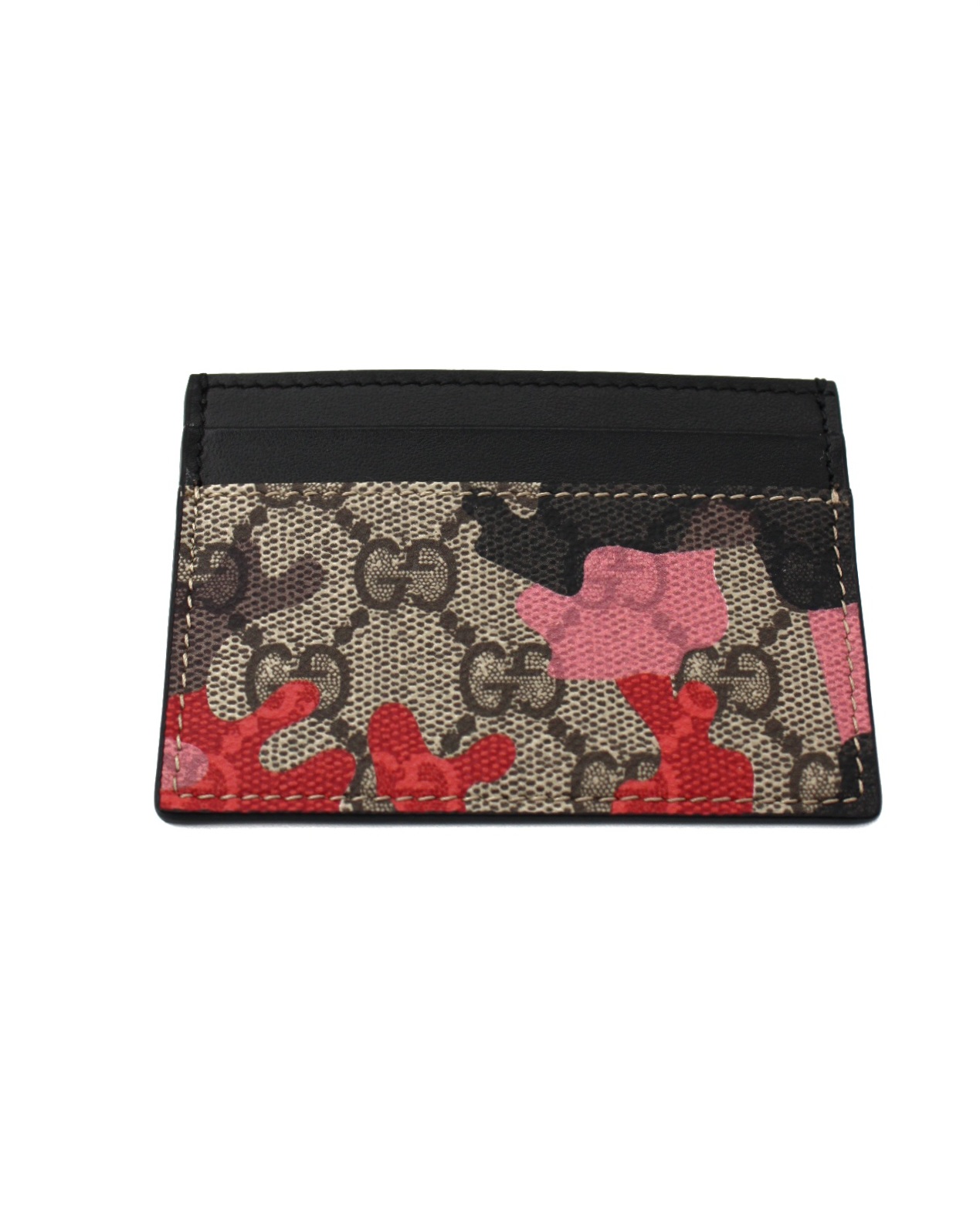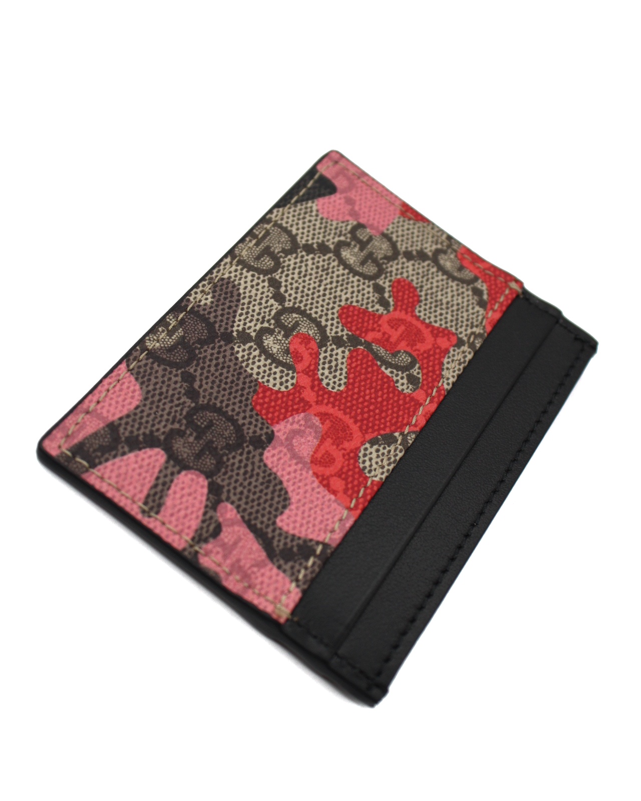 Portacarte Gucci in tela GG effetto camouflage e pelle nera . Dotato di 5 fessure per carte .Misure L10xA7 cm . Articolo pari al nuovo completo di dust Très Chic.