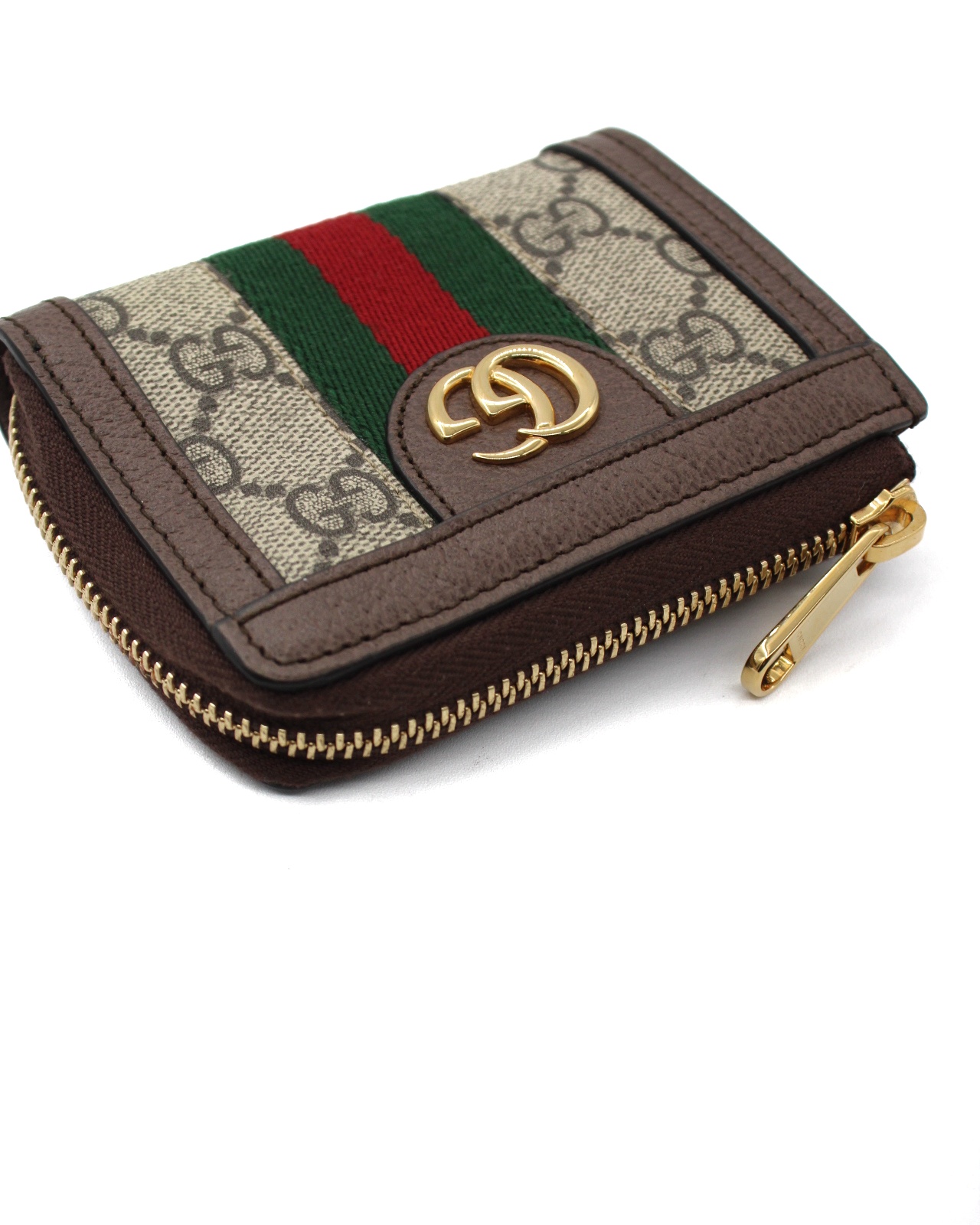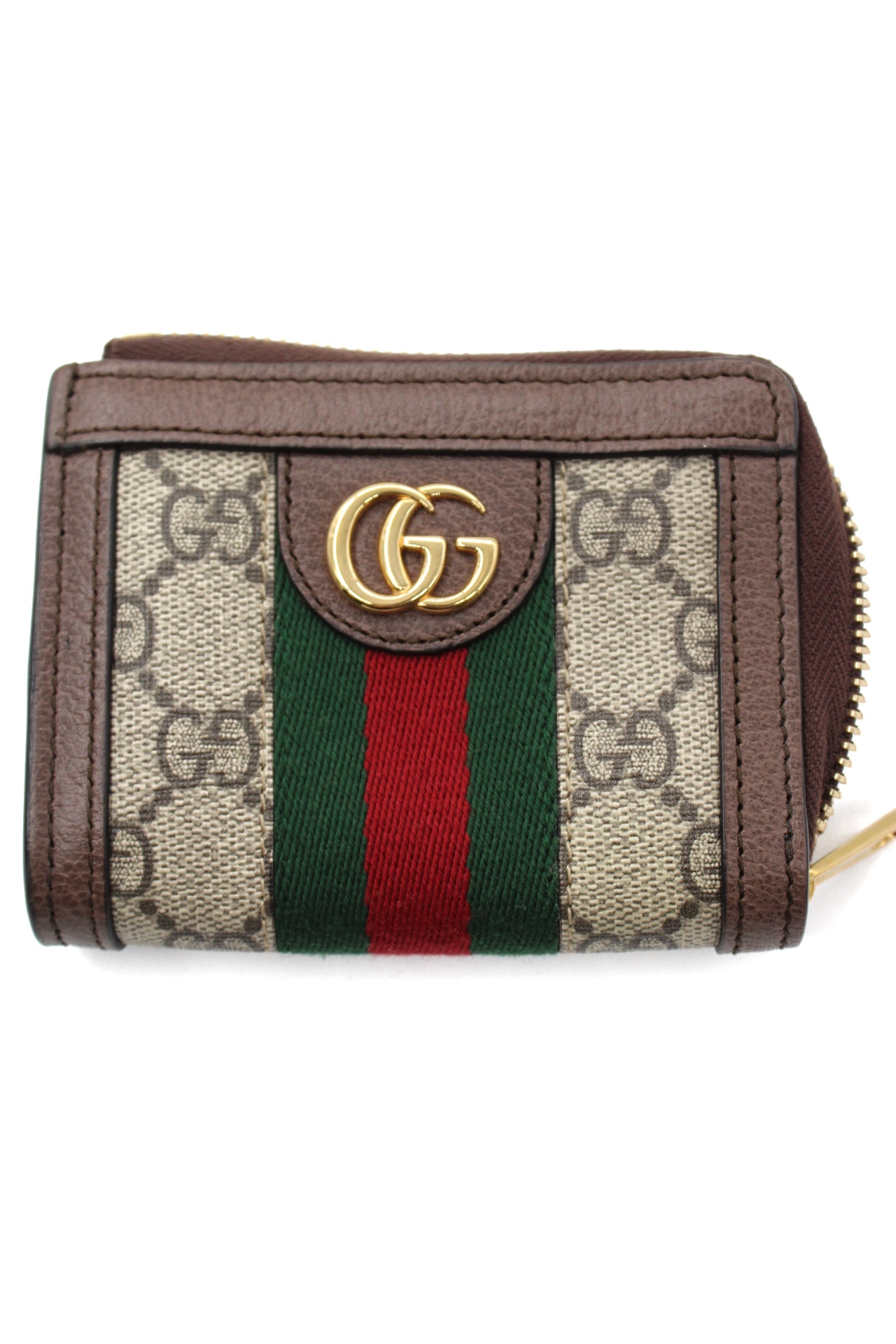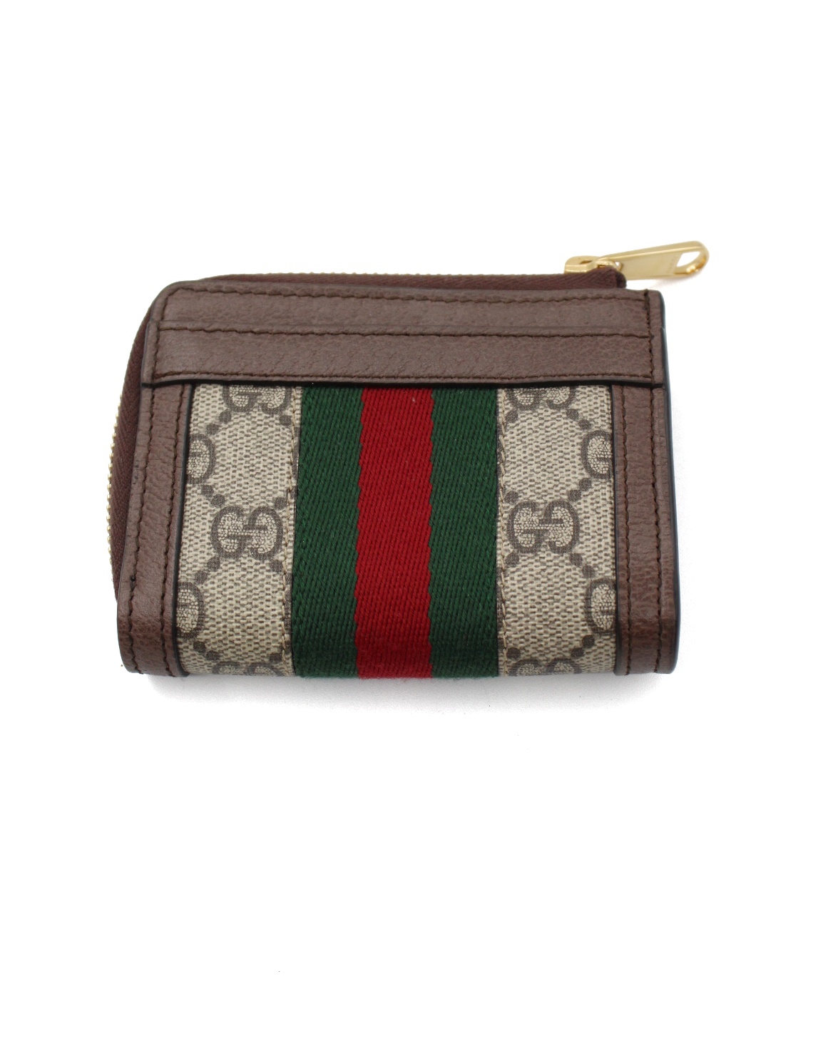 Portafoglio Gucci bi-fold Ophidia Web realizzato in tessuto GG supreme con inserti in pelle marrone e nastro web. Dotato di 4 fessure per per carte ed una tasca per banconote. Misure L11xA8xP2 cm. Articolo in condizioni eccellenti completo di dust e cartellini.