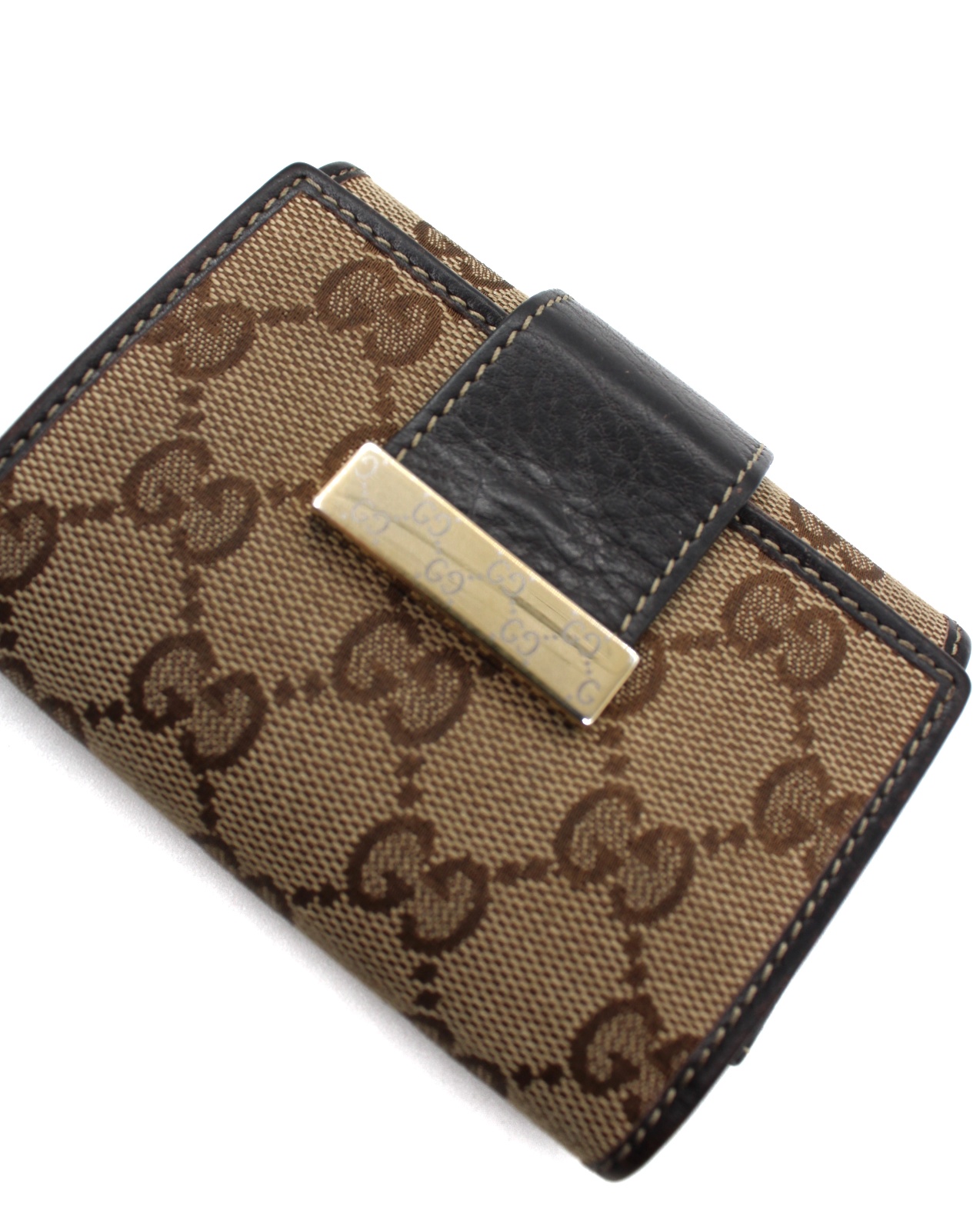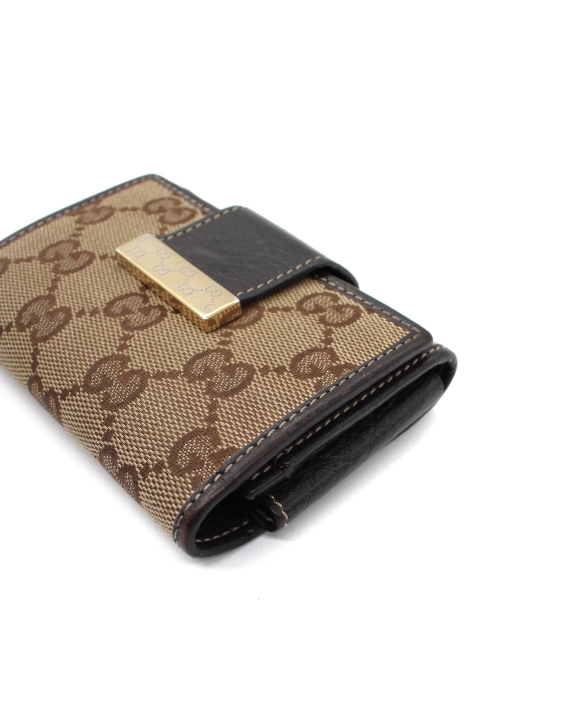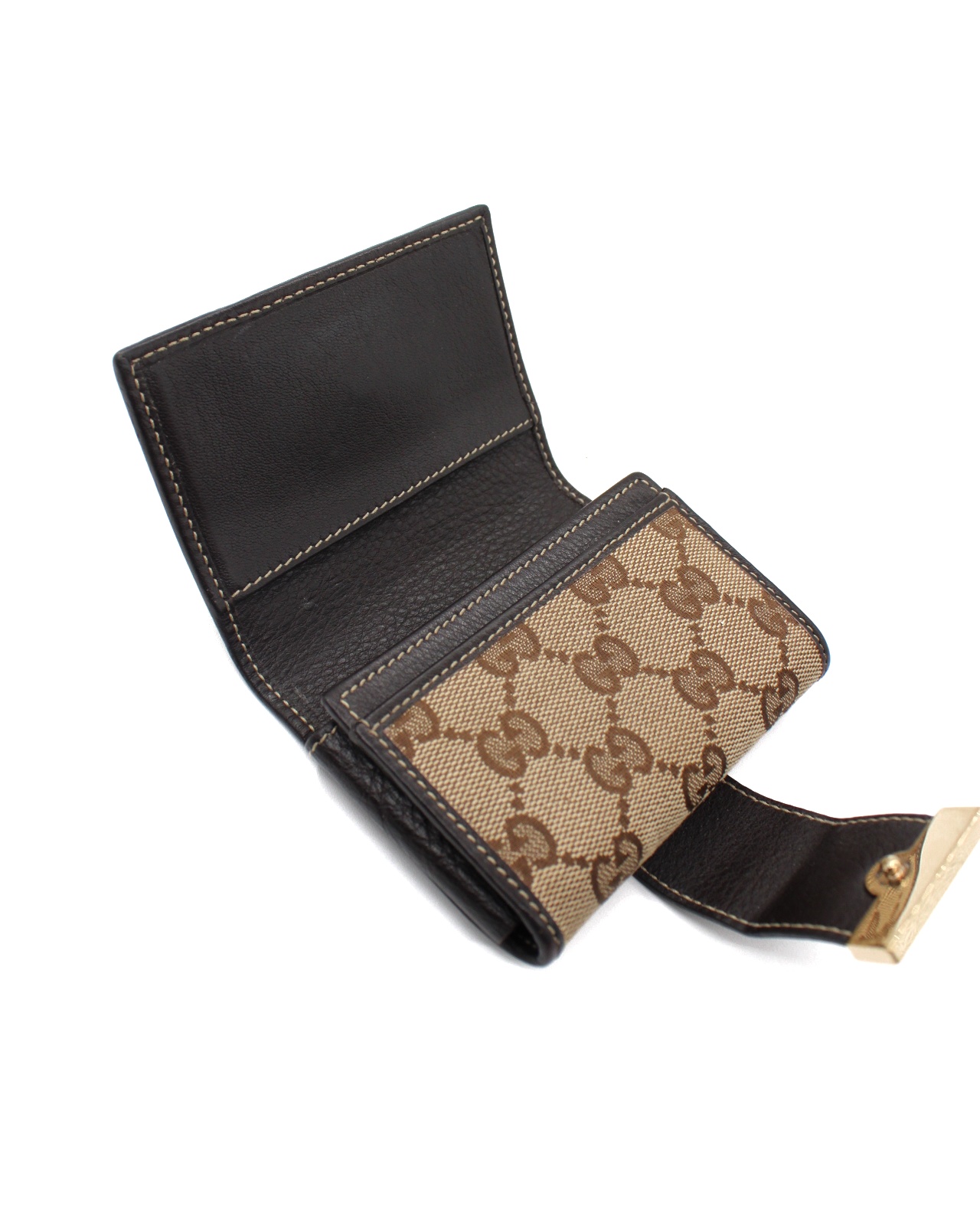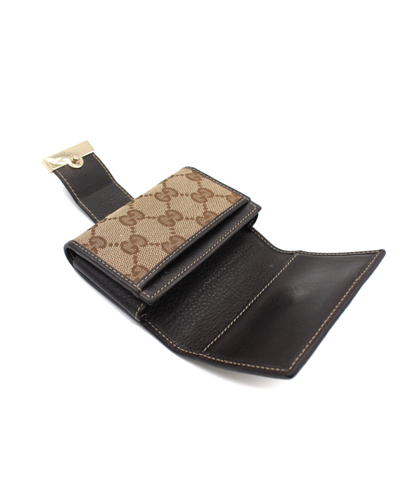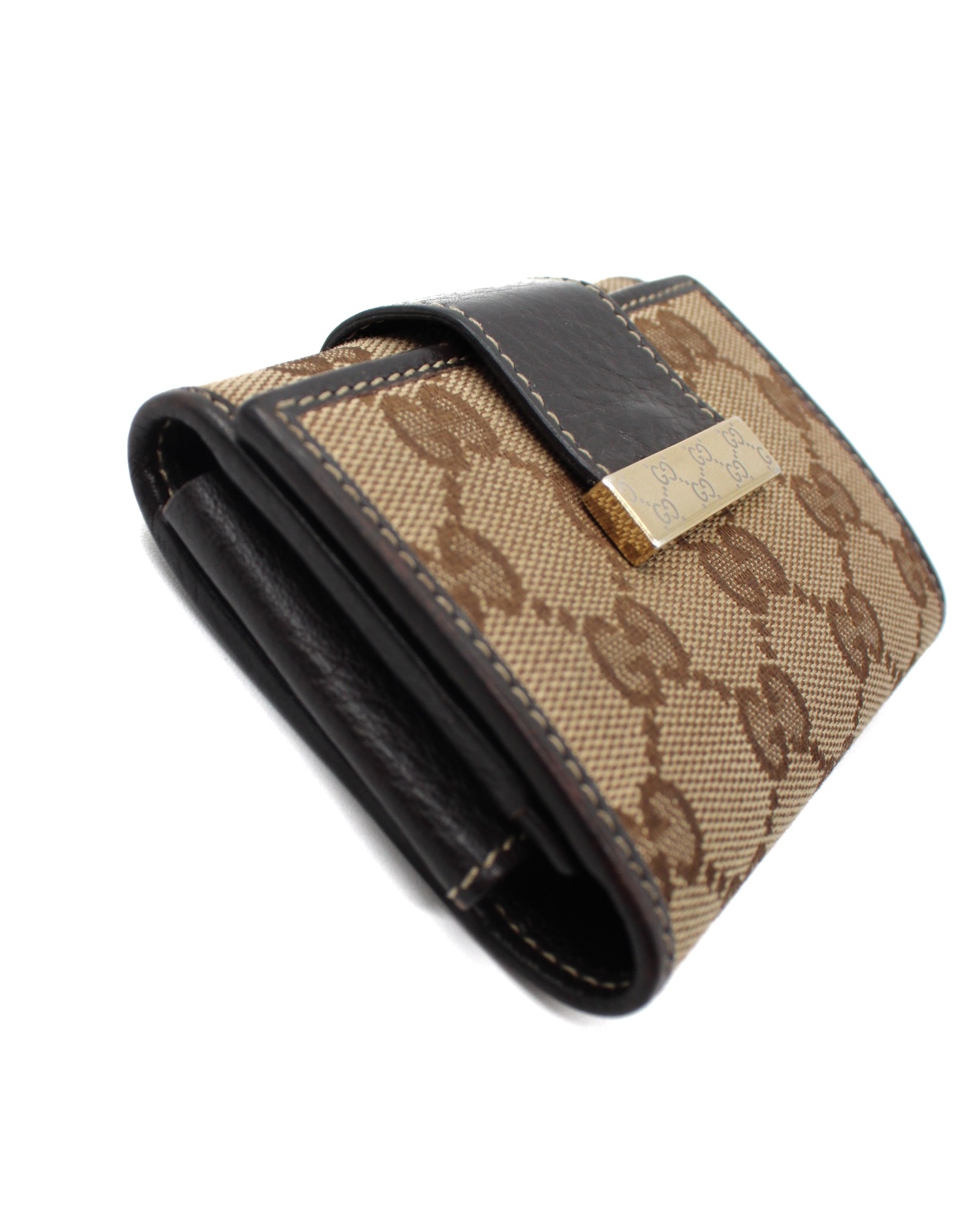Portafoglio Gucci in tessuto gg e pelle testa di moro . Misure L10xA8,5xP3 cm. Chiusura con bottone . Dotato di due scomparti piatti ed uno scomparto ampio. Articolo in ottime condizioni completo di dust.
