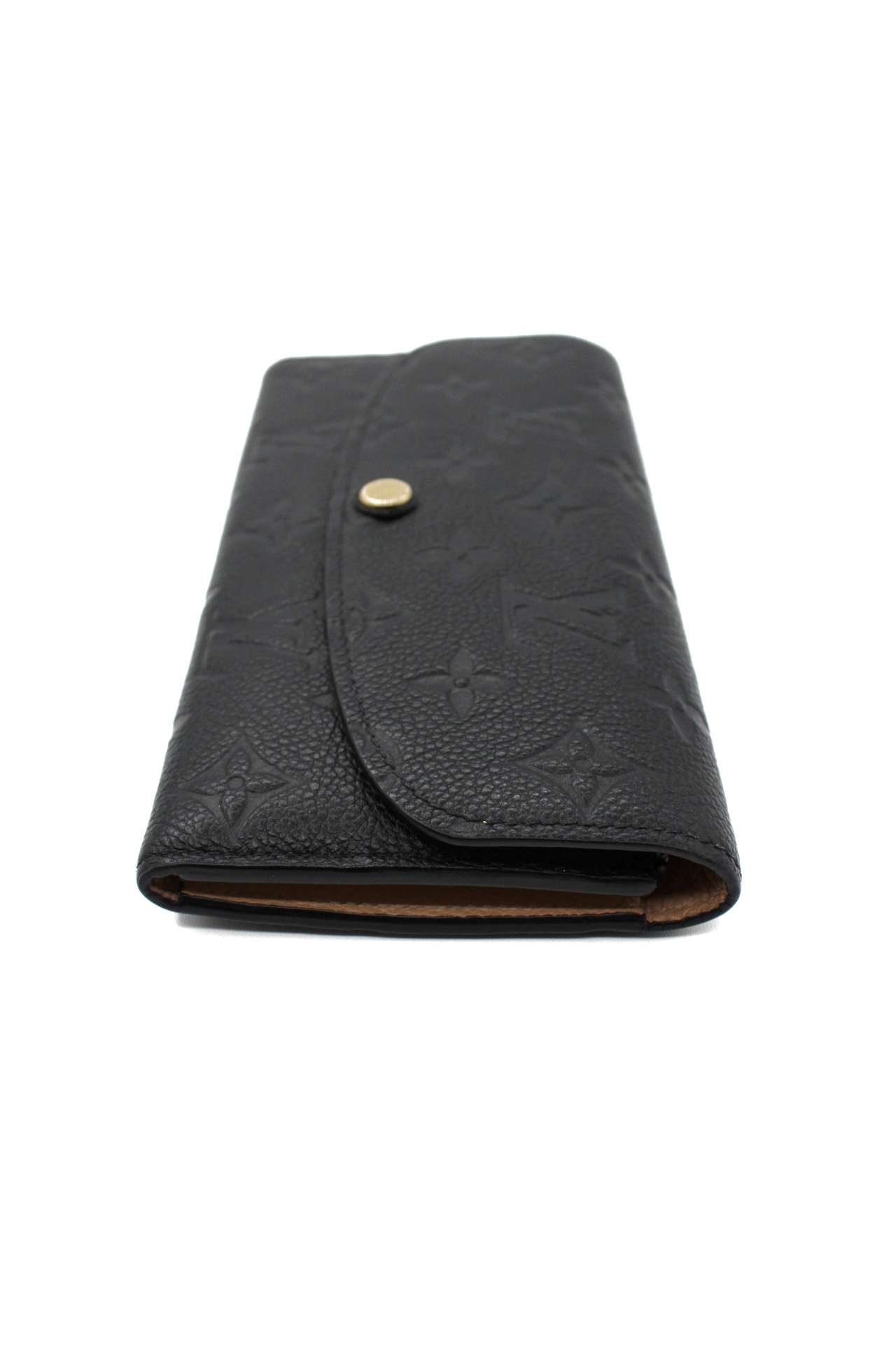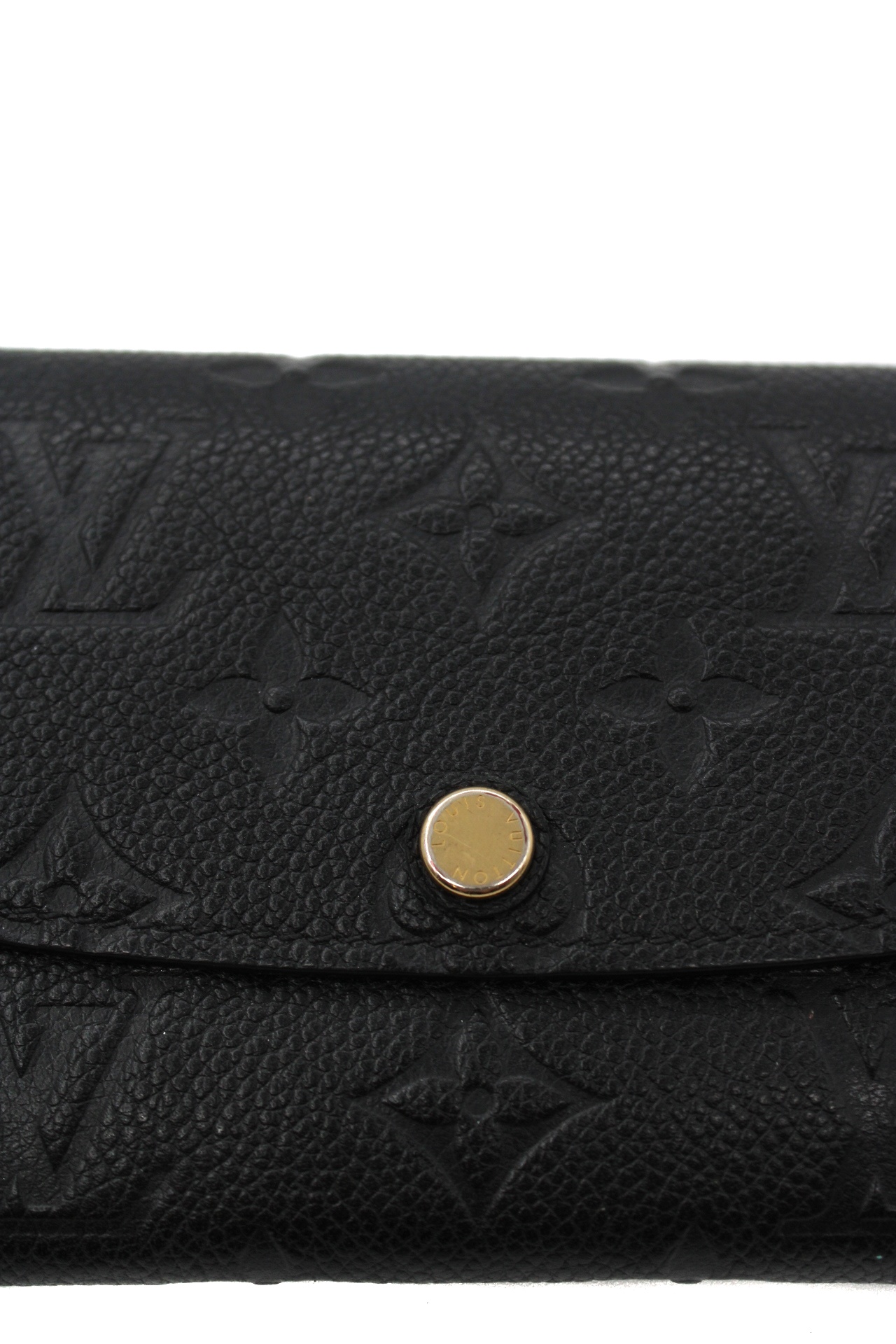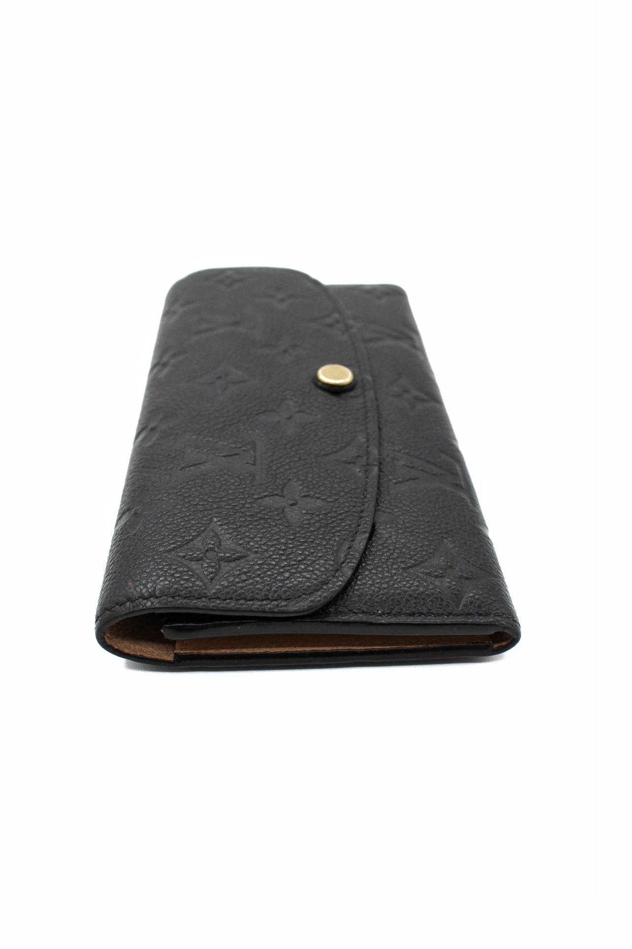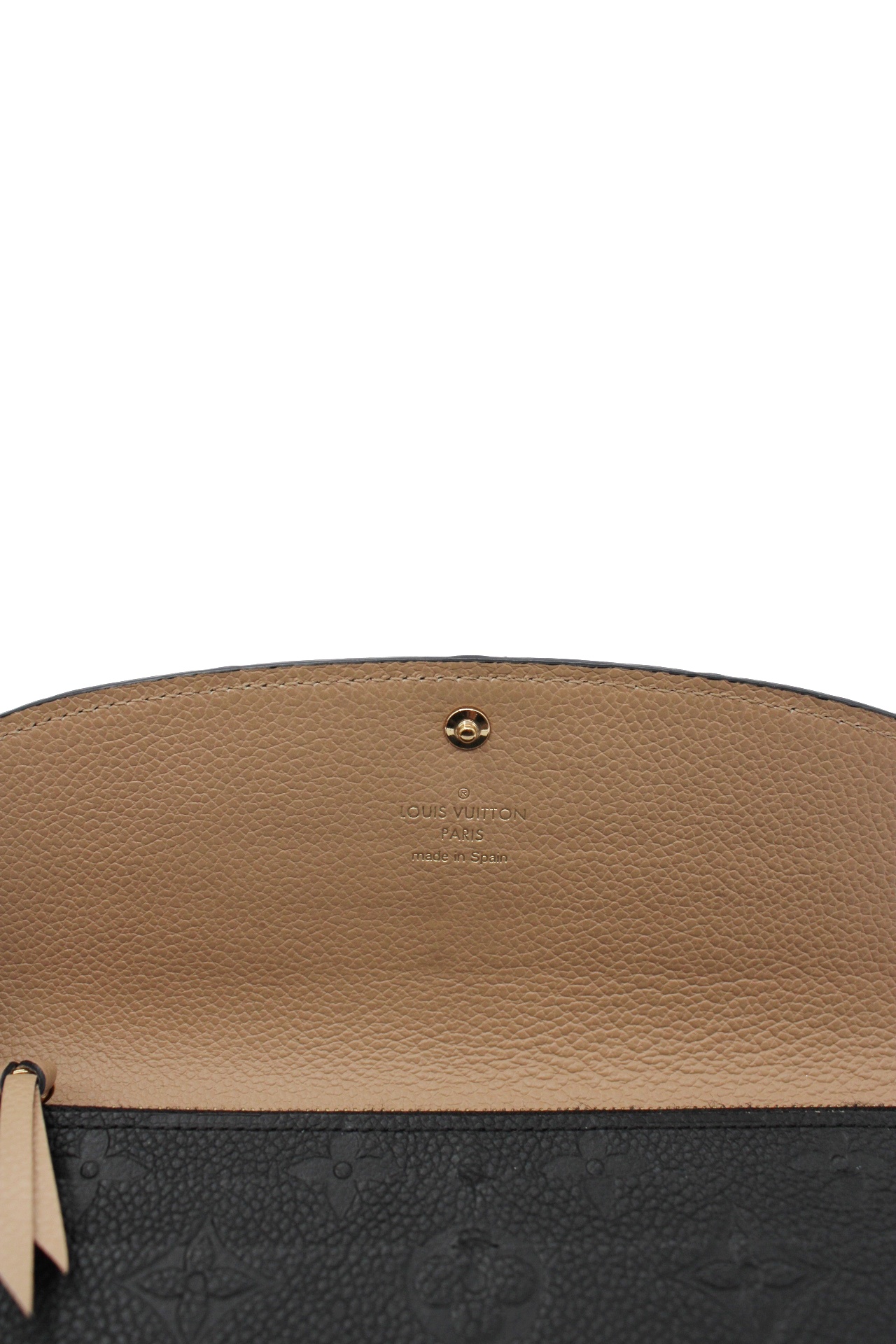 Portafoglio Louis Vuitton Emilie in pelle empreinte nero e interno beige . Dotato di due scomparti interni per documenti d'identità e ricevute varie , 4 fessure per carte , una tasca con zip per banconote. Misure L19xA10xP2 cm . Articolo in ottime condizioni completo di scatola