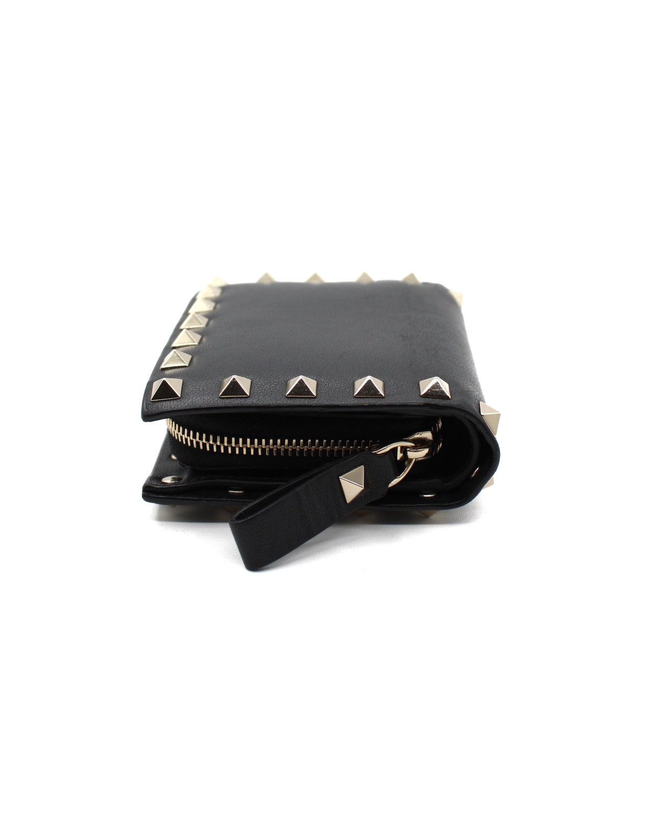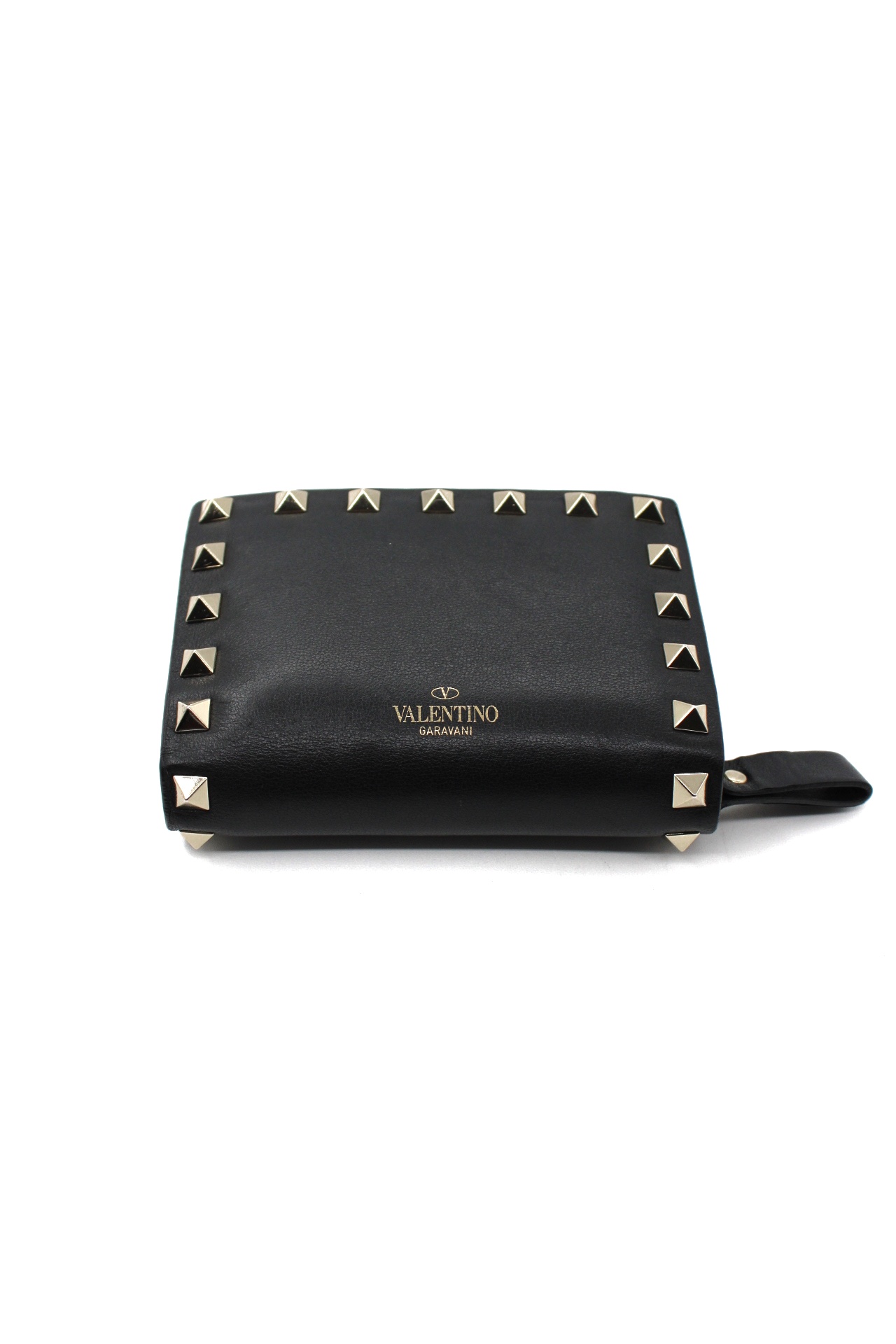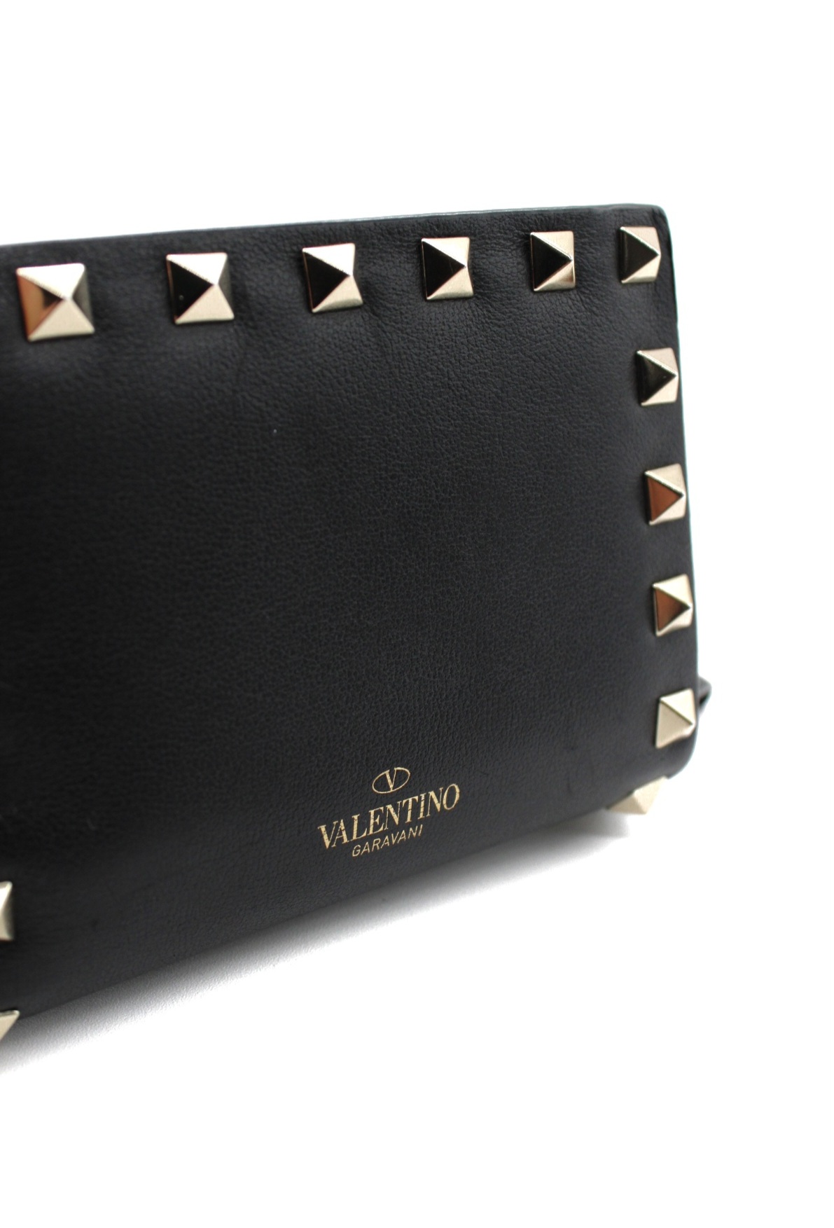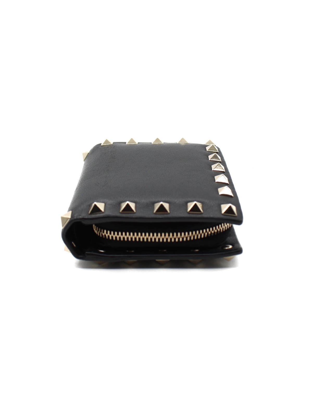 Portafoglio Valentino Rockstud in pelle di vitello nero e hardware dorato. Dotato di 5 fessure per carte , una tasca piatta per banconote ed un portamonete con zip. Articolo in ottime condizioni completo di dust e cartellini.