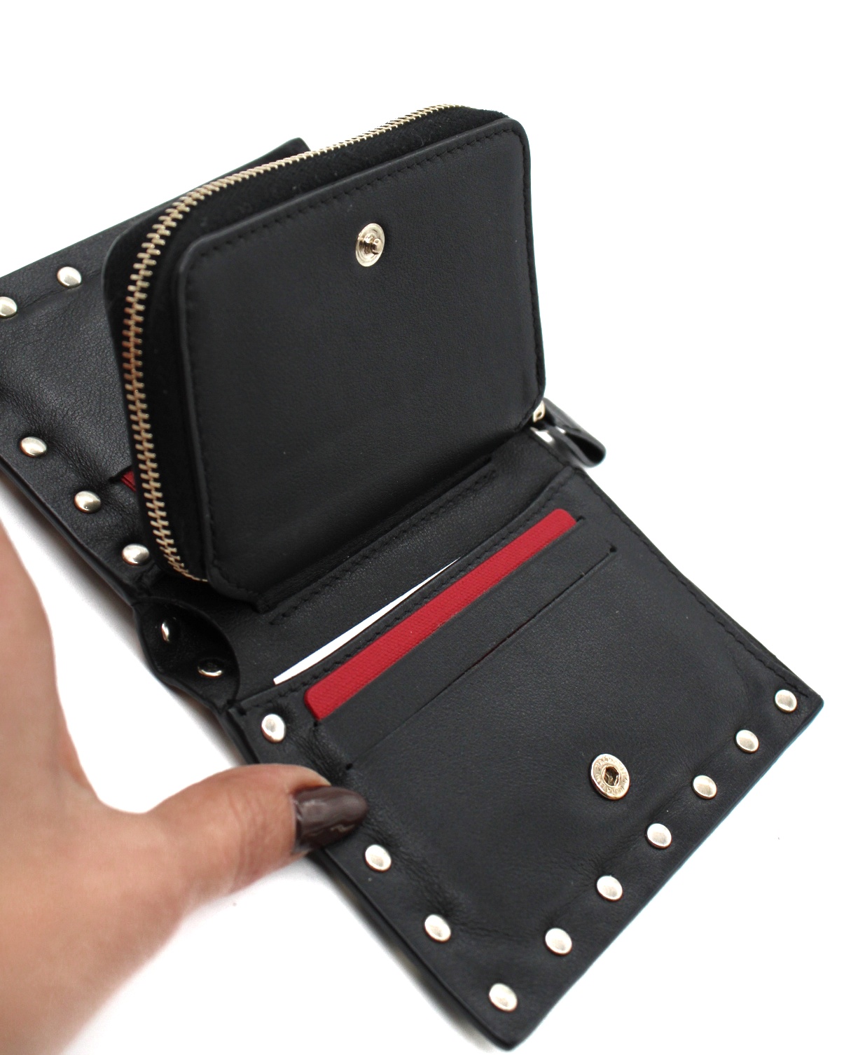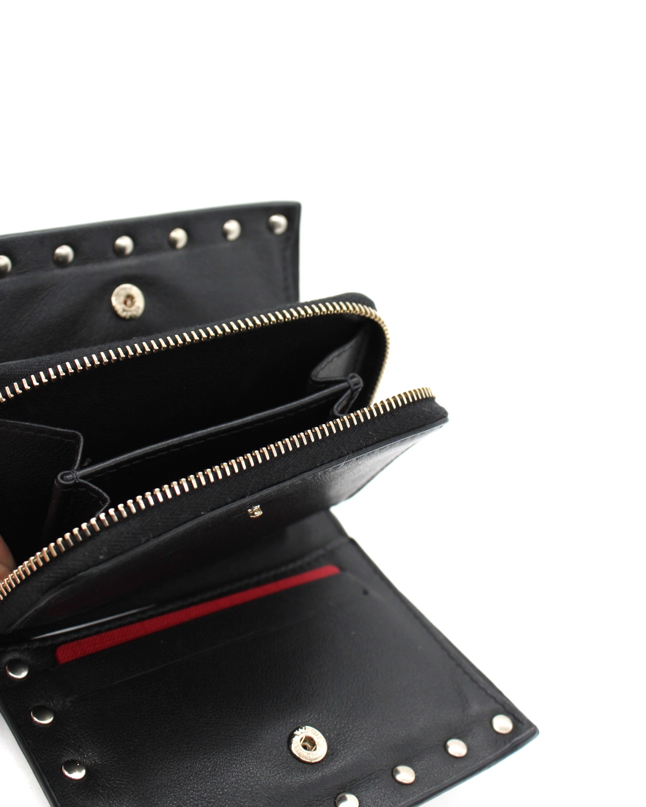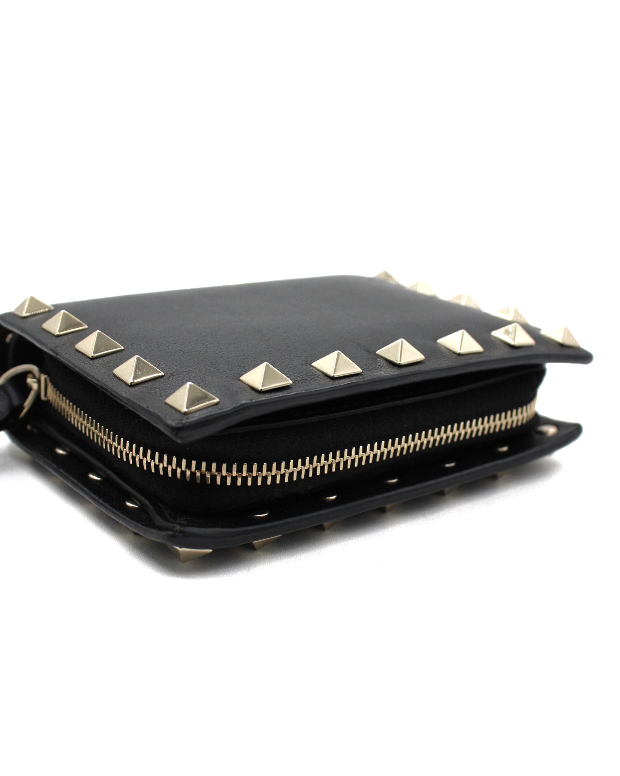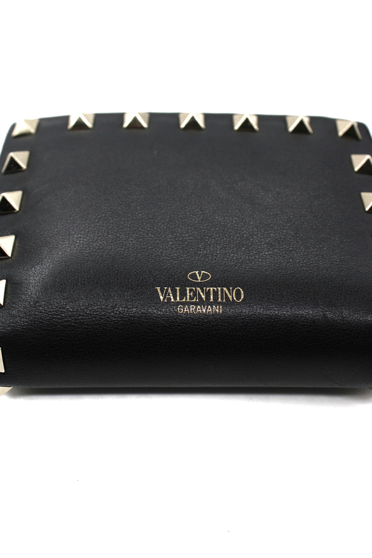 Portafoglio Valentino Rockstud in pelle di vitello nero e hardware dorato. Dotato di 5 fessure per carte , una tasca piatta per banconote ed un portamonete con zip. Articolo in ottime condizioni completo di dust e cartellini.