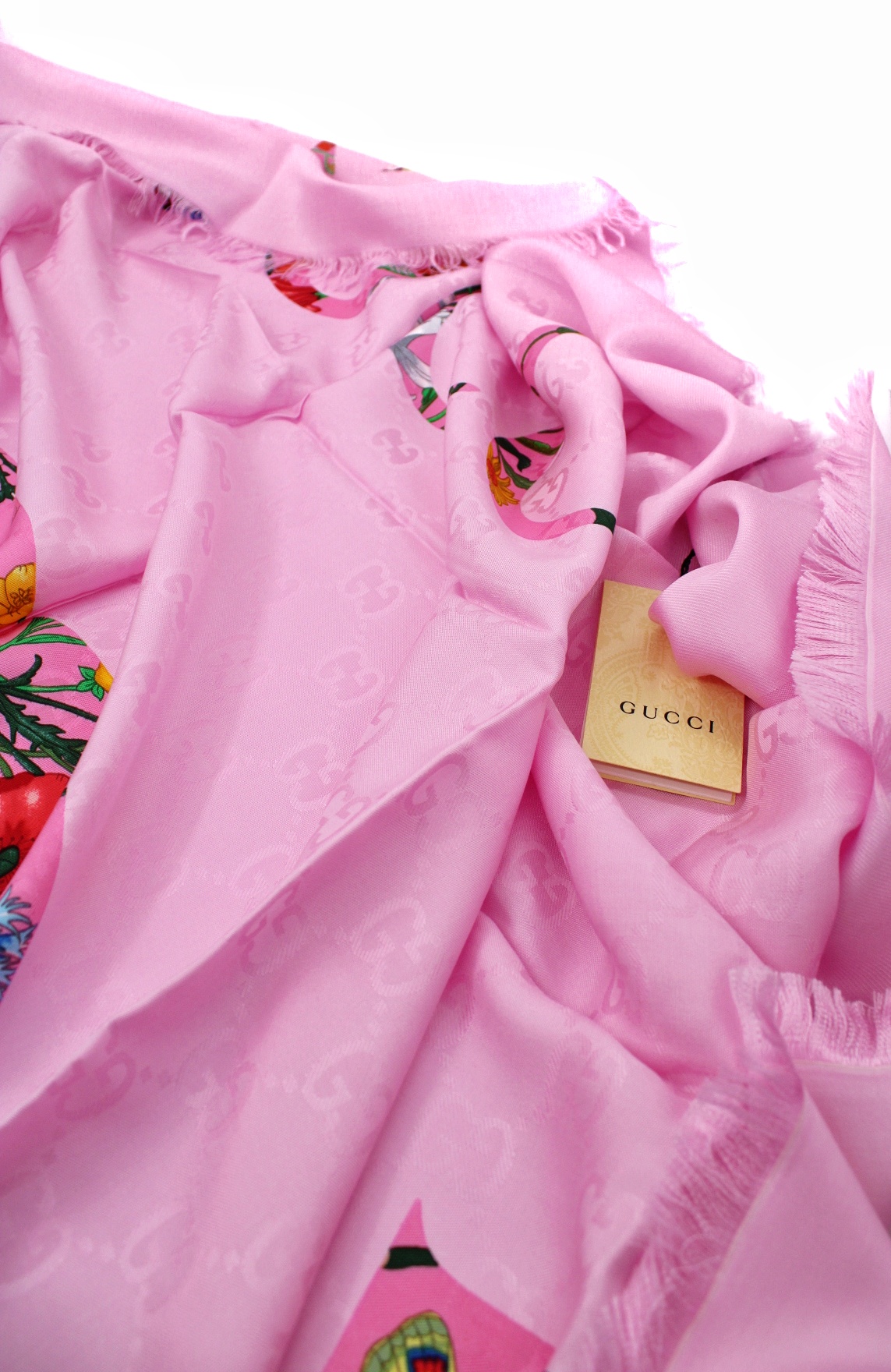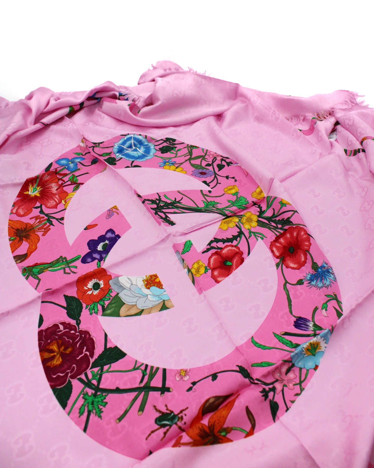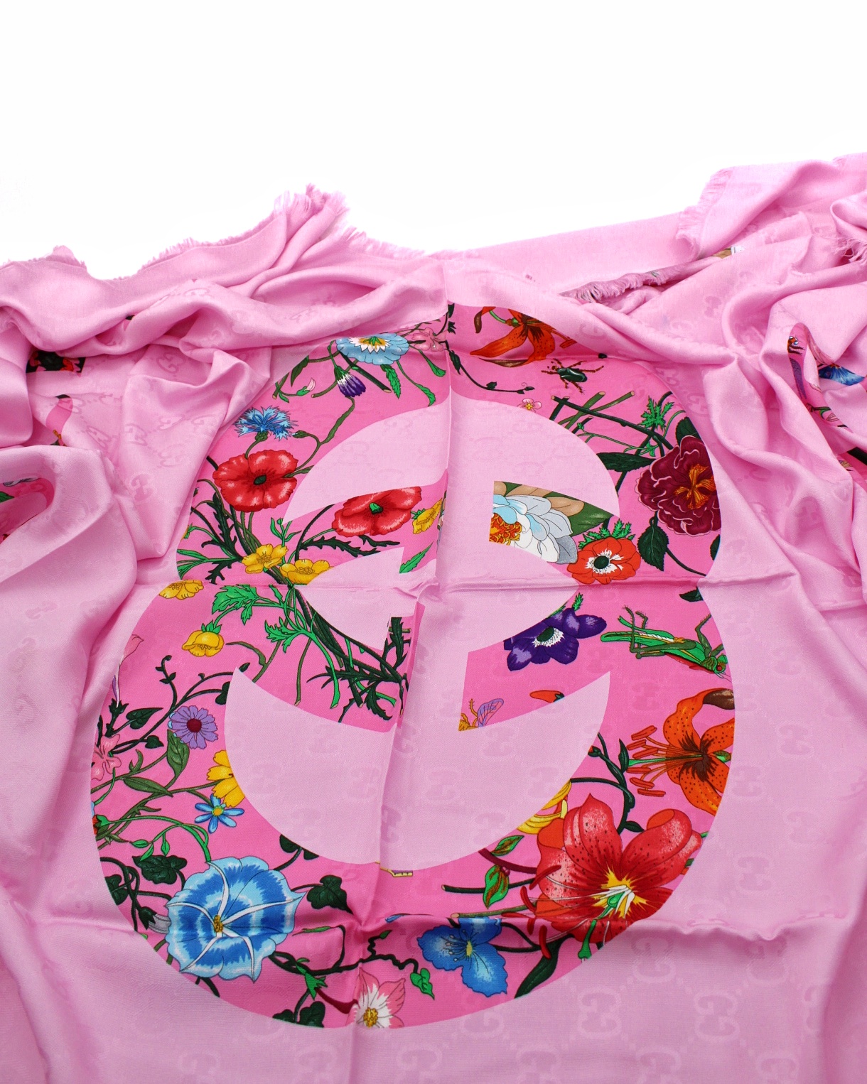 Scialle Gucci Flora rosa con motivo GG. Misure 140x140 , composizione 70% modal 24% viscosa e 6% seta. Articolo pari al nuovo completo di dust e cartellini.