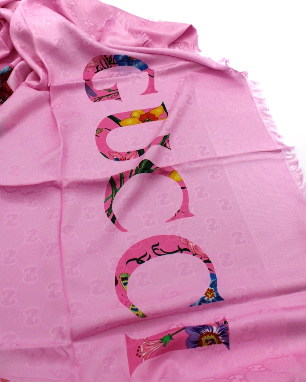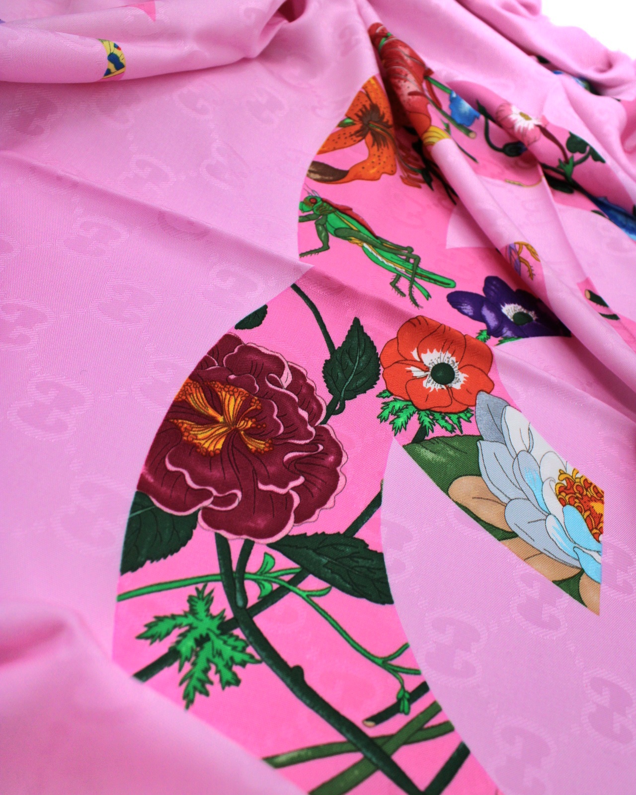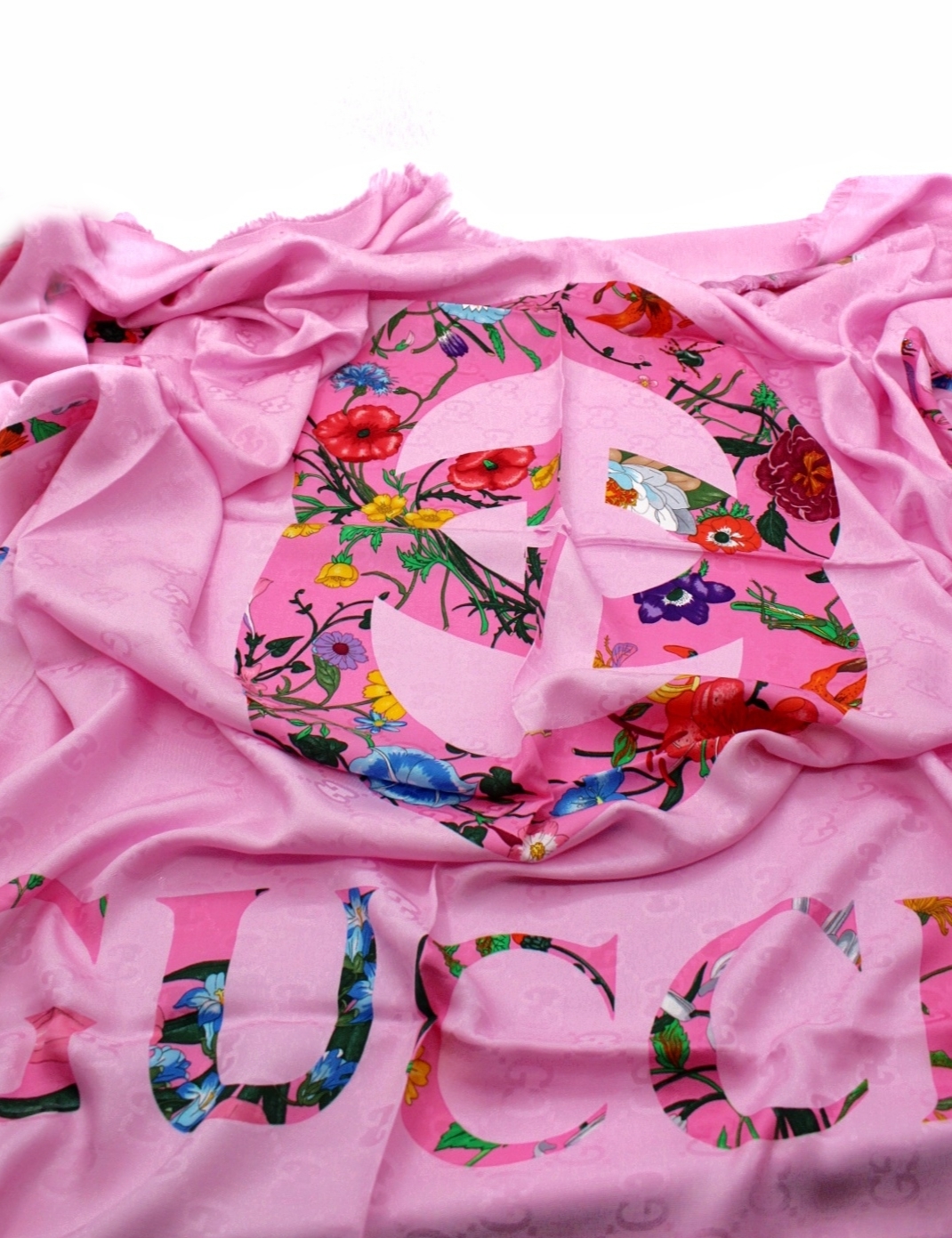 Scialle Gucci Flora rosa con motivo GG. Misure 140x140 , composizione 70% modal 24% viscosa e 6% seta. Articolo pari al nuovo completo di dust e cartellini.