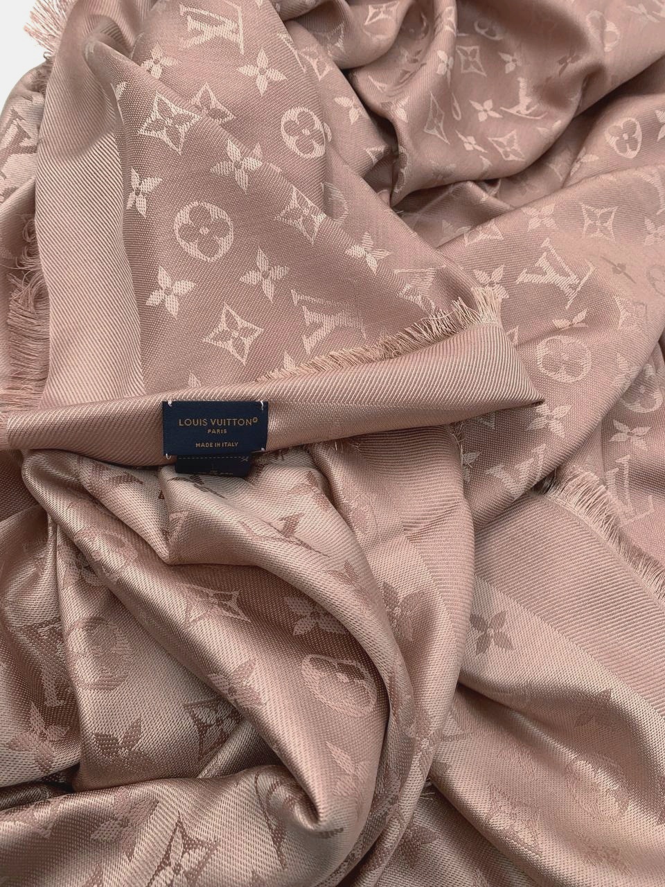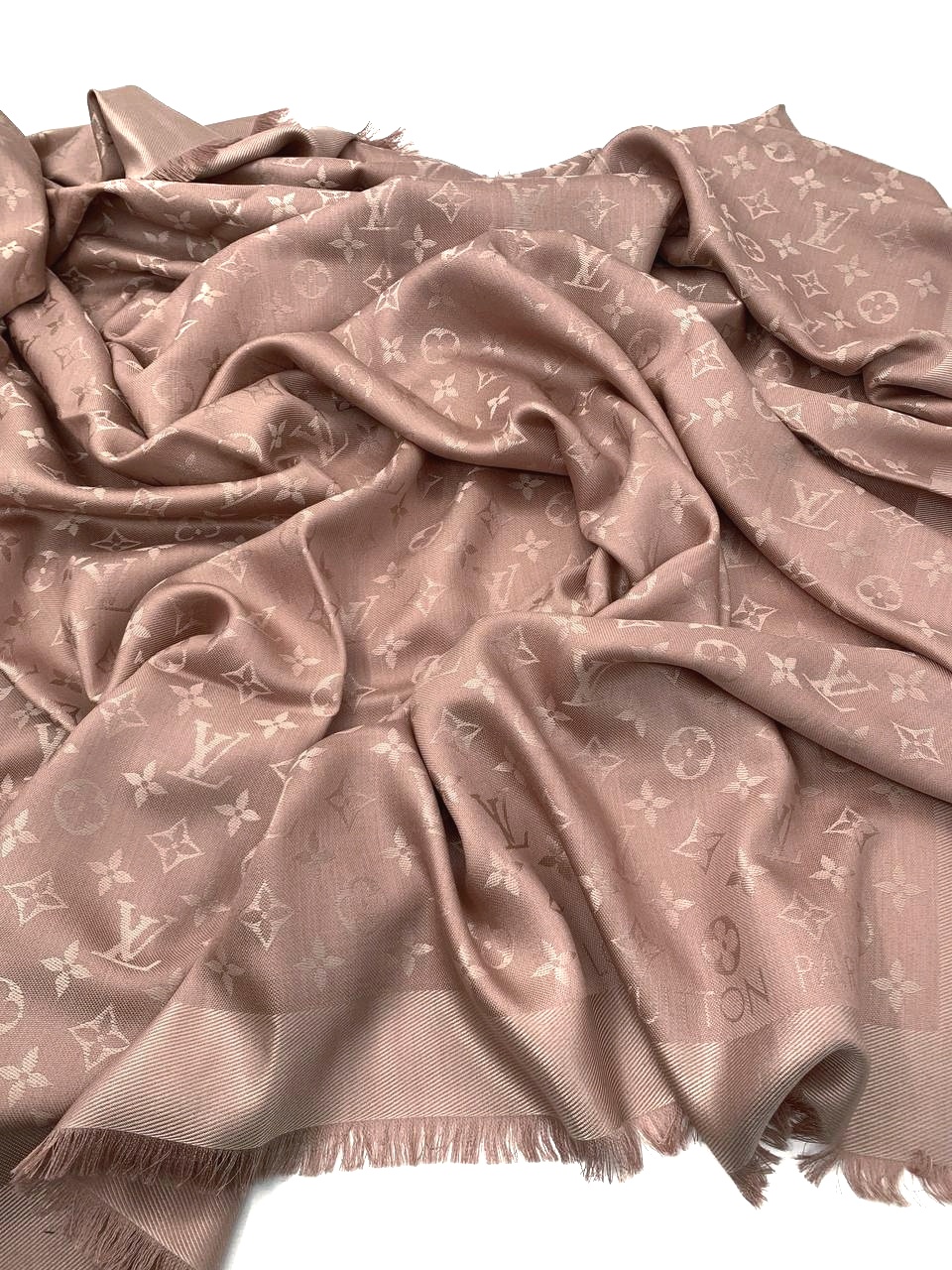 Scialle Louis Vuitton monogram rosa . Materiale 60% seta e 40% lana. Misure 142,5x142,5 cm. Articolo in condizioni eccellenti completo di dust Très Chic.