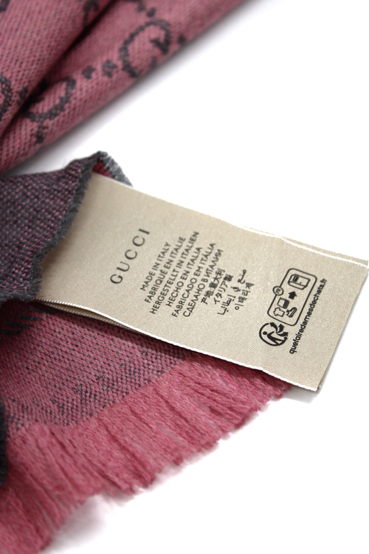 Sciarpa Gucci con motivo GG jacquard rosa realizzata in lana grafite. Presenta bordi sfrangiati.