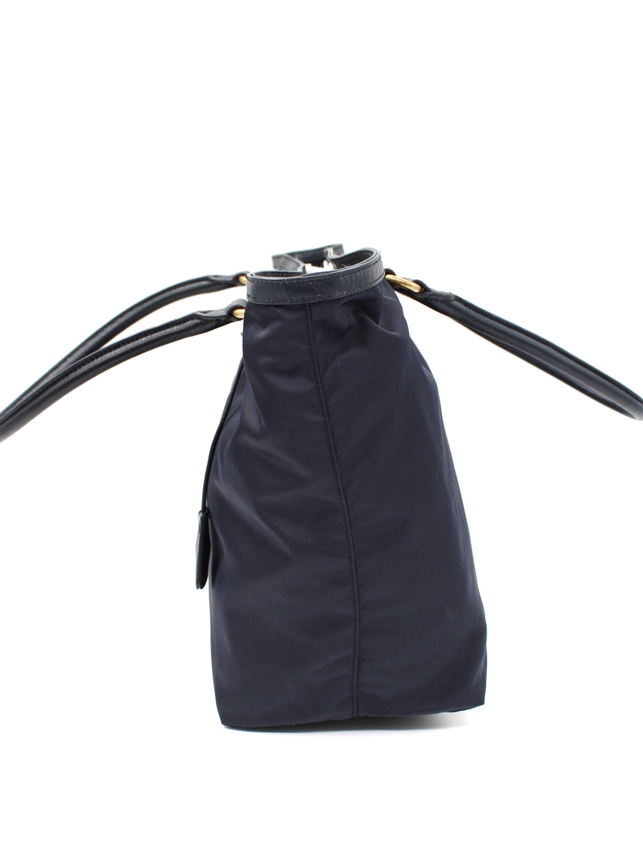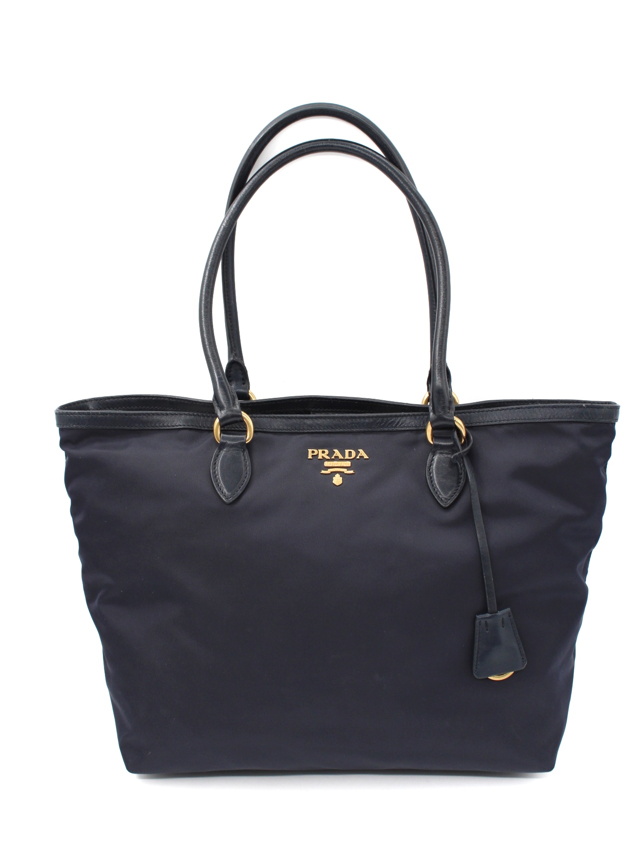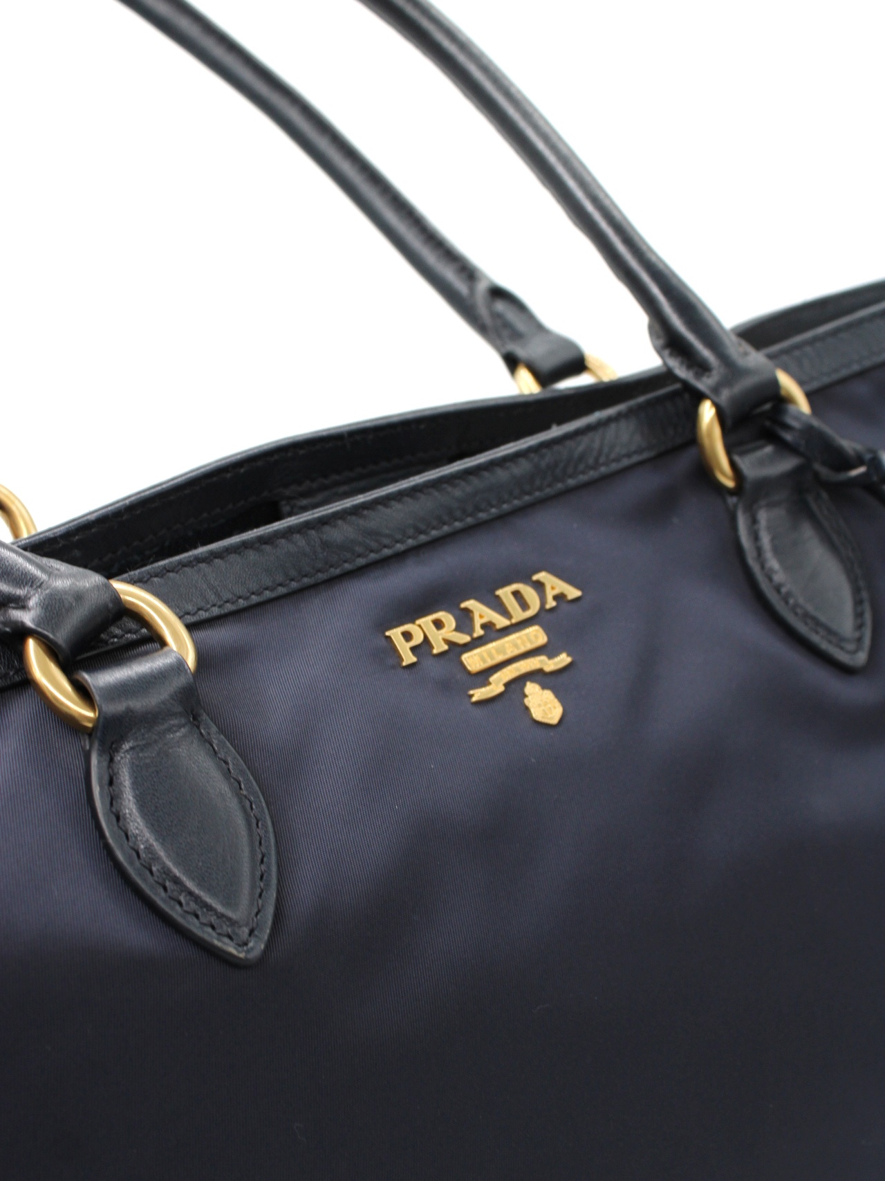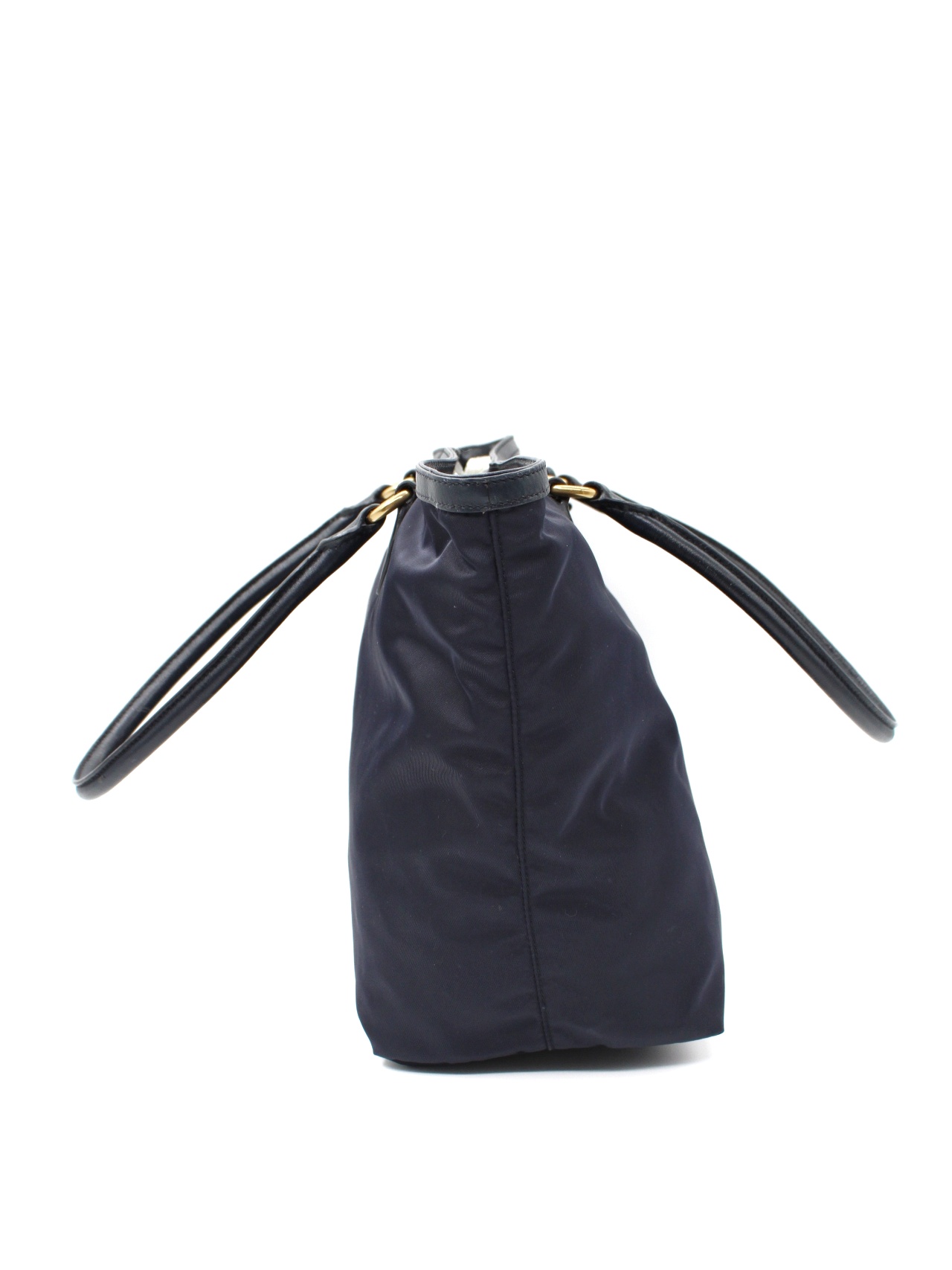 Shopper Prada in tela vela blu con parti metalliche dorate. Da portare a spalla questa borsa è perfetta per tutti i giorni con outfit casual. Articolo in condizioni eccellenti corredato di dust très chic.