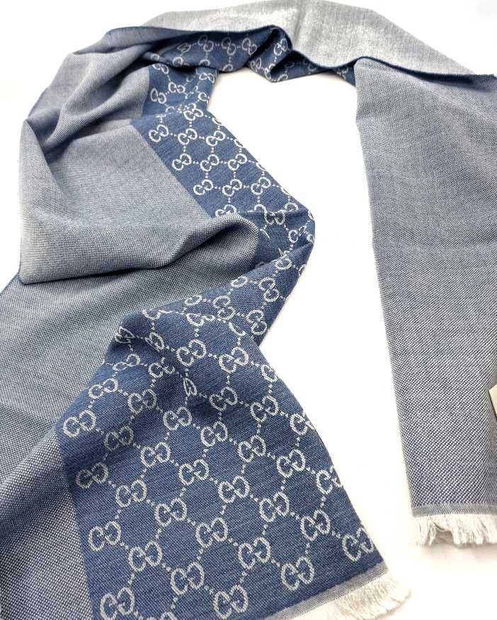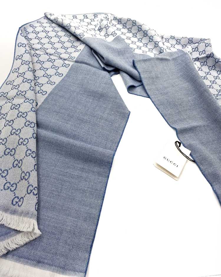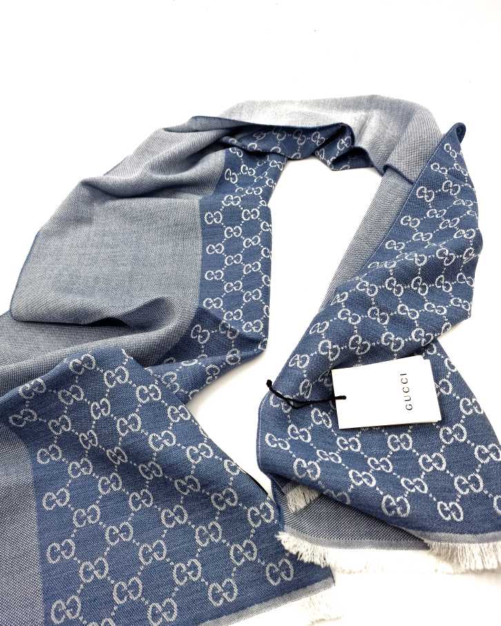 Stola Gucci GG in lana celeste . Misure 40x180 cm . Articolo pari al nuovo completo di cartellini e dust bag.