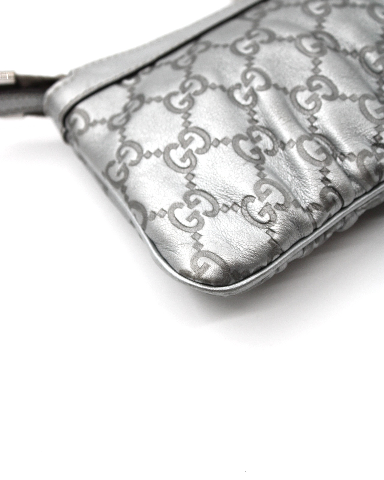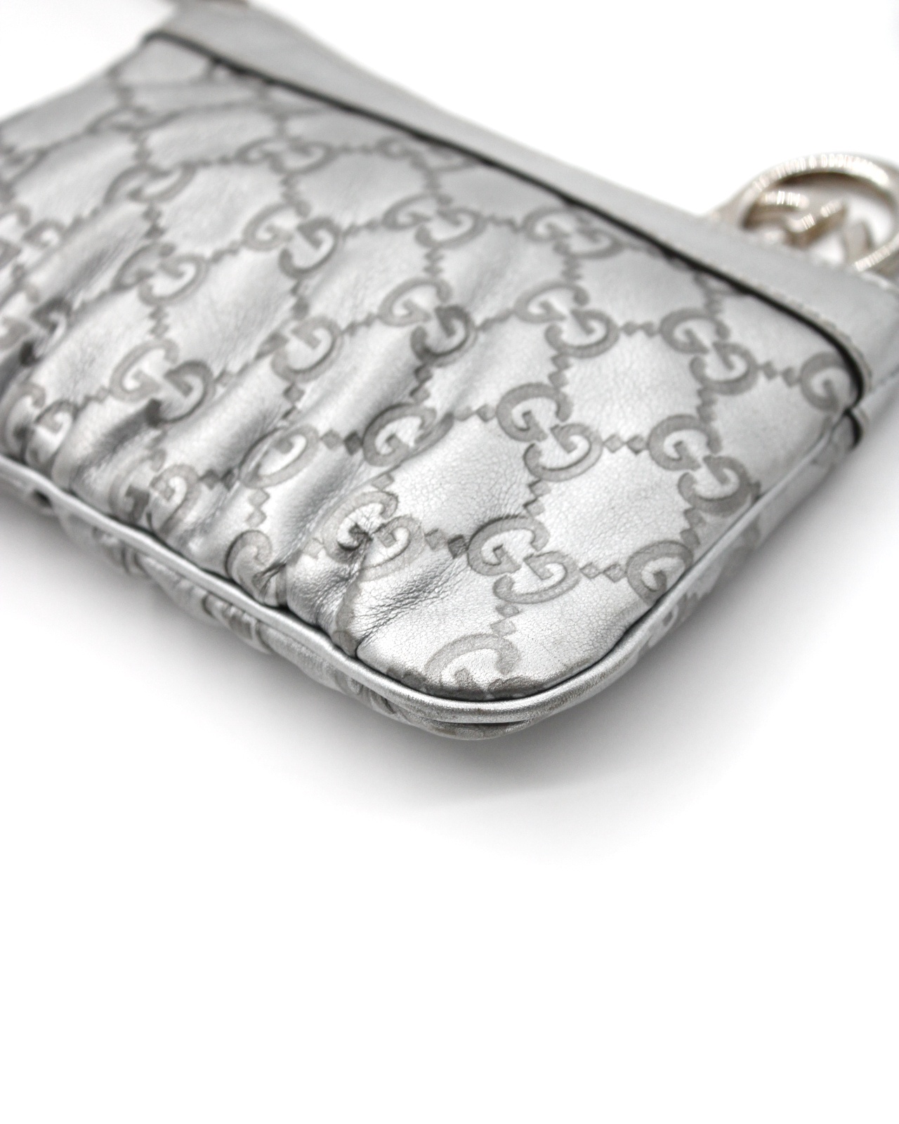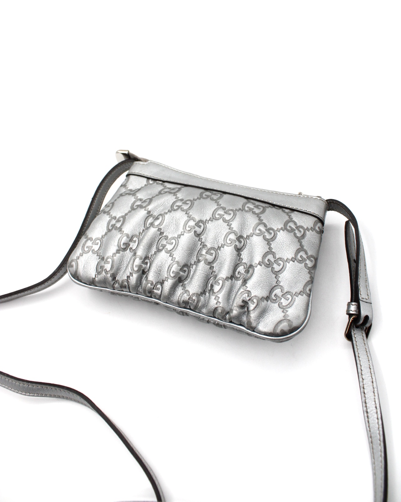Tracolla Gucci in pelle Guccissima argentata con parti metalliche argento. Da portare a spalla è perfetta per svariate occasioni. Articolo in condizioni eccellenti con scatola