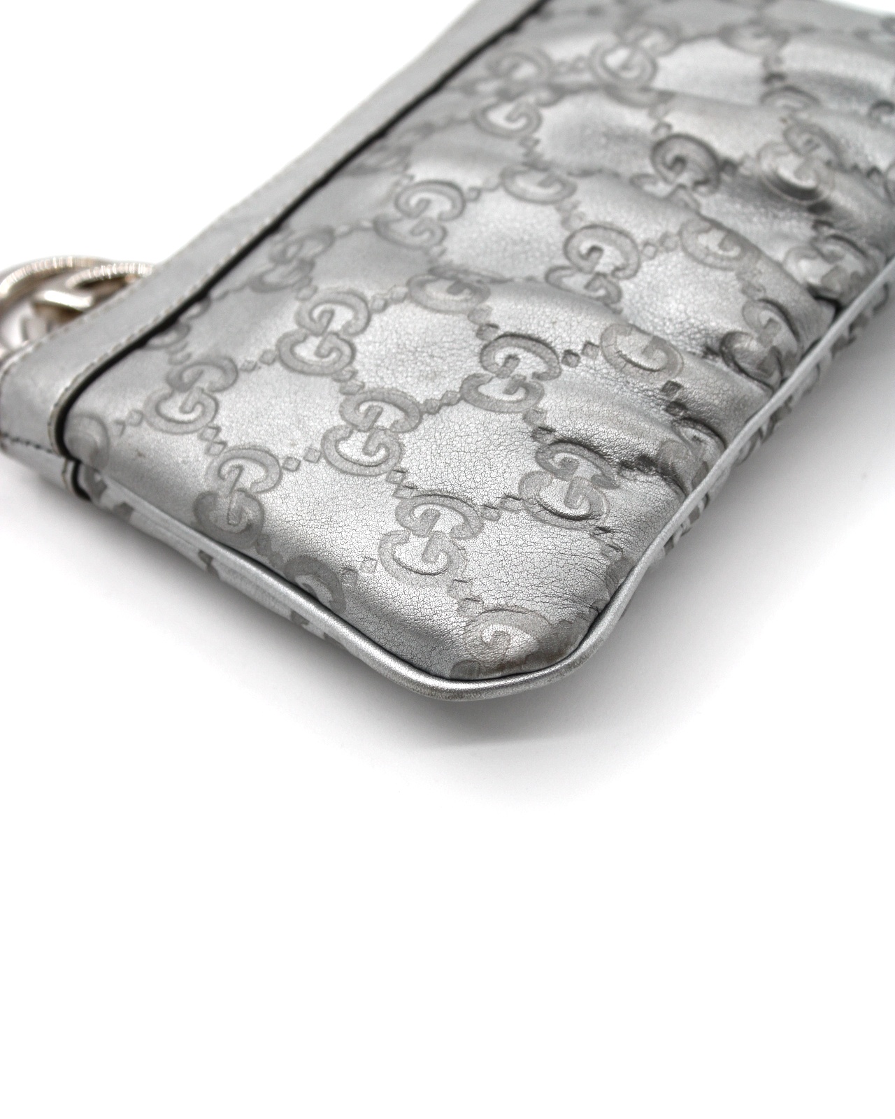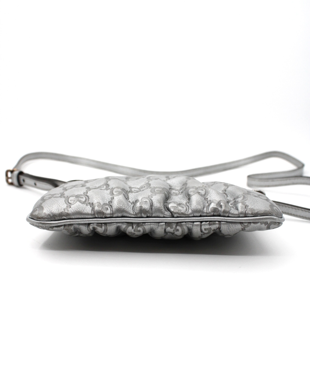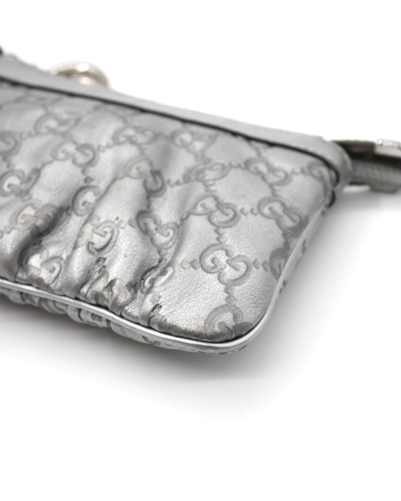 Tracolla Gucci in pelle Guccissima argentata con parti metalliche argento. Da portare a spalla è perfetta per svariate occasioni. Articolo in condizioni eccellenti con scatola