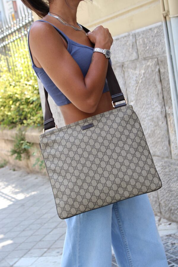 Tracolla Gucci in Tela GG Supreme e insetti in Pelle Testa di Moro da portare a spalla questa borsa è perfetta per tutti i giorni. Articolo in ottime condizioni corredato di cartellini.