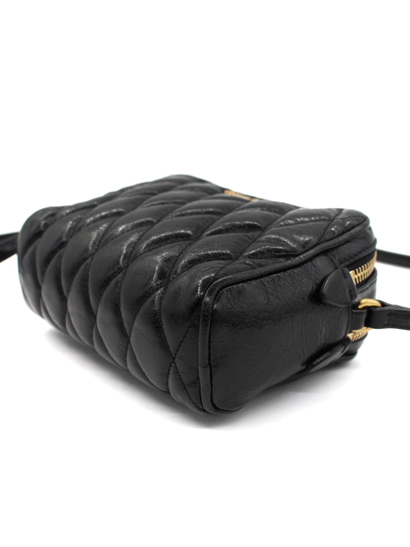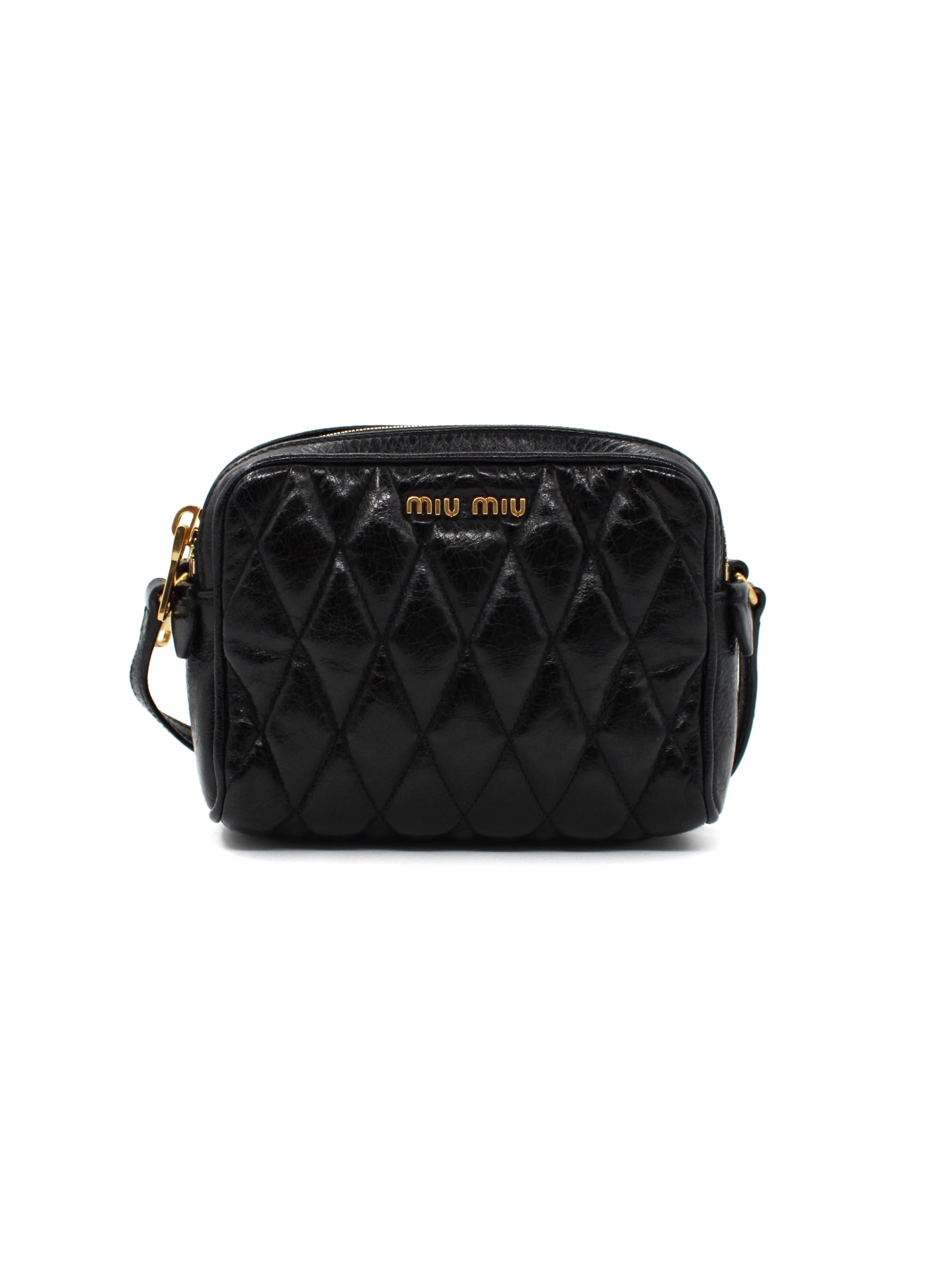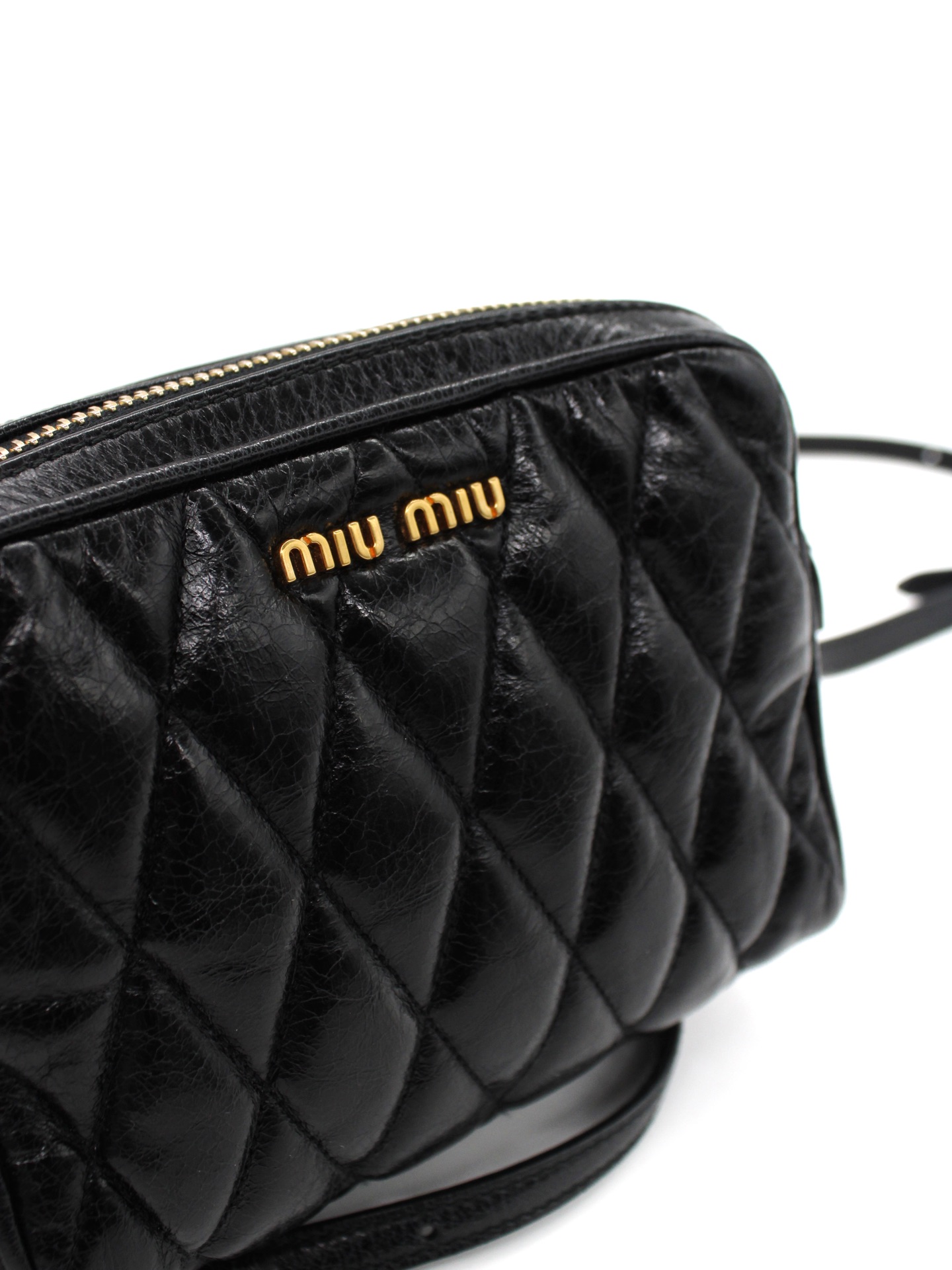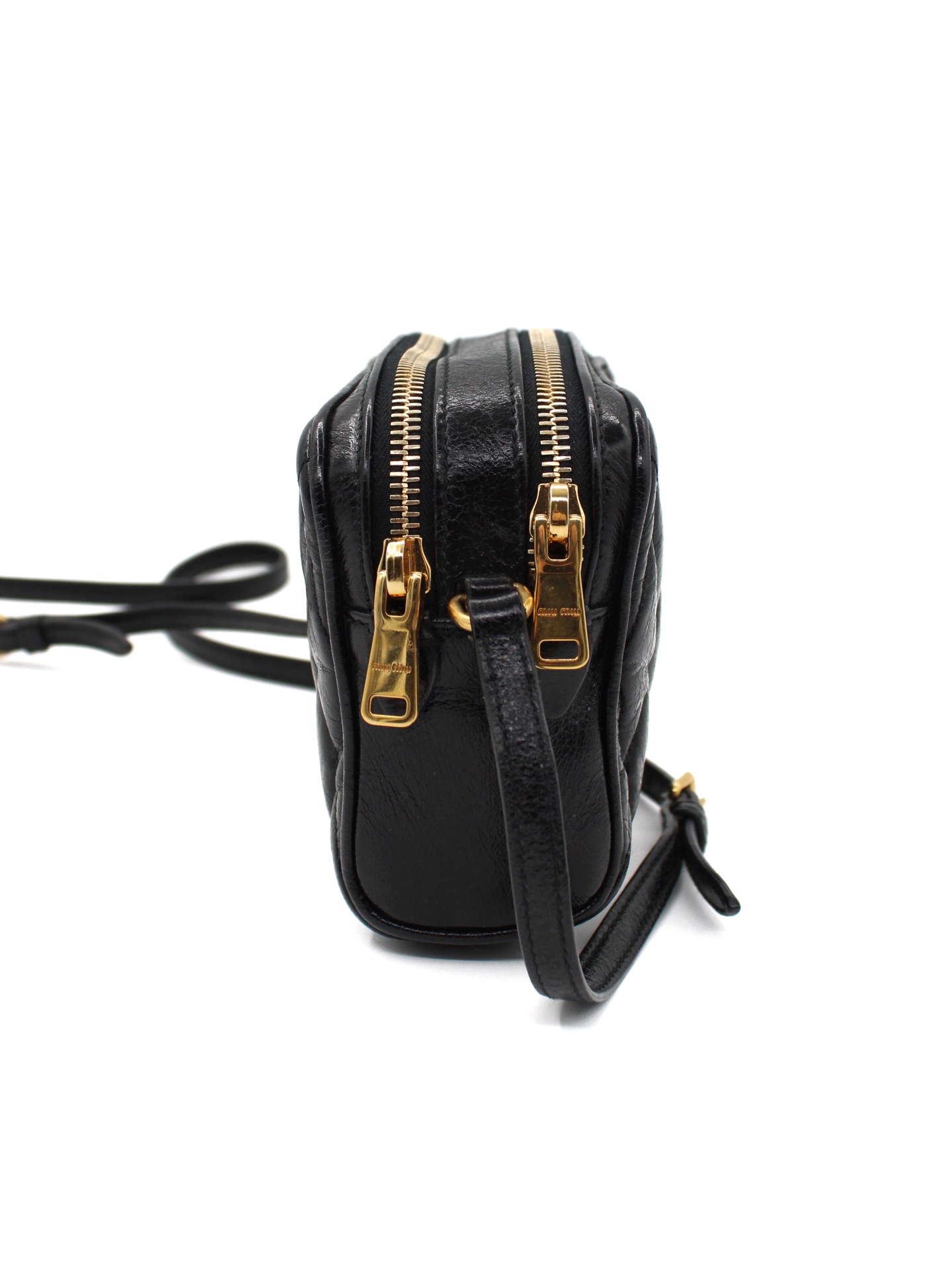 Tracolla Miu Miu in Pelle Nera Matelassé con parti metalliche dorate. Da portare ad incrocio grazie alla sua tracolla regolabile questa borsa si abbina a svariati tipi di outfit. Articolo in condizioni eccellenti corredato di dust bag.