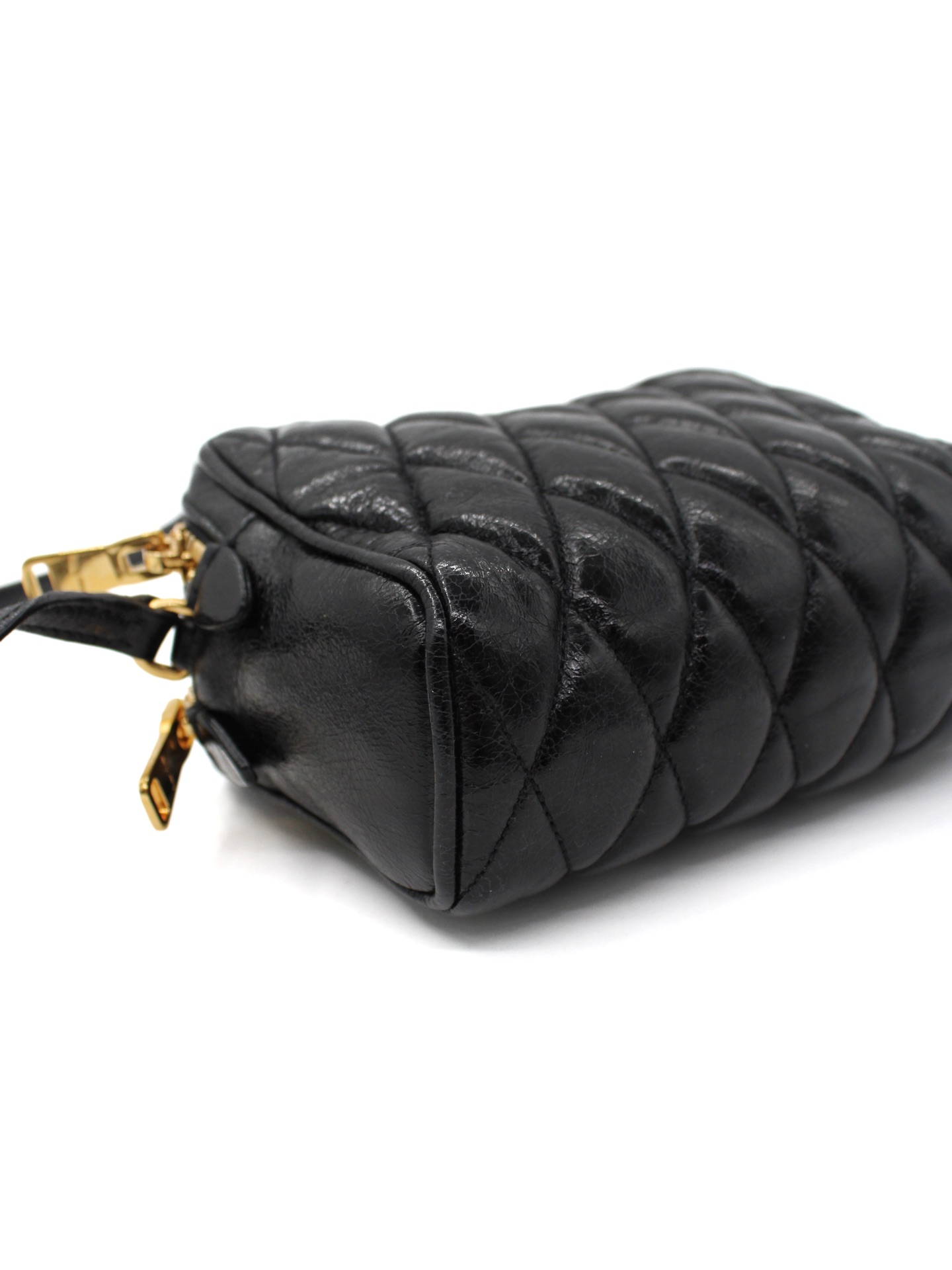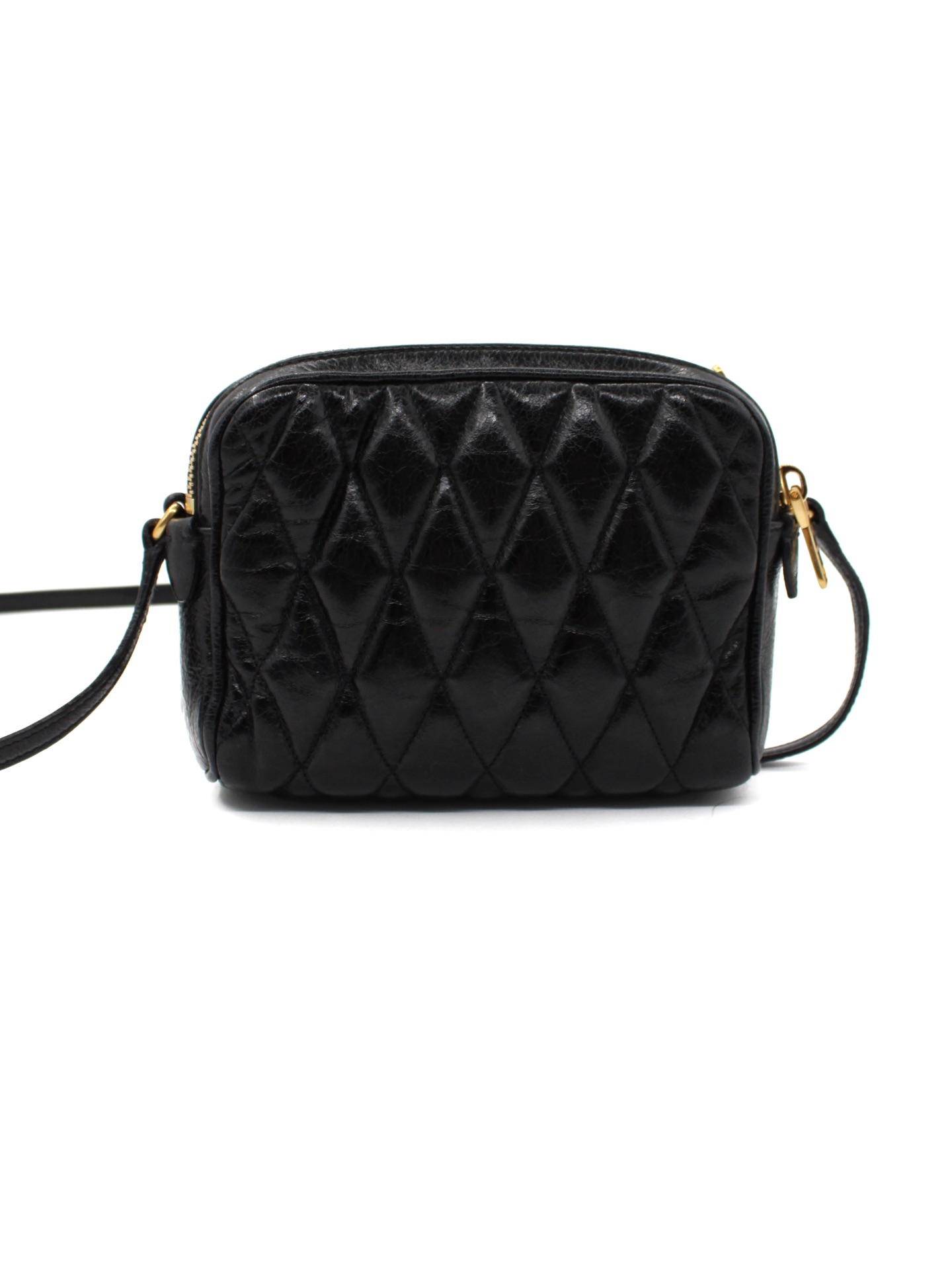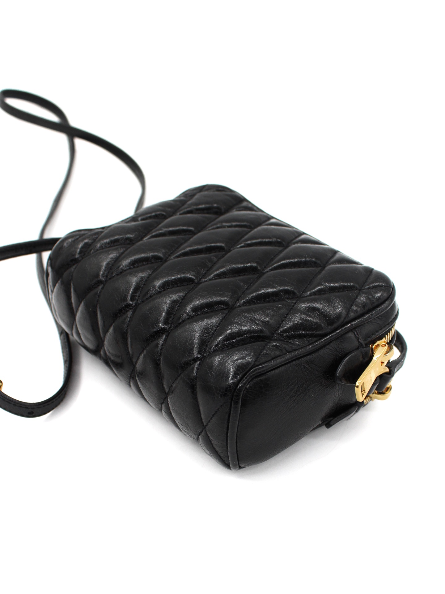 Tracolla Miu Miu in Pelle Nera Matelassé con parti metalliche dorate. Da portare ad incrocio grazie alla sua tracolla regolabile questa borsa si abbina a svariati tipi di outfit. Articolo in condizioni eccellenti corredato di dust bag.