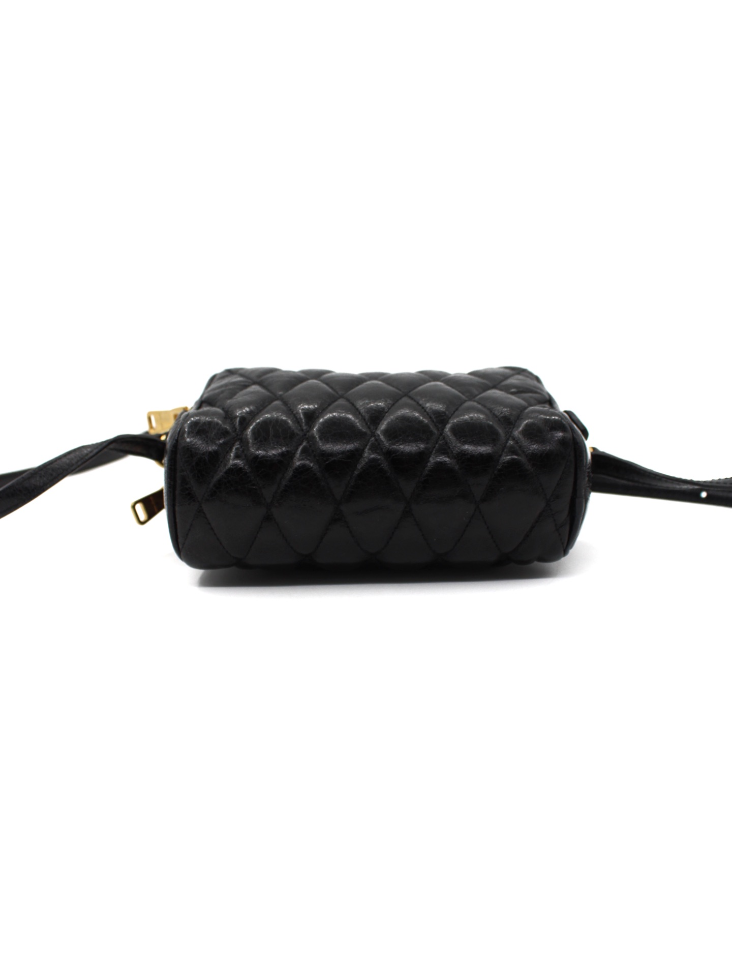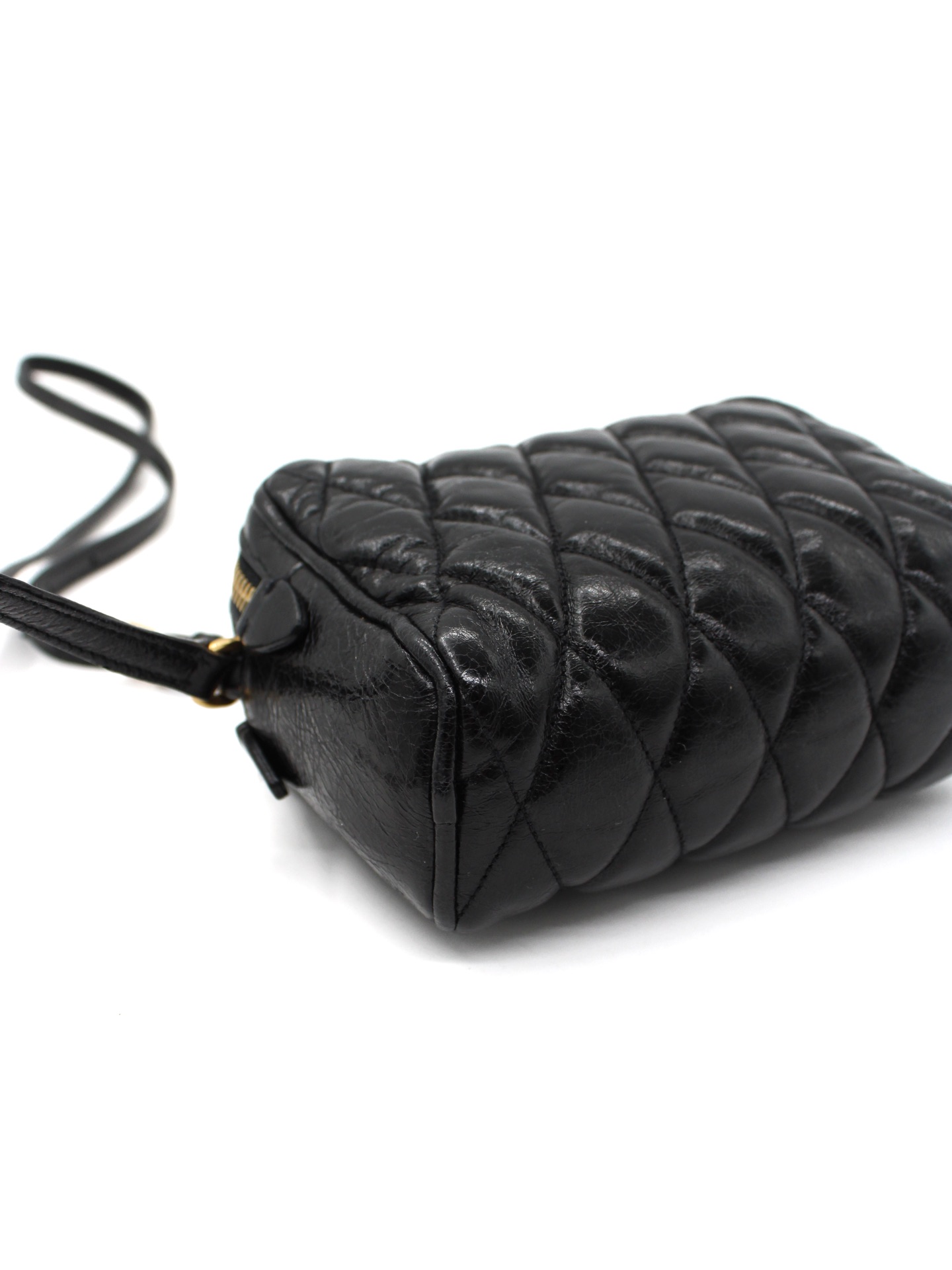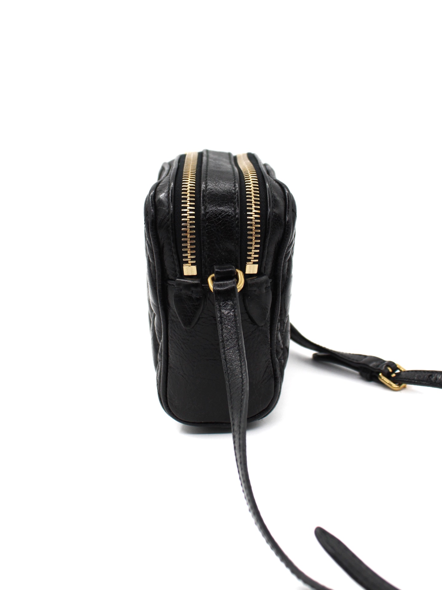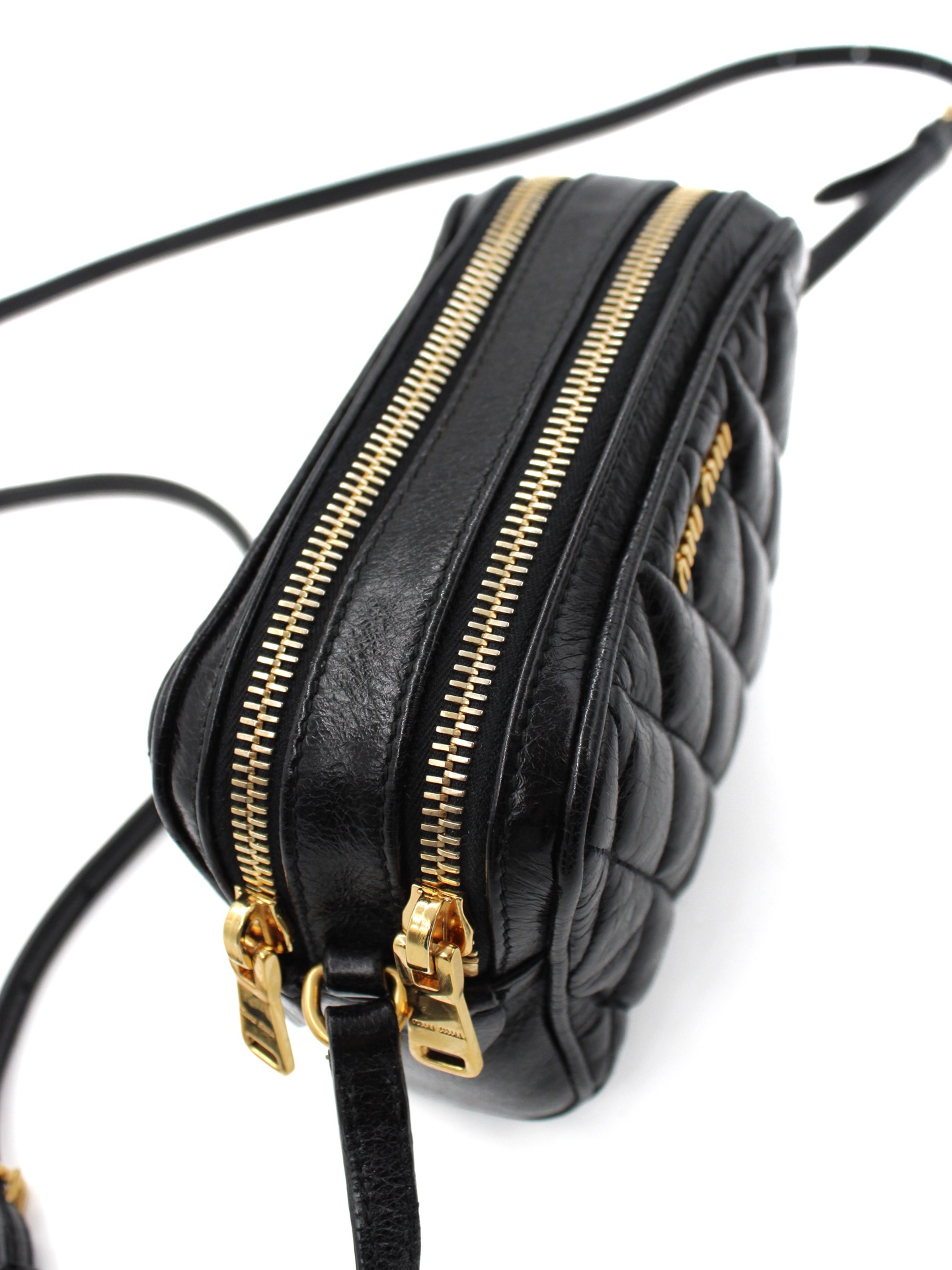 Tracolla Miu Miu in Pelle Nera Matelassé con parti metalliche dorate. Da portare ad incrocio grazie alla sua tracolla regolabile questa borsa si abbina a svariati tipi di outfit. Articolo in condizioni eccellenti corredato di dust bag.